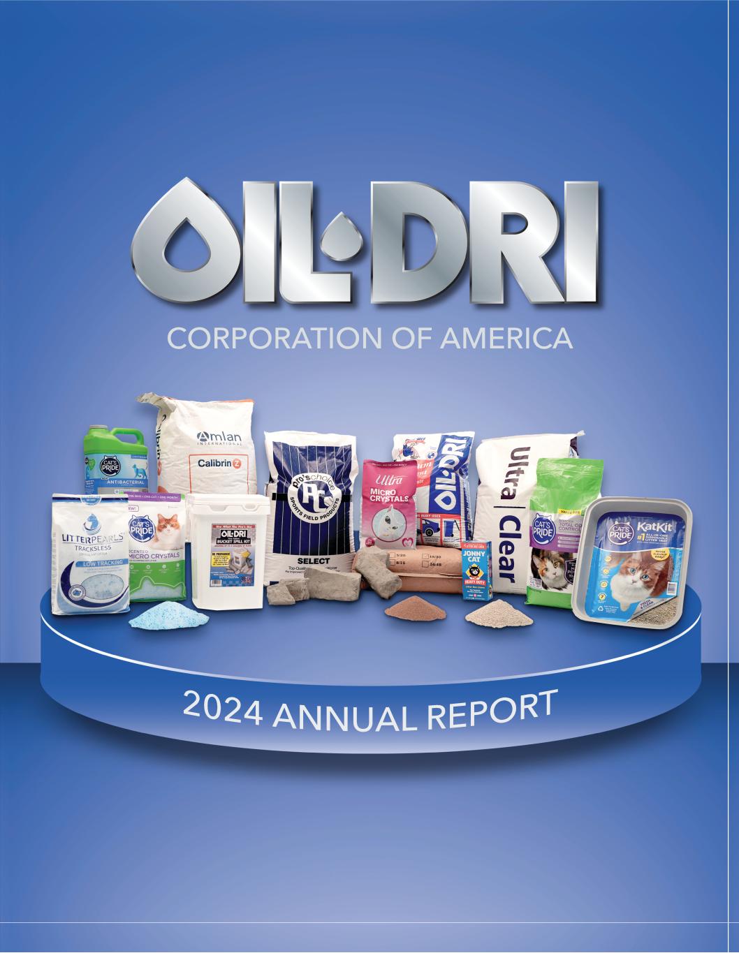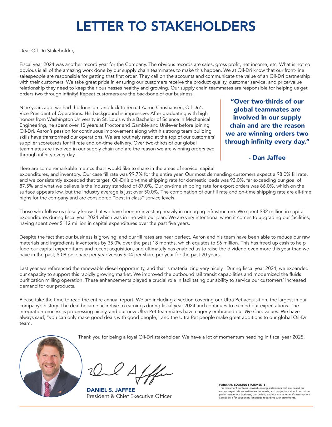 Dear Oil-Dri Stakeholder, Fiscal year 2024 was another record year for the Company. The obvious records are sales, gross profit, net income, etc. What is not so obvious is all of the amazing work done by our supply chain teammates to make this happen. We at Oil-Dri know that our front-line salespeople are responsible for getting that first order. They call on the accounts and communicate the value of an Oil-Dri partnership with their customers. We take great pride in ensuring our customers receive the product quality, customer service, and price/value relationship they need to keep their businesses healthy and growing. Our supply chain teammates are responsible for helping us get orders two through infinity! Repeat customers are the backbone of our business. Nine years ago, we had the foresight and luck to recruit Aaron Christiansen, Oil-Dri’s Vice President of Operations. His background is impressive. After graduating with high honors from Washington University in St. Louis with a Bachelor of Science in Mechanical Engineering, he spent over 15 years at Proctor and Gamble and Unilever before joining Oil-Dri. Aaron’s passion for continuous improvement along with his strong team building skills have transformed our operations. We are routinely rated at the top of our customers’ supplier scorecards for fill rate and on-time delivery. Over two-thirds of our global teammates are involved in our supply chain and are the reason we are winning orders two through infinity every day. Here are some remarkable metrics that I would like to share in the areas of service, capital expenditures, and inventory. Our case fill rate was 99.7% for the entire year. Our most demanding customers expect a 98.0% fill rate, and we consistently exceeded that target! Oil-Dri’s on-time shipping rate for domestic loads was 93.0%, far exceeding our goal of 87.5% and what we believe is the industry standard of 87.0%. Our on-time shipping rate for export orders was 86.0%, which on the surface appears low, but the industry average is just over 50.0%. The combination of our fill rate and on-time shipping rate are all-time highs for the company and are considered “best in class” service levels. Those who follow us closely know that we have been re-investing heavily in our aging infrastructure. We spent $32 million in capital expenditures during fiscal year 2024 which was in line with our plan. We are very intentional when it comes to upgrading our facilities, having spent over $112 million in capital expenditures over the past five years. Despite the fact that our business is growing, and our fill rates are near perfect, Aaron and his team have been able to reduce our raw materials and ingredients inventories by 35.0% over the past 18 months, which equates to $6 million. This has freed up cash to help fund our capital expenditures and recent acquisition, and ultimately has enabled us to raise the dividend even more this year than we have in the past, $.08 per share per year versus $.04 per share per year for the past 20 years. Last year we referenced the renewable diesel opportunity, and that is materializing very nicely. During fiscal year 2024, we expanded our capacity to support this rapidly growing market. We improved the outbound rail transit capabilities and modernized the fluids purification milling operation. These enhancements played a crucial role in facilitating our ability to service our customers’ increased demand for our products. Please take the time to read the entire annual report. We are including a section covering our Ultra Pet acquisition, the largest in our company’s history. The deal became accretive to earnings during fiscal year 2024 and continues to exceed our expectations. The integration process is progressing nicely, and our new Ultra Pet teammates have eagerly embraced our We Care values. We have always said, “you can only make good deals with good people,” and the Ultra Pet people make great additions to our global Oil-Dri team. Thank you for being a loyal Oil-Dri stakeholder. We have a lot of momentum heading in fiscal year 2025. LETTER TO STAKEHOLDERS DANIEL S. JAFFEE President & Chief Executive Officer “Over two-thirds of our global teammates are involved in our supply chain and are the reason we are winning orders two through infinity every day.” - Dan Jaffee FORWARD-LOOKING STATEMENTS This document contains forward-looking statements that are based on current expectations, estimates, forecasts, and projections about our future performance, our business, our beliefs, and our management’s assumptions. See page 4 for cautionary language regarding such statements.