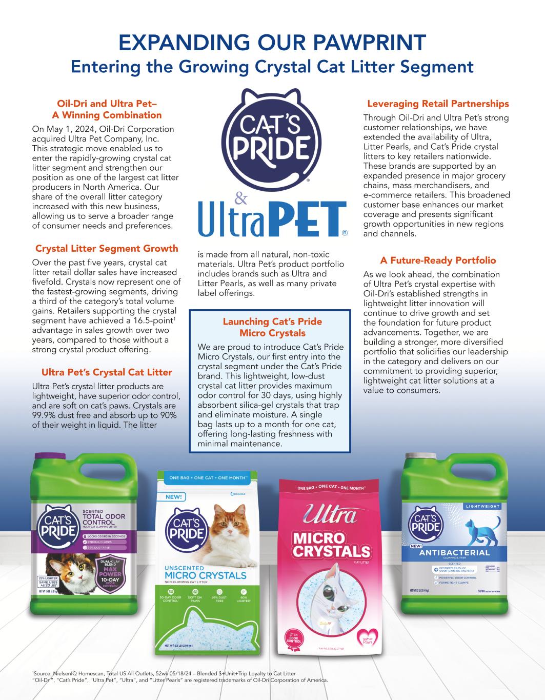 EXPANDING OUR PAWPRINT Entering the Growing Crystal Cat Litter Segment & Oil-Dri and Ultra Pet– A Winning Combination On May 1, 2024, Oil-Dri Corporation acquired Ultra Pet Company, Inc. This strategic move enabled us to enter the rapidly-growing crystal cat litter segment and strengthen our position as one of the largest cat litter producers in North America. Our share of the overall litter category increased with this new business, allowing us to serve a broader range of consumer needs and preferences. Crystal Litter Segment Growth Over the past five years, crystal cat litter retail dollar sales have increased fivefold. Crystals now represent one of the fastest-growing segments, driving a third of the category’s total volume gains. Retailers supporting the crystal segment have achieved a 16.5-point1 advantage in sales growth over two years, compared to those without a strong crystal product offering. Ultra Pet’s Crystal Cat Litter Ultra Pet’s crystal litter products are lightweight, have superior odor control, and are soft on cat’s paws. Crystals are 99.9% dust free and absorb up to 90% of their weight in liquid. The litter is made from all natural, non-toxic materials. Ultra Pet’s product portfolio includes brands such as Ultra and Litter Pearls, as well as many private label offerings. Launching Cat’s Pride Micro Crystals We are proud to introduce Cat’s Pride Micro Crystals, our first entry into the crystal segment under the Cat’s Pride brand. This lightweight, low-dust crystal cat litter provides maximum odor control for 30 days, using highly absorbent silica-gel crystals that trap and eliminate moisture. A single bag lasts up to a month for one cat, offering long-lasting freshness with minimal maintenance. Leveraging Retail Partnerships Through Oil-Dri and Ultra Pet’s strong customer relationships, we have extended the availability of Ultra, Litter Pearls, and Cat’s Pride crystal litters to key retailers nationwide. These brands are supported by an expanded presence in major grocery chains, mass merchandisers, and e-commerce retailers. This broadened customer base enhances our market coverage and presents significant growth opportunities in new regions and channels. A Future-Ready Portfolio As we look ahead, the combination of Ultra Pet’s crystal expertise with Oil-Dri’s established strengths in lightweight litter innovation will continue to drive growth and set the foundation for future product advancements. Together, we are building a stronger, more diversified portfolio that solidifies our leadership in the category and delivers on our commitment to providing superior, lightweight cat litter solutions at a value to consumers. 1Source: NielsenIQ Homescan, Total US All Outlets, 52wk 05/18/24 – Blended $+Unit+Trip Loyalty to Cat Litter “Oil-Dri”, “Cat’s Pride”, “Ultra Pet”, “Ultra”, and “Litter Pearls” are registered trademarks of Oil-Dri Corporation of America.