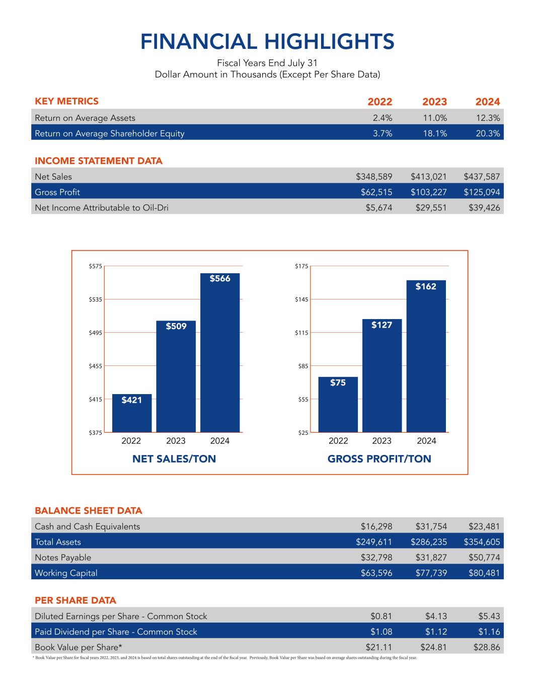 $25 $55 $85 $115 $145 $175 $375 $415 $455 $495 $535 $575 KEY METRICS 2022 2023 2024 Return on Average Assets 2.4% 11.0% 12.3% Return on Average Shareholder Equity 3.7% 18.1% 20.3% INCOME STATEMENT DATA Net Sales $348,589 $413,021 $437,587 Gross Profit $62,515 $103,227 $125,094 Net Income Attributable to Oil-Dri $5,674 $29,551 $39,426 BALANCE SHEET DATA Cash and Cash Equivalents $16,298 $31,754 $23,481 Total Assets $249,611 $286,235 $354,605 Notes Payable $32,798 $31,827 $50,774 Working Capital $63,596 $77,739 $80,481 PER SHARE DATA Diluted Earnings per Share - Common Stock $0.81 $4.13 $5.43 Paid Dividend per Share - Common Stock $1.08 $1.12 $1.16 Book Value per Share* $21.11 $24.81 $28.86 FINANCIAL HIGHLIGHTS Fiscal Years End July 31 Dollar Amount in Thousands (Except Per Share Data) GROSS PROFIT/TONNET SALES/TON 2022 $421 2022 $75 2023 2024 $509 2023 $127 $566 2024 $162 * Book Value per Share for fiscal years 2022, 2023, and 2024 is based on total shares outstanding at the end of the fiscal year. Previously, Book Value per Share was based on average shares outstanding during the fiscal year.