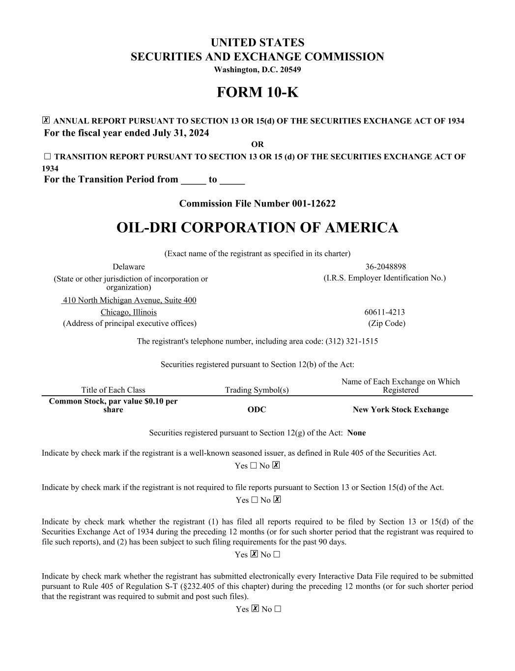 UNITED STATES SECURITIES AND EXCHANGE COMMISSION Washington, D.C. 20549 FORM 10-K ☒ ANNUAL REPORT PURSUANT TO SECTION 13 OR 15(d) OF THE SECURITIES EXCHANGE ACT OF 1934 For the fiscal year ended July 31, 2024 OR ☐ TRANSITION REPORT PURSUANT TO SECTION 13 OR 15 (d) OF THE SECURITIES EXCHANGE ACT OF 1934 For the Transition Period from _____ to _____ Commission File Number 001-12622 OIL-DRI CORPORATION OF AMERICA (Exact name of the registrant as specified in its charter) Delaware 36-2048898 (State or other jurisdiction of incorporation or organization) (I.R.S. Employer Identification No.) 410 North Michigan Avenue, Suite 400 Chicago, Illinois 60611-4213 (Address of principal executive offices) (Zip Code) The registrant's telephone number, including area code: (312) 321-1515 Securities registered pursuant to Section 12(b) of the Act: Title of Each Class Trading Symbol(s) Name of Each Exchange on Which Registered Common Stock, par value $0.10 per share ODC New York Stock Exchange Securities registered pursuant to Section 12(g) of the Act: None Indicate by check mark if the registrant is a well-known seasoned issuer, as defined in Rule 405 of the Securities Act. Yes ☐ No ☒ Indicate by check mark if the registrant is not required to file reports pursuant to Section 13 or Section 15(d) of the Act. Yes ☐ No ☒ Indicate by check mark whether the registrant (1) has filed all reports required to be filed by Section 13 or 15(d) of the Securities Exchange Act of 1934 during the preceding 12 months (or for such shorter period that the registrant was required to file such reports), and (2) has been subject to such filing requirements for the past 90 days. Yes ☒ No ☐ Indicate by check mark whether the registrant has submitted electronically every Interactive Data File required to be submitted pursuant to Rule 405 of Regulation S-T (§232.405 of this chapter) during the preceding 12 months (or for such shorter period that the registrant was required to submit and post such files). Yes ☒ No ☐