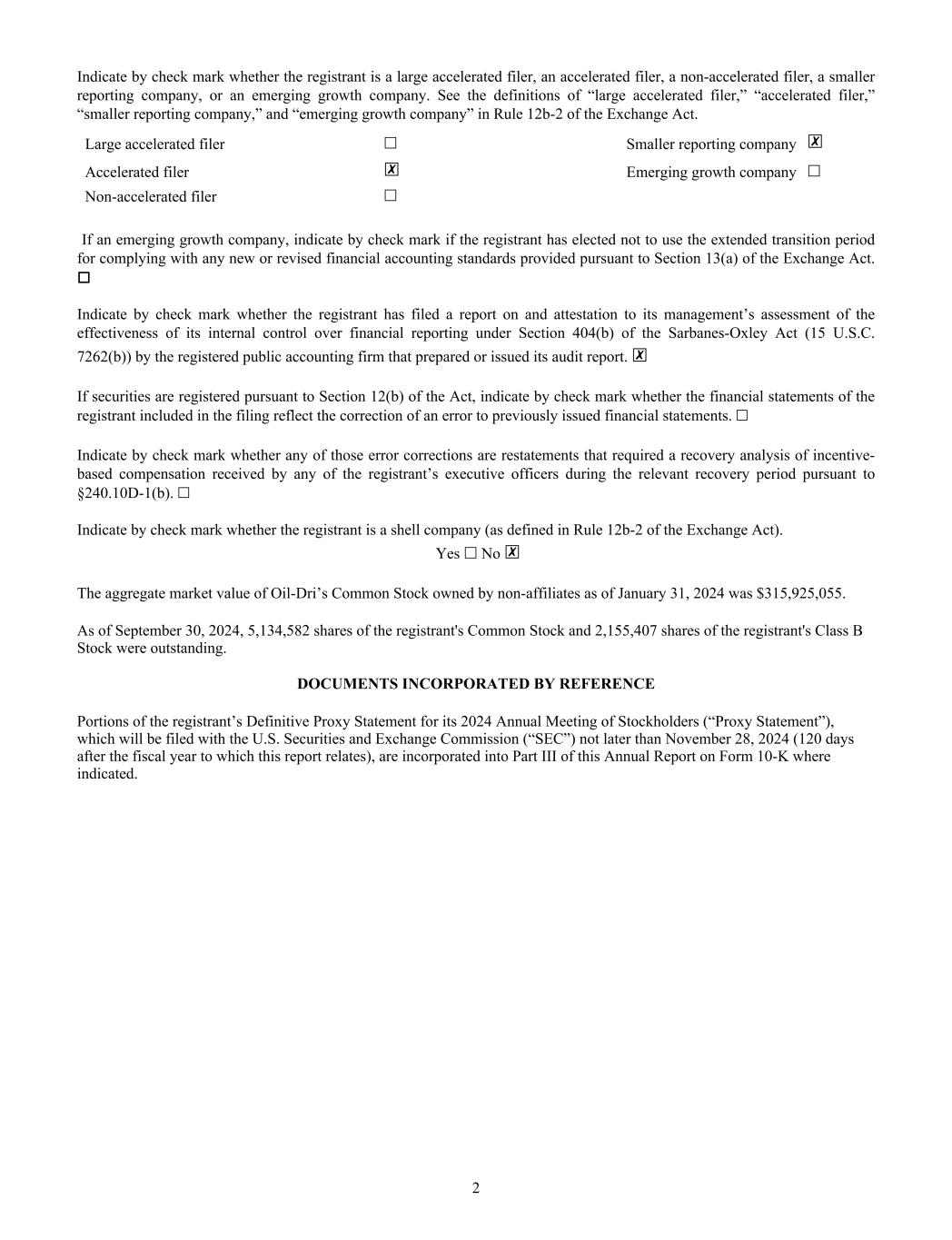 Indicate by check mark whether the registrant is a large accelerated filer, an accelerated filer, a non-accelerated filer, a smaller reporting company, or an emerging growth company. See the definitions of “large accelerated filer,” “accelerated filer,” “smaller reporting company,” and “emerging growth company” in Rule 12b-2 of the Exchange Act. Large accelerated filer ☐ Smaller reporting company ☒ Accelerated filer ☒ Emerging growth company ☐ Non-accelerated filer ☐ If an emerging growth company, indicate by check mark if the registrant has elected not to use the extended transition period for complying with any new or revised financial accounting standards provided pursuant to Section 13(a) of the Exchange Act. o Indicate by check mark whether the registrant has filed a report on and attestation to its management’s assessment of the effectiveness of its internal control over financial reporting under Section 404(b) of the Sarbanes-Oxley Act (15 U.S.C. 7262(b)) by the registered public accounting firm that prepared or issued its audit report. ☒ If securities are registered pursuant to Section 12(b) of the Act, indicate by check mark whether the financial statements of the registrant included in the filing reflect the correction of an error to previously issued financial statements. ☐ Indicate by check mark whether any of those error corrections are restatements that required a recovery analysis of incentive- based compensation received by any of the registrant’s executive officers during the relevant recovery period pursuant to §240.10D-1(b). ☐ Indicate by check mark whether the registrant is a shell company (as defined in Rule 12b-2 of the Exchange Act). Yes ☐ No ☒ The aggregate market value of Oil-Dri’s Common Stock owned by non-affiliates as of January 31, 2024 was $315,925,055. As of September 30, 2024, 5,134,582 shares of the registrant's Common Stock and 2,155,407 shares of the registrant's Class B Stock were outstanding. DOCUMENTS INCORPORATED BY REFERENCE Portions of the registrant’s Definitive Proxy Statement for its 2024 Annual Meeting of Stockholders (“Proxy Statement”), which will be filed with the U.S. Securities and Exchange Commission (“SEC”) not later than November 28, 2024 (120 days after the fiscal year to which this report relates), are incorporated into Part III of this Annual Report on Form 10-K where indicated. 2