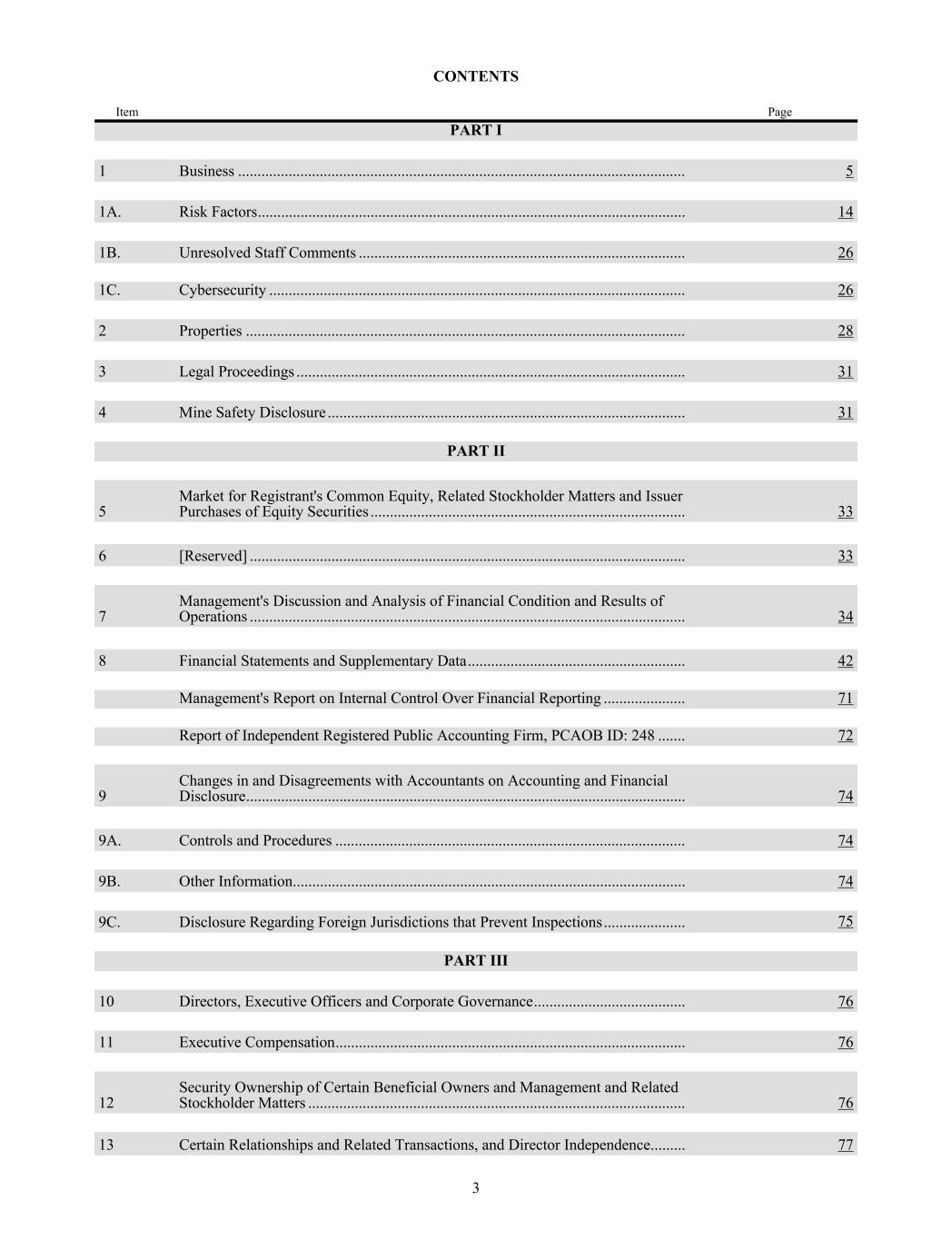 CONTENTS Item Page PART I 1 Business ................................................................................................................... 5 1A. Risk Factors .............................................................................................................. 14 1B. Unresolved Staff Comments .................................................................................... 26 1C. Cybersecurity ........................................................................................................... 26 2 Properties ................................................................................................................. 28 3 Legal Proceedings .................................................................................................... 31 4 Mine Safety Disclosure ............................................................................................ 31 PART II 5 Market for Registrant's Common Equity, Related Stockholder Matters and Issuer Purchases of Equity Securities ................................................................................. 33 6 [Reserved] ................................................................................................................ 33 7 Management's Discussion and Analysis of Financial Condition and Results of Operations ................................................................................................................ 34 8 Financial Statements and Supplementary Data ........................................................ 42 Management's Report on Internal Control Over Financial Reporting ..................... 71 Report of Independent Registered Public Accounting Firm, PCAOB ID: 248 ....... 72 9 Changes in and Disagreements with Accountants on Accounting and Financial Disclosure ................................................................................................................. 74 9A. Controls and Procedures .......................................................................................... 74 9B. Other Information ..................................................................................................... 74 9C. Disclosure Regarding Foreign Jurisdictions that Prevent Inspections ..................... 75 PART III 10 Directors, Executive Officers and Corporate Governance ....................................... 76 11 Executive Compensation .......................................................................................... 76 12 Security Ownership of Certain Beneficial Owners and Management and Related Stockholder Matters ................................................................................................. 76 13 Certain Relationships and Related Transactions, and Director Independence ......... 77 3