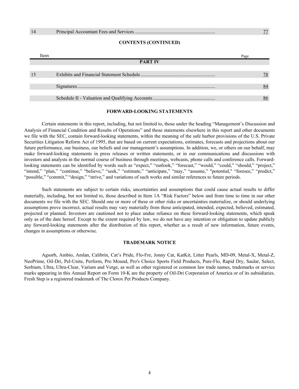 14 Principal Accountant Fees and Services .................................................................. 77 CONTENTS (CONTINUED) Item Page PART IV 15 Exhibits and Financial Statement Schedule ............................................................. 78 Signatures ................................................................................................................. 84 Schedule II - Valuation and Qualifying Accounts ................................................... 86 FORWARD-LOOKING STATEMENTS Certain statements in this report, including, but not limited to, those under the heading “Management’s Discussion and Analysis of Financial Condition and Results of Operations” and those statements elsewhere in this report and other documents we file with the SEC, contain forward-looking statements, within the meaning of the safe harbor provisions of the U.S. Private Securities Litigation Reform Act of 1995, that are based on current expectations, estimates, forecasts and projections about our future performance, our business, our beliefs and our management’s assumptions. In addition, we, or others on our behalf, may make forward-looking statements in press releases or written statements, or in our communications and discussions with investors and analysts in the normal course of business through meetings, webcasts, phone calls and conference calls. Forward- looking statements can be identified by words such as “expect,” “outlook,” “forecast,” “would,” “could,” “should,” “project,” “intend,” “plan,” “continue,” “believe,” “seek,” “estimate,” “anticipate,” “may,” “assume,” "potential," “foresee,” “predict,” “possible,” “commit,” “design,” “strive,” and variations of such works and similar references to future periods. Such statements are subject to certain risks, uncertainties and assumptions that could cause actual results to differ materially, including, but not limited to, those described in Item 1A “Risk Factors” below and from time to time in our other documents we file with the SEC. Should one or more of these or other risks or uncertainties materialize, or should underlying assumptions prove incorrect, actual results may vary materially from those anticipated, intended, expected, believed, estimated, projected or planned. Investors are cautioned not to place undue reliance on these forward-looking statements, which speak only as of the date hereof. Except to the extent required by law, we do not have any intention or obligation to update publicly any forward-looking statements after the distribution of this report, whether as a result of new information, future events, changes in assumptions or otherwise. TRADEMARK NOTICE Agsorb, Ambio, Amlan, Calibrin, Cat’s Pride, Flo-Fre, Jonny Cat, KatKit, Litter Pearls, MD-09, Metal-X, Metal-Z, NeoPrime, Oil-Dri, Pel-Unite, Perform, Pro Mound, Pro's Choice Sports Field Products, Pure-Flo, Rapid Dry, Saular, Select, Sorbiam, Ultra, Ultra-Clear, Varium and Verge, as well as other registered or common law trade names, trademarks or service marks appearing in this Annual Report on Form 10-K are the property of Oil-Dri Corporation of America or of its subsidiaries. Fresh Step is a registered trademark of The Clorox Pet Products Company. 4