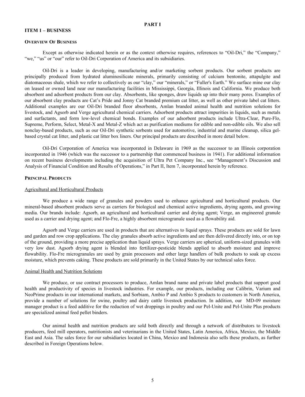 PART I ITEM 1 – BUSINESS OVERVIEW OF BUSINESS Except as otherwise indicated herein or as the context otherwise requires, references to “Oil-Dri,” the “Company,” “we,” “us” or “our” refer to Oil-Dri Corporation of America and its subsidiaries. Oil-Dri is a leader in developing, manufacturing and/or marketing sorbent products. Our sorbent products are principally produced from hydrated aluminosilicate minerals, primarily consisting of calcium bentonite, attapulgite and diatomaceous shale, which we refer to collectively as our “clay,” our “minerals,” or “Fuller's Earth.” We surface mine our clay on leased or owned land near our manufacturing facilities in Mississippi, Georgia, Illinois and California. We produce both absorbent and adsorbent products from our clay. Absorbents, like sponges, draw liquids up into their many pores. Examples of our absorbent clay products are Cat’s Pride and Jonny Cat branded premium cat litter, as well as other private label cat litters. Additional examples are our Oil-Dri branded floor absorbents, Amlan branded animal health and nutrition solutions for livestock, and Agsorb and Verge agricultural chemical carriers. Adsorbent products attract impurities in liquids, such as metals and surfactants, and form low-level chemical bonds. Examples of our adsorbent products include Ultra-Clear, Pure-Flo, Supreme, Perform, Select, Metal-X and Metal-Z which act as purification mediums for edible and non-edible oils. We also sell nonclay-based products, such as our Oil-Dri synthetic sorbents used for automotive, industrial and marine cleanup, silica gel- based crystal cat litter, and plastic cat litter box liners. Our principal products are described in more detail below. Oil-Dri Corporation of America was incorporated in Delaware in 1969 as the successor to an Illinois corporation incorporated in 1946 (which was the successor to a partnership that commenced business in 1941). For additional information on recent business developments including the acquisition of Ultra Pet Company Inc., see “Management’s Discussion and Analysis of Financial Condition and Results of Operations,” in Part II, Item 7, incorporated herein by reference. PRINCIPAL PRODUCTS Agricultural and Horticultural Products We produce a wide range of granules and powders used to enhance agricultural and horticultural products. Our mineral-based absorbent products serve as carriers for biological and chemical active ingredients, drying agents, and growing media. Our brands include: Agsorb, an agricultural and horticultural carrier and drying agent; Verge, an engineered granule used as a carrier and drying agent; and Flo-Fre, a highly absorbent microgranule used as a flowability aid. Agsorb and Verge carriers are used in products that are alternatives to liquid sprays. These products are sold for lawn and garden and row crop applications. The clay granules absorb active ingredients and are then delivered directly into, or on top of the ground, providing a more precise application than liquid sprays. Verge carriers are spherical, uniform-sized granules with very low dust. Agsorb drying agent is blended into fertilizer-pesticide blends applied to absorb moisture and improve flowability. Flo-Fre microgranules are used by grain processors and other large handlers of bulk products to soak up excess moisture, which prevents caking. These products are sold primarily in the United States by our technical sales force. Animal Health and Nutrition Solutions We produce, or use contract processors to produce, Amlan brand name and private label products that support good health and productivity of species in livestock industries. For example, our products, including our Calibrin, Varium and NeoPrime products in our international markets, and Sorbiam, Ambio P and Ambio S products to customers in North America, provide a number of solutions for swine, poultry and dairy cattle livestock production. In addition, our MD-09 moisture manager product is a feed additive for the reduction of wet droppings in poultry and our Pel-Unite and Pel-Unite Plus products are specialized animal feed pellet binders. Our animal health and nutrition products are sold both directly and through a network of distributors to livestock producers, feed mill operators, nutritionists and veterinarians in the United States, Latin America, Africa, Mexico, the Middle East and Asia. The sales force for our subsidiaries located in China, Mexico and Indonesia also sells these products, as further described in Foreign Operations below. 5
