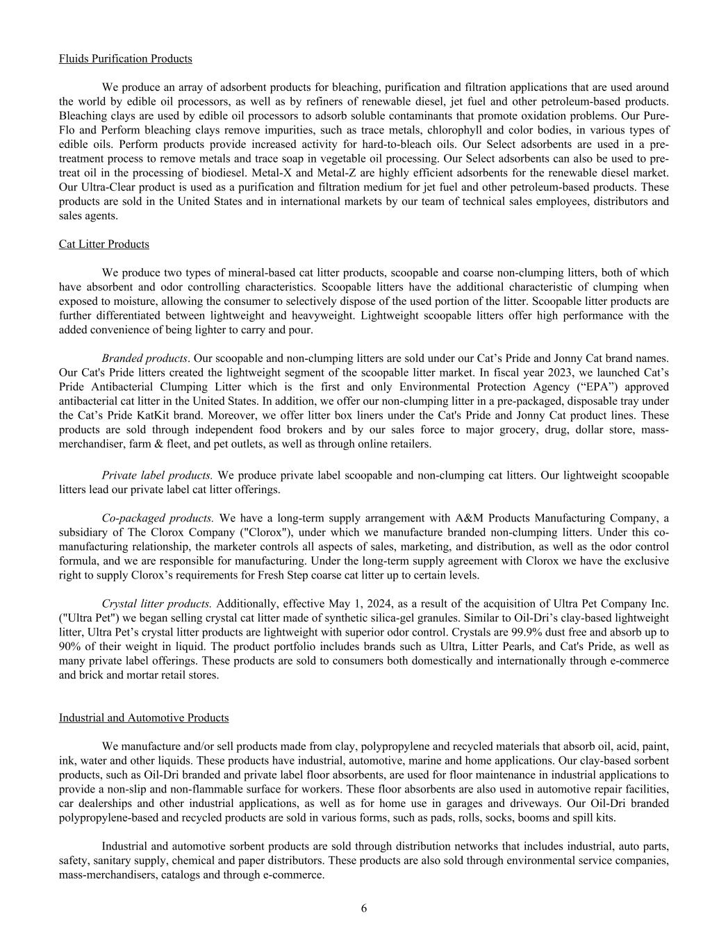 Fluids Purification Products We produce an array of adsorbent products for bleaching, purification and filtration applications that are used around the world by edible oil processors, as well as by refiners of renewable diesel, jet fuel and other petroleum-based products. Bleaching clays are used by edible oil processors to adsorb soluble contaminants that promote oxidation problems. Our Pure- Flo and Perform bleaching clays remove impurities, such as trace metals, chlorophyll and color bodies, in various types of edible oils. Perform products provide increased activity for hard-to-bleach oils. Our Select adsorbents are used in a pre- treatment process to remove metals and trace soap in vegetable oil processing. Our Select adsorbents can also be used to pre- treat oil in the processing of biodiesel. Metal-X and Metal-Z are highly efficient adsorbents for the renewable diesel market. Our Ultra-Clear product is used as a purification and filtration medium for jet fuel and other petroleum-based products. These products are sold in the United States and in international markets by our team of technical sales employees, distributors and sales agents. Cat Litter Products We produce two types of mineral-based cat litter products, scoopable and coarse non-clumping litters, both of which have absorbent and odor controlling characteristics. Scoopable litters have the additional characteristic of clumping when exposed to moisture, allowing the consumer to selectively dispose of the used portion of the litter. Scoopable litter products are further differentiated between lightweight and heavyweight. Lightweight scoopable litters offer high performance with the added convenience of being lighter to carry and pour. Branded products. Our scoopable and non-clumping litters are sold under our Cat’s Pride and Jonny Cat brand names. Our Cat's Pride litters created the lightweight segment of the scoopable litter market. In fiscal year 2023, we launched Cat’s Pride Antibacterial Clumping Litter which is the first and only Environmental Protection Agency (“EPA”) approved antibacterial cat litter in the United States. In addition, we offer our non-clumping litter in a pre-packaged, disposable tray under the Cat’s Pride KatKit brand. Moreover, we offer litter box liners under the Cat's Pride and Jonny Cat product lines. These products are sold through independent food brokers and by our sales force to major grocery, drug, dollar store, mass- merchandiser, farm & fleet, and pet outlets, as well as through online retailers. Private label products. We produce private label scoopable and non-clumping cat litters. Our lightweight scoopable litters lead our private label cat litter offerings. Co-packaged products. We have a long-term supply arrangement with A&M Products Manufacturing Company, a subsidiary of The Clorox Company ("Clorox"), under which we manufacture branded non-clumping litters. Under this co- manufacturing relationship, the marketer controls all aspects of sales, marketing, and distribution, as well as the odor control formula, and we are responsible for manufacturing. Under the long-term supply agreement with Clorox we have the exclusive right to supply Clorox’s requirements for Fresh Step coarse cat litter up to certain levels. Crystal litter products. Additionally, effective May 1, 2024, as a result of the acquisition of Ultra Pet Company Inc. ("Ultra Pet") we began selling crystal cat litter made of synthetic silica-gel granules. Similar to Oil-Dri’s clay-based lightweight litter, Ultra Pet’s crystal litter products are lightweight with superior odor control. Crystals are 99.9% dust free and absorb up to 90% of their weight in liquid. The product portfolio includes brands such as Ultra, Litter Pearls, and Cat's Pride, as well as many private label offerings. These products are sold to consumers both domestically and internationally through e-commerce and brick and mortar retail stores. Industrial and Automotive Products We manufacture and/or sell products made from clay, polypropylene and recycled materials that absorb oil, acid, paint, ink, water and other liquids. These products have industrial, automotive, marine and home applications. Our clay-based sorbent products, such as Oil-Dri branded and private label floor absorbents, are used for floor maintenance in industrial applications to provide a non-slip and non-flammable surface for workers. These floor absorbents are also used in automotive repair facilities, car dealerships and other industrial applications, as well as for home use in garages and driveways. Our Oil-Dri branded polypropylene-based and recycled products are sold in various forms, such as pads, rolls, socks, booms and spill kits. Industrial and automotive sorbent products are sold through distribution networks that includes industrial, auto parts, safety, sanitary supply, chemical and paper distributors. These products are also sold through environmental service companies, mass-merchandisers, catalogs and through e-commerce. 6