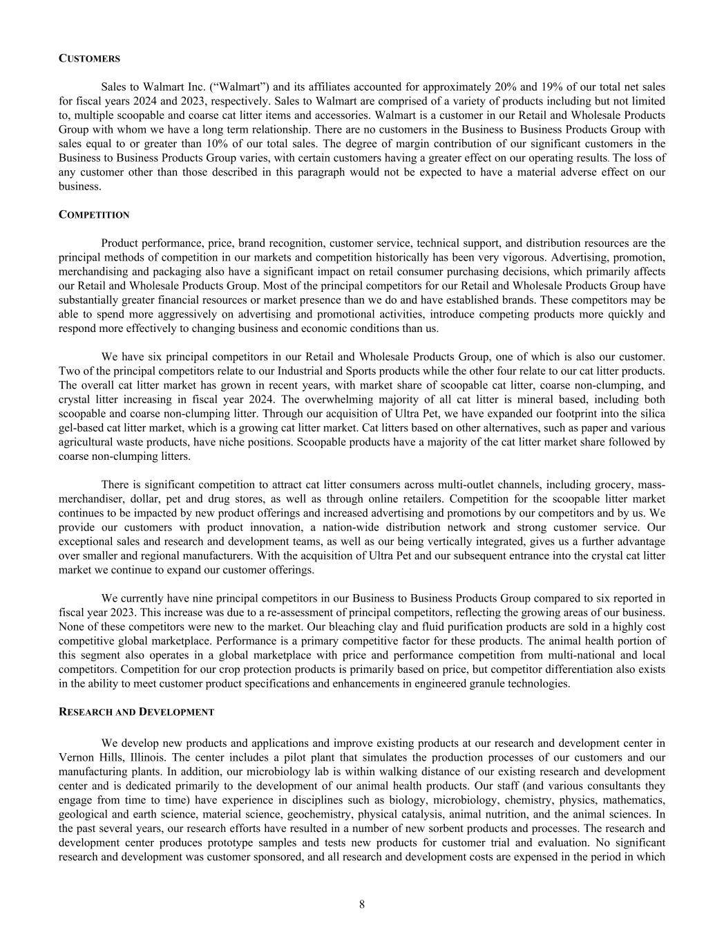 CUSTOMERS Sales to Walmart Inc. (“Walmart”) and its affiliates accounted for approximately 20% and 19% of our total net sales for fiscal years 2024 and 2023, respectively. Sales to Walmart are comprised of a variety of products including but not limited to, multiple scoopable and coarse cat litter items and accessories. Walmart is a customer in our Retail and Wholesale Products Group with whom we have a long term relationship. There are no customers in the Business to Business Products Group with sales equal to or greater than 10% of our total sales. The degree of margin contribution of our significant customers in the Business to Business Products Group varies, with certain customers having a greater effect on our operating results. The loss of any customer other than those described in this paragraph would not be expected to have a material adverse effect on our business. COMPETITION Product performance, price, brand recognition, customer service, technical support, and distribution resources are the principal methods of competition in our markets and competition historically has been very vigorous. Advertising, promotion, merchandising and packaging also have a significant impact on retail consumer purchasing decisions, which primarily affects our Retail and Wholesale Products Group. Most of the principal competitors for our Retail and Wholesale Products Group have substantially greater financial resources or market presence than we do and have established brands. These competitors may be able to spend more aggressively on advertising and promotional activities, introduce competing products more quickly and respond more effectively to changing business and economic conditions than us. We have six principal competitors in our Retail and Wholesale Products Group, one of which is also our customer. Two of the principal competitors relate to our Industrial and Sports products while the other four relate to our cat litter products. The overall cat litter market has grown in recent years, with market share of scoopable cat litter, coarse non-clumping, and crystal litter increasing in fiscal year 2024. The overwhelming majority of all cat litter is mineral based, including both scoopable and coarse non-clumping litter. Through our acquisition of Ultra Pet, we have expanded our footprint into the silica gel-based cat litter market, which is a growing cat litter market. Cat litters based on other alternatives, such as paper and various agricultural waste products, have niche positions. Scoopable products have a majority of the cat litter market share followed by coarse non-clumping litters. There is significant competition to attract cat litter consumers across multi-outlet channels, including grocery, mass- merchandiser, dollar, pet and drug stores, as well as through online retailers. Competition for the scoopable litter market continues to be impacted by new product offerings and increased advertising and promotions by our competitors and by us. We provide our customers with product innovation, a nation-wide distribution network and strong customer service. Our exceptional sales and research and development teams, as well as our being vertically integrated, gives us a further advantage over smaller and regional manufacturers. With the acquisition of Ultra Pet and our subsequent entrance into the crystal cat litter market we continue to expand our customer offerings. We currently have nine principal competitors in our Business to Business Products Group compared to six reported in fiscal year 2023. This increase was due to a re-assessment of principal competitors, reflecting the growing areas of our business. None of these competitors were new to the market. Our bleaching clay and fluid purification products are sold in a highly cost competitive global marketplace. Performance is a primary competitive factor for these products. The animal health portion of this segment also operates in a global marketplace with price and performance competition from multi-national and local competitors. Competition for our crop protection products is primarily based on price, but competitor differentiation also exists in the ability to meet customer product specifications and enhancements in engineered granule technologies. RESEARCH AND DEVELOPMENT We develop new products and applications and improve existing products at our research and development center in Vernon Hills, Illinois. The center includes a pilot plant that simulates the production processes of our customers and our manufacturing plants. In addition, our microbiology lab is within walking distance of our existing research and development center and is dedicated primarily to the development of our animal health products. Our staff (and various consultants they engage from time to time) have experience in disciplines such as biology, microbiology, chemistry, physics, mathematics, geological and earth science, material science, geochemistry, physical catalysis, animal nutrition, and the animal sciences. In the past several years, our research efforts have resulted in a number of new sorbent products and processes. The research and development center produces prototype samples and tests new products for customer trial and evaluation. No significant research and development was customer sponsored, and all research and development costs are expensed in the period in which 8