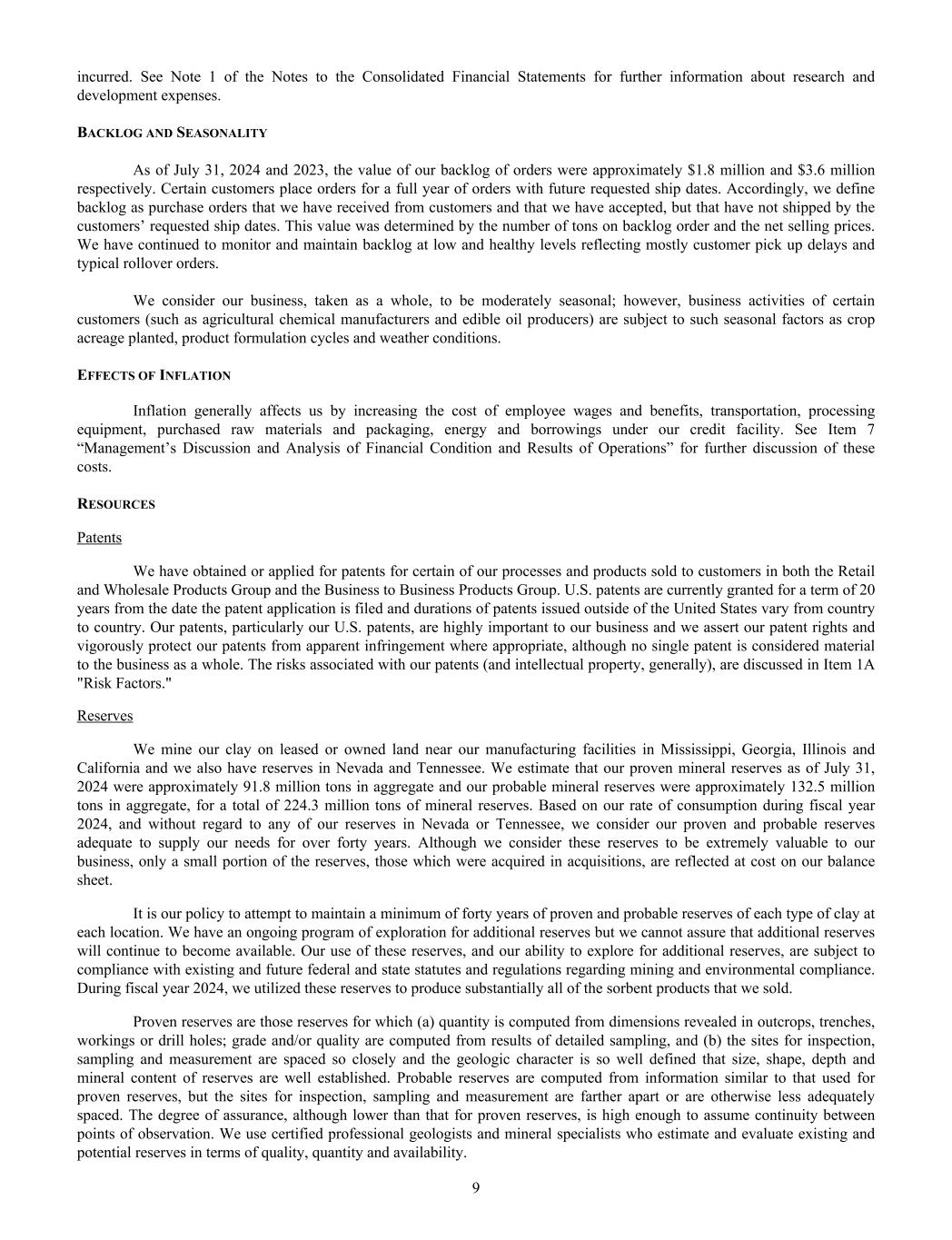 incurred. See Note 1 of the Notes to the Consolidated Financial Statements for further information about research and development expenses. BACKLOG AND SEASONALITY As of July 31, 2024 and 2023, the value of our backlog of orders were approximately $1.8 million and $3.6 million respectively. Certain customers place orders for a full year of orders with future requested ship dates. Accordingly, we define backlog as purchase orders that we have received from customers and that we have accepted, but that have not shipped by the customers’ requested ship dates. This value was determined by the number of tons on backlog order and the net selling prices. We have continued to monitor and maintain backlog at low and healthy levels reflecting mostly customer pick up delays and typical rollover orders. We consider our business, taken as a whole, to be moderately seasonal; however, business activities of certain customers (such as agricultural chemical manufacturers and edible oil producers) are subject to such seasonal factors as crop acreage planted, product formulation cycles and weather conditions. EFFECTS OF INFLATION Inflation generally affects us by increasing the cost of employee wages and benefits, transportation, processing equipment, purchased raw materials and packaging, energy and borrowings under our credit facility. See Item 7 “Management’s Discussion and Analysis of Financial Condition and Results of Operations” for further discussion of these costs. RESOURCES Patents We have obtained or applied for patents for certain of our processes and products sold to customers in both the Retail and Wholesale Products Group and the Business to Business Products Group. U.S. patents are currently granted for a term of 20 years from the date the patent application is filed and durations of patents issued outside of the United States vary from country to country. Our patents, particularly our U.S. patents, are highly important to our business and we assert our patent rights and vigorously protect our patents from apparent infringement where appropriate, although no single patent is considered material to the business as a whole. The risks associated with our patents (and intellectual property, generally), are discussed in Item 1A "Risk Factors." Reserves We mine our clay on leased or owned land near our manufacturing facilities in Mississippi, Georgia, Illinois and California and we also have reserves in Nevada and Tennessee. We estimate that our proven mineral reserves as of July 31, 2024 were approximately 91.8 million tons in aggregate and our probable mineral reserves were approximately 132.5 million tons in aggregate, for a total of 224.3 million tons of mineral reserves. Based on our rate of consumption during fiscal year 2024, and without regard to any of our reserves in Nevada or Tennessee, we consider our proven and probable reserves adequate to supply our needs for over forty years. Although we consider these reserves to be extremely valuable to our business, only a small portion of the reserves, those which were acquired in acquisitions, are reflected at cost on our balance sheet. It is our policy to attempt to maintain a minimum of forty years of proven and probable reserves of each type of clay at each location. We have an ongoing program of exploration for additional reserves but we cannot assure that additional reserves will continue to become available. Our use of these reserves, and our ability to explore for additional reserves, are subject to compliance with existing and future federal and state statutes and regulations regarding mining and environmental compliance. During fiscal year 2024, we utilized these reserves to produce substantially all of the sorbent products that we sold. Proven reserves are those reserves for which (a) quantity is computed from dimensions revealed in outcrops, trenches, workings or drill holes; grade and/or quality are computed from results of detailed sampling, and (b) the sites for inspection, sampling and measurement are spaced so closely and the geologic character is so well defined that size, shape, depth and mineral content of reserves are well established. Probable reserves are computed from information similar to that used for proven reserves, but the sites for inspection, sampling and measurement are farther apart or are otherwise less adequately spaced. The degree of assurance, although lower than that for proven reserves, is high enough to assume continuity between points of observation. We use certified professional geologists and mineral specialists who estimate and evaluate existing and potential reserves in terms of quality, quantity and availability. 9