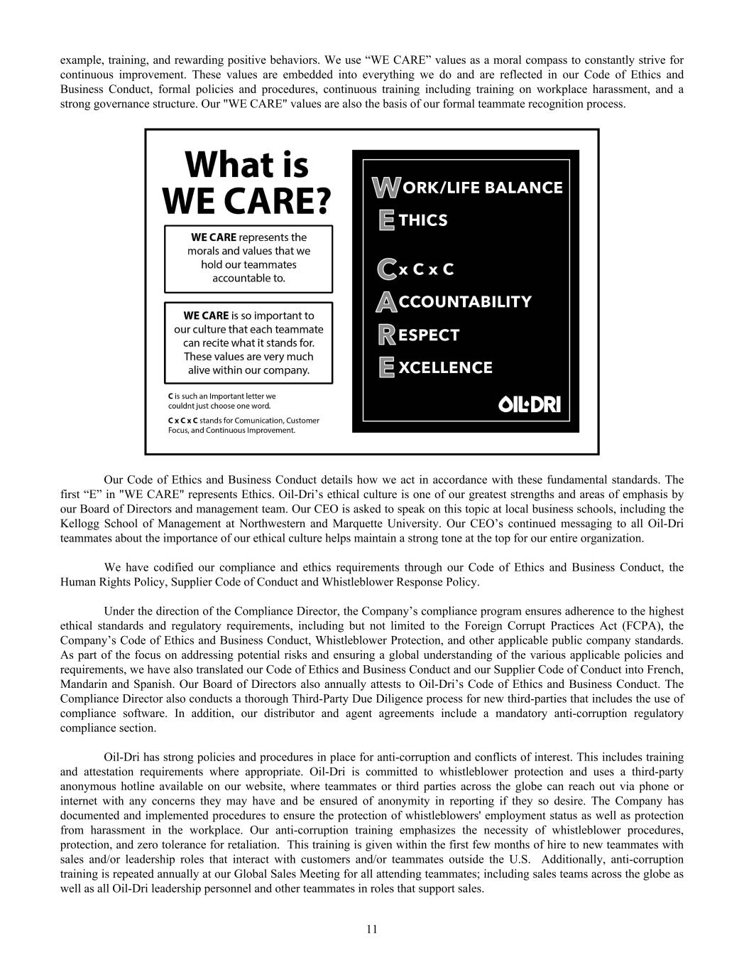 example, training, and rewarding positive behaviors. We use “WE CARE” values as a moral compass to constantly strive for continuous improvement. These values are embedded into everything we do and are reflected in our Code of Ethics and Business Conduct, formal policies and procedures, continuous training including training on workplace harassment, and a strong governance structure. Our "WE CARE" values are also the basis of our formal teammate recognition process. Our Code of Ethics and Business Conduct details how we act in accordance with these fundamental standards. The first “E” in "WE CARE" represents Ethics. Oil-Dri’s ethical culture is one of our greatest strengths and areas of emphasis by our Board of Directors and management team. Our CEO is asked to speak on this topic at local business schools, including the Kellogg School of Management at Northwestern and Marquette University. Our CEO’s continued messaging to all Oil-Dri teammates about the importance of our ethical culture helps maintain a strong tone at the top for our entire organization. We have codified our compliance and ethics requirements through our Code of Ethics and Business Conduct, the Human Rights Policy, Supplier Code of Conduct and Whistleblower Response Policy. Under the direction of the Compliance Director, the Company’s compliance program ensures adherence to the highest ethical standards and regulatory requirements, including but not limited to the Foreign Corrupt Practices Act (FCPA), the Company’s Code of Ethics and Business Conduct, Whistleblower Protection, and other applicable public company standards. As part of the focus on addressing potential risks and ensuring a global understanding of the various applicable policies and requirements, we have also translated our Code of Ethics and Business Conduct and our Supplier Code of Conduct into French, Mandarin and Spanish. Our Board of Directors also annually attests to Oil-Dri’s Code of Ethics and Business Conduct. The Compliance Director also conducts a thorough Third-Party Due Diligence process for new third-parties that includes the use of compliance software. In addition, our distributor and agent agreements include a mandatory anti-corruption regulatory compliance section. Oil-Dri has strong policies and procedures in place for anti-corruption and conflicts of interest. This includes training and attestation requirements where appropriate. Oil-Dri is committed to whistleblower protection and uses a third-party anonymous hotline available on our website, where teammates or third parties across the globe can reach out via phone or internet with any concerns they may have and be ensured of anonymity in reporting if they so desire. The Company has documented and implemented procedures to ensure the protection of whistleblowers' employment status as well as protection from harassment in the workplace. Our anti-corruption training emphasizes the necessity of whistleblower procedures, protection, and zero tolerance for retaliation. This training is given within the first few months of hire to new teammates with sales and/or leadership roles that interact with customers and/or teammates outside the U.S. Additionally, anti-corruption training is repeated annually at our Global Sales Meeting for all attending teammates; including sales teams across the globe as well as all Oil-Dri leadership personnel and other teammates in roles that support sales. 11