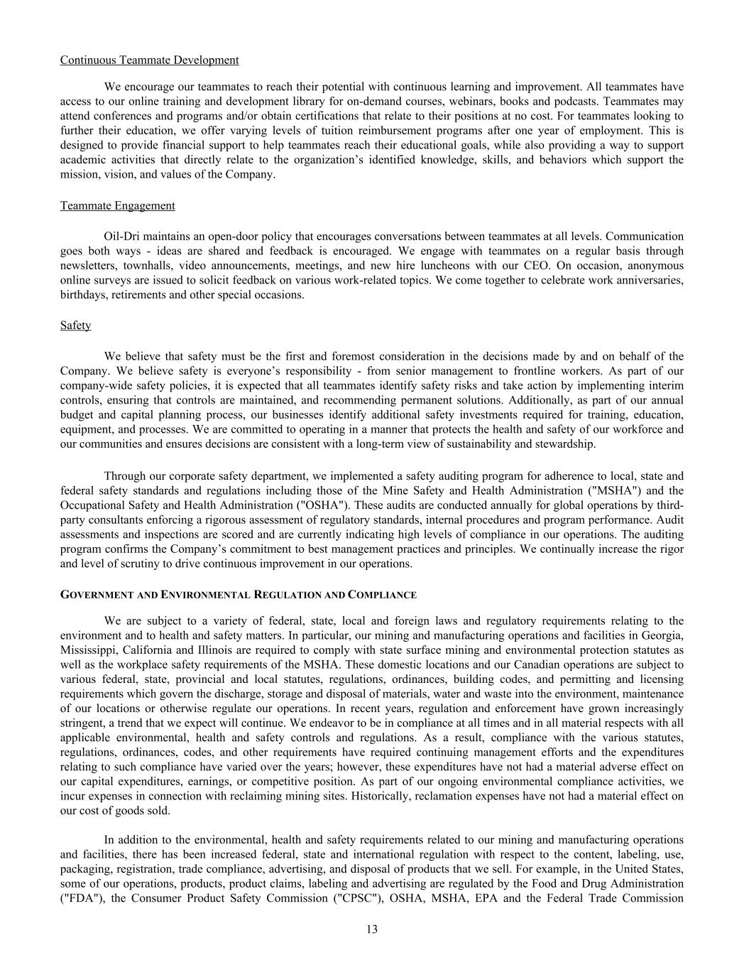 Continuous Teammate Development We encourage our teammates to reach their potential with continuous learning and improvement. All teammates have access to our online training and development library for on-demand courses, webinars, books and podcasts. Teammates may attend conferences and programs and/or obtain certifications that relate to their positions at no cost. For teammates looking to further their education, we offer varying levels of tuition reimbursement programs after one year of employment. This is designed to provide financial support to help teammates reach their educational goals, while also providing a way to support academic activities that directly relate to the organization’s identified knowledge, skills, and behaviors which support the mission, vision, and values of the Company. Teammate Engagement Oil-Dri maintains an open-door policy that encourages conversations between teammates at all levels. Communication goes both ways - ideas are shared and feedback is encouraged. We engage with teammates on a regular basis through newsletters, townhalls, video announcements, meetings, and new hire luncheons with our CEO. On occasion, anonymous online surveys are issued to solicit feedback on various work-related topics. We come together to celebrate work anniversaries, birthdays, retirements and other special occasions. Safety We believe that safety must be the first and foremost consideration in the decisions made by and on behalf of the Company. We believe safety is everyone’s responsibility - from senior management to frontline workers. As part of our company-wide safety policies, it is expected that all teammates identify safety risks and take action by implementing interim controls, ensuring that controls are maintained, and recommending permanent solutions. Additionally, as part of our annual budget and capital planning process, our businesses identify additional safety investments required for training, education, equipment, and processes. We are committed to operating in a manner that protects the health and safety of our workforce and our communities and ensures decisions are consistent with a long-term view of sustainability and stewardship. Through our corporate safety department, we implemented a safety auditing program for adherence to local, state and federal safety standards and regulations including those of the Mine Safety and Health Administration ("MSHA") and the Occupational Safety and Health Administration ("OSHA"). These audits are conducted annually for global operations by third- party consultants enforcing a rigorous assessment of regulatory standards, internal procedures and program performance. Audit assessments and inspections are scored and are currently indicating high levels of compliance in our operations. The auditing program confirms the Company’s commitment to best management practices and principles. We continually increase the rigor and level of scrutiny to drive continuous improvement in our operations. GOVERNMENT AND ENVIRONMENTAL REGULATION AND COMPLIANCE We are subject to a variety of federal, state, local and foreign laws and regulatory requirements relating to the environment and to health and safety matters. In particular, our mining and manufacturing operations and facilities in Georgia, Mississippi, California and Illinois are required to comply with state surface mining and environmental protection statutes as well as the workplace safety requirements of the MSHA. These domestic locations and our Canadian operations are subject to various federal, state, provincial and local statutes, regulations, ordinances, building codes, and permitting and licensing requirements which govern the discharge, storage and disposal of materials, water and waste into the environment, maintenance of our locations or otherwise regulate our operations. In recent years, regulation and enforcement have grown increasingly stringent, a trend that we expect will continue. We endeavor to be in compliance at all times and in all material respects with all applicable environmental, health and safety controls and regulations. As a result, compliance with the various statutes, regulations, ordinances, codes, and other requirements have required continuing management efforts and the expenditures relating to such compliance have varied over the years; however, these expenditures have not had a material adverse effect on our capital expenditures, earnings, or competitive position. As part of our ongoing environmental compliance activities, we incur expenses in connection with reclaiming mining sites. Historically, reclamation expenses have not had a material effect on our cost of goods sold. In addition to the environmental, health and safety requirements related to our mining and manufacturing operations and facilities, there has been increased federal, state and international regulation with respect to the content, labeling, use, packaging, registration, trade compliance, advertising, and disposal of products that we sell. For example, in the United States, some of our operations, products, product claims, labeling and advertising are regulated by the Food and Drug Administration ("FDA"), the Consumer Product Safety Commission ("CPSC"), OSHA, MSHA, EPA and the Federal Trade Commission 13
