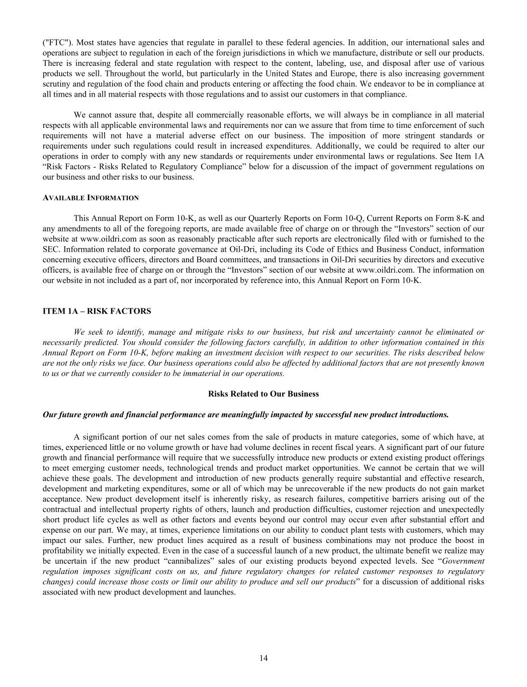 ("FTC"). Most states have agencies that regulate in parallel to these federal agencies. In addition, our international sales and operations are subject to regulation in each of the foreign jurisdictions in which we manufacture, distribute or sell our products. There is increasing federal and state regulation with respect to the content, labeling, use, and disposal after use of various products we sell. Throughout the world, but particularly in the United States and Europe, there is also increasing government scrutiny and regulation of the food chain and products entering or affecting the food chain. We endeavor to be in compliance at all times and in all material respects with those regulations and to assist our customers in that compliance. We cannot assure that, despite all commercially reasonable efforts, we will always be in compliance in all material respects with all applicable environmental laws and requirements nor can we assure that from time to time enforcement of such requirements will not have a material adverse effect on our business. The imposition of more stringent standards or requirements under such regulations could result in increased expenditures. Additionally, we could be required to alter our operations in order to comply with any new standards or requirements under environmental laws or regulations. See Item 1A “Risk Factors - Risks Related to Regulatory Compliance” below for a discussion of the impact of government regulations on our business and other risks to our business. AVAILABLE INFORMATION This Annual Report on Form 10-K, as well as our Quarterly Reports on Form 10-Q, Current Reports on Form 8-K and any amendments to all of the foregoing reports, are made available free of charge on or through the “Investors” section of our website at www.oildri.com as soon as reasonably practicable after such reports are electronically filed with or furnished to the SEC. Information related to corporate governance at Oil-Dri, including its Code of Ethics and Business Conduct, information concerning executive officers, directors and Board committees, and transactions in Oil-Dri securities by directors and executive officers, is available free of charge on or through the “Investors” section of our website at www.oildri.com. The information on our website in not included as a part of, nor incorporated by reference into, this Annual Report on Form 10-K. ITEM 1A – RISK FACTORS We seek to identify, manage and mitigate risks to our business, but risk and uncertainty cannot be eliminated or necessarily predicted. You should consider the following factors carefully, in addition to other information contained in this Annual Report on Form 10-K, before making an investment decision with respect to our securities. The risks described below are not the only risks we face. Our business operations could also be affected by additional factors that are not presently known to us or that we currently consider to be immaterial in our operations. Risks Related to Our Business Our future growth and financial performance are meaningfully impacted by successful new product introductions. A significant portion of our net sales comes from the sale of products in mature categories, some of which have, at times, experienced little or no volume growth or have had volume declines in recent fiscal years. A significant part of our future growth and financial performance will require that we successfully introduce new products or extend existing product offerings to meet emerging customer needs, technological trends and product market opportunities. We cannot be certain that we will achieve these goals. The development and introduction of new products generally require substantial and effective research, development and marketing expenditures, some or all of which may be unrecoverable if the new products do not gain market acceptance. New product development itself is inherently risky, as research failures, competitive barriers arising out of the contractual and intellectual property rights of others, launch and production difficulties, customer rejection and unexpectedly short product life cycles as well as other factors and events beyond our control may occur even after substantial effort and expense on our part. We may, at times, experience limitations on our ability to conduct plant tests with customers, which may impact our sales. Further, new product lines acquired as a result of business combinations may not produce the boost in profitability we initially expected. Even in the case of a successful launch of a new product, the ultimate benefit we realize may be uncertain if the new product “cannibalizes” sales of our existing products beyond expected levels. See “Government regulation imposes significant costs on us, and future regulatory changes (or related customer responses to regulatory changes) could increase those costs or limit our ability to produce and sell our products” for a discussion of additional risks associated with new product development and launches. 14