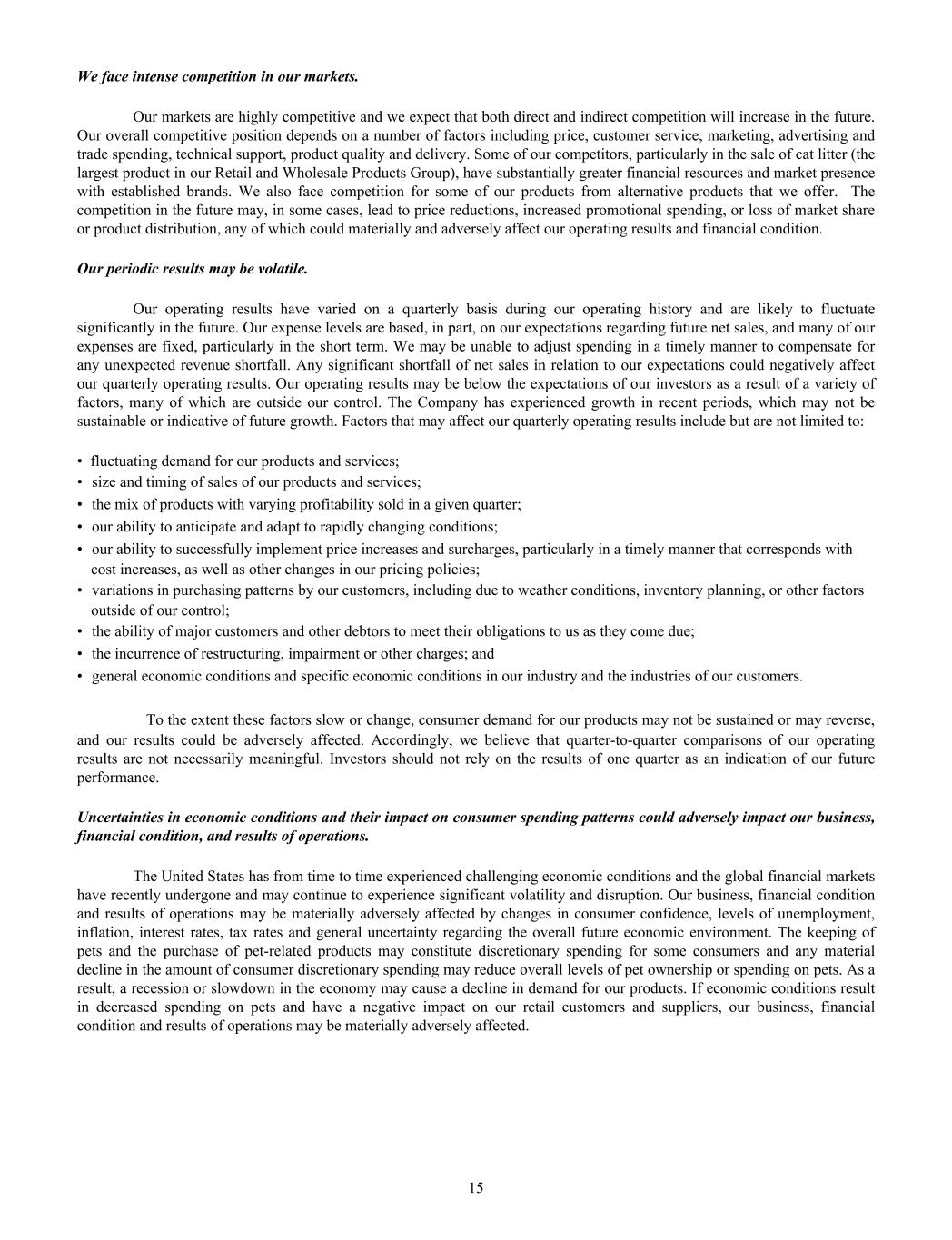 We face intense competition in our markets. Our markets are highly competitive and we expect that both direct and indirect competition will increase in the future. Our overall competitive position depends on a number of factors including price, customer service, marketing, advertising and trade spending, technical support, product quality and delivery. Some of our competitors, particularly in the sale of cat litter (the largest product in our Retail and Wholesale Products Group), have substantially greater financial resources and market presence with established brands. We also face competition for some of our products from alternative products that we offer. The competition in the future may, in some cases, lead to price reductions, increased promotional spending, or loss of market share or product distribution, any of which could materially and adversely affect our operating results and financial condition. Our periodic results may be volatile. Our operating results have varied on a quarterly basis during our operating history and are likely to fluctuate significantly in the future. Our expense levels are based, in part, on our expectations regarding future net sales, and many of our expenses are fixed, particularly in the short term. We may be unable to adjust spending in a timely manner to compensate for any unexpected revenue shortfall. Any significant shortfall of net sales in relation to our expectations could negatively affect our quarterly operating results. Our operating results may be below the expectations of our investors as a result of a variety of factors, many of which are outside our control. The Company has experienced growth in recent periods, which may not be sustainable or indicative of future growth. Factors that may affect our quarterly operating results include but are not limited to: • fluctuating demand for our products and services; • size and timing of sales of our products and services; • the mix of products with varying profitability sold in a given quarter; • our ability to anticipate and adapt to rapidly changing conditions; • our ability to successfully implement price increases and surcharges, particularly in a timely manner that corresponds with cost increases, as well as other changes in our pricing policies; • variations in purchasing patterns by our customers, including due to weather conditions, inventory planning, or other factors outside of our control; • the ability of major customers and other debtors to meet their obligations to us as they come due; • the incurrence of restructuring, impairment or other charges; and • general economic conditions and specific economic conditions in our industry and the industries of our customers. To the extent these factors slow or change, consumer demand for our products may not be sustained or may reverse, and our results could be adversely affected. Accordingly, we believe that quarter-to-quarter comparisons of our operating results are not necessarily meaningful. Investors should not rely on the results of one quarter as an indication of our future performance. Uncertainties in economic conditions and their impact on consumer spending patterns could adversely impact our business, financial condition, and results of operations. The United States has from time to time experienced challenging economic conditions and the global financial markets have recently undergone and may continue to experience significant volatility and disruption. Our business, financial condition and results of operations may be materially adversely affected by changes in consumer confidence, levels of unemployment, inflation, interest rates, tax rates and general uncertainty regarding the overall future economic environment. The keeping of pets and the purchase of pet-related products may constitute discretionary spending for some consumers and any material decline in the amount of consumer discretionary spending may reduce overall levels of pet ownership or spending on pets. As a result, a recession or slowdown in the economy may cause a decline in demand for our products. If economic conditions result in decreased spending on pets and have a negative impact on our retail customers and suppliers, our business, financial condition and results of operations may be materially adversely affected. 15