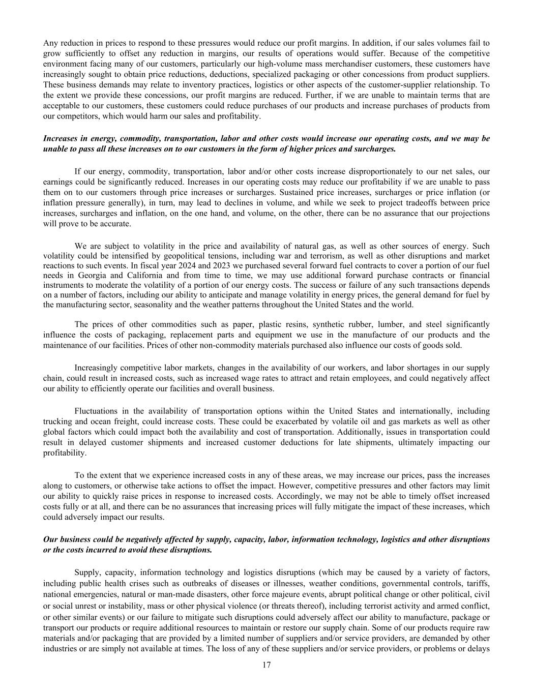 Any reduction in prices to respond to these pressures would reduce our profit margins. In addition, if our sales volumes fail to grow sufficiently to offset any reduction in margins, our results of operations would suffer. Because of the competitive environment facing many of our customers, particularly our high-volume mass merchandiser customers, these customers have increasingly sought to obtain price reductions, deductions, specialized packaging or other concessions from product suppliers. These business demands may relate to inventory practices, logistics or other aspects of the customer-supplier relationship. To the extent we provide these concessions, our profit margins are reduced. Further, if we are unable to maintain terms that are acceptable to our customers, these customers could reduce purchases of our products and increase purchases of products from our competitors, which would harm our sales and profitability. Increases in energy, commodity, transportation, labor and other costs would increase our operating costs, and we may be unable to pass all these increases on to our customers in the form of higher prices and surcharges. If our energy, commodity, transportation, labor and/or other costs increase disproportionately to our net sales, our earnings could be significantly reduced. Increases in our operating costs may reduce our profitability if we are unable to pass them on to our customers through price increases or surcharges. Sustained price increases, surcharges or price inflation (or inflation pressure generally), in turn, may lead to declines in volume, and while we seek to project tradeoffs between price increases, surcharges and inflation, on the one hand, and volume, on the other, there can be no assurance that our projections will prove to be accurate. We are subject to volatility in the price and availability of natural gas, as well as other sources of energy. Such volatility could be intensified by geopolitical tensions, including war and terrorism, as well as other disruptions and market reactions to such events. In fiscal year 2024 and 2023 we purchased several forward fuel contracts to cover a portion of our fuel needs in Georgia and California and from time to time, we may use additional forward purchase contracts or financial instruments to moderate the volatility of a portion of our energy costs. The success or failure of any such transactions depends on a number of factors, including our ability to anticipate and manage volatility in energy prices, the general demand for fuel by the manufacturing sector, seasonality and the weather patterns throughout the United States and the world. The prices of other commodities such as paper, plastic resins, synthetic rubber, lumber, and steel significantly influence the costs of packaging, replacement parts and equipment we use in the manufacture of our products and the maintenance of our facilities. Prices of other non-commodity materials purchased also influence our costs of goods sold. Increasingly competitive labor markets, changes in the availability of our workers, and labor shortages in our supply chain, could result in increased costs, such as increased wage rates to attract and retain employees, and could negatively affect our ability to efficiently operate our facilities and overall business. Fluctuations in the availability of transportation options within the United States and internationally, including trucking and ocean freight, could increase costs. These could be exacerbated by volatile oil and gas markets as well as other global factors which could impact both the availability and cost of transportation. Additionally, issues in transportation could result in delayed customer shipments and increased customer deductions for late shipments, ultimately impacting our profitability. To the extent that we experience increased costs in any of these areas, we may increase our prices, pass the increases along to customers, or otherwise take actions to offset the impact. However, competitive pressures and other factors may limit our ability to quickly raise prices in response to increased costs. Accordingly, we may not be able to timely offset increased costs fully or at all, and there can be no assurances that increasing prices will fully mitigate the impact of these increases, which could adversely impact our results. Our business could be negatively affected by supply, capacity, labor, information technology, logistics and other disruptions or the costs incurred to avoid these disruptions. Supply, capacity, information technology and logistics disruptions (which may be caused by a variety of factors, including public health crises such as outbreaks of diseases or illnesses, weather conditions, governmental controls, tariffs, national emergencies, natural or man-made disasters, other force majeure events, abrupt political change or other political, civil or social unrest or instability, mass or other physical violence (or threats thereof), including terrorist activity and armed conflict, or other similar events) or our failure to mitigate such disruptions could adversely affect our ability to manufacture, package or transport our products or require additional resources to maintain or restore our supply chain. Some of our products require raw materials and/or packaging that are provided by a limited number of suppliers and/or service providers, are demanded by other industries or are simply not available at times. The loss of any of these suppliers and/or service providers, or problems or delays 17
