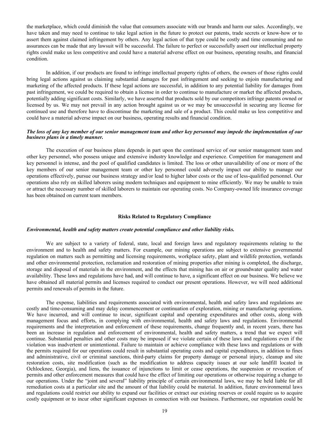 the marketplace, which could diminish the value that consumers associate with our brands and harm our sales. Accordingly, we have taken and may need to continue to take legal action in the future to protect our patents, trade secrets or know-how or to assert them against claimed infringement by others. Any legal action of that type could be costly and time consuming and no assurances can be made that any lawsuit will be successful. The failure to perfect or successfully assert our intellectual property rights could make us less competitive and could have a material adverse effect on our business, operating results, and financial condition. In addition, if our products are found to infringe intellectual property rights of others, the owners of those rights could bring legal actions against us claiming substantial damages for past infringement and seeking to enjoin manufacturing and marketing of the affected products. If these legal actions are successful, in addition to any potential liability for damages from past infringement, we could be required to obtain a license in order to continue to manufacture or market the affected products, potentially adding significant costs. Similarly, we have asserted that products sold by our competitors infringe patents owned or licensed by us. We may not prevail in any action brought against us or we may be unsuccessful in securing any license for continued use and therefore have to discontinue the marketing and sale of a product. This could make us less competitive and could have a material adverse impact on our business, operating results and financial condition. The loss of any key member of our senior management team and other key personnel may impede the implementation of our business plans in a timely manner. The execution of our business plans depends in part upon the continued service of our senior management team and other key personnel, who possess unique and extensive industry knowledge and experience. Competition for management and key personnel is intense, and the pool of qualified candidates is limited. The loss or other unavailability of one or more of the key members of our senior management team or other key personnel could adversely impact our ability to manage our operations effectively, pursue our business strategy and/or lead to higher labor costs or the use of less-qualified personnel. Our operations also rely on skilled laborers using modern techniques and equipment to mine efficiently. We may be unable to train or attract the necessary number of skilled laborers to maintain our operating costs. No Company-owned life insurance coverage has been obtained on current team members. Risks Related to Regulatory Compliance Environmental, health and safety matters create potential compliance and other liability risks. We are subject to a variety of federal, state, local and foreign laws and regulatory requirements relating to the environment and to health and safety matters. For example, our mining operations are subject to extensive governmental regulation on matters such as permitting and licensing requirements, workplace safety, plant and wildlife protection, wetlands and other environmental protection, reclamation and restoration of mining properties after mining is completed, the discharge, storage and disposal of materials in the environment, and the effects that mining has on air or groundwater quality and water availability. These laws and regulations have had, and will continue to have, a significant effect on our business. We believe we have obtained all material permits and licenses required to conduct our present operations. However, we will need additional permits and renewals of permits in the future. The expense, liabilities and requirements associated with environmental, health and safety laws and regulations are costly and time-consuming and may delay commencement or continuation of exploration, mining or manufacturing operations. We have incurred, and will continue to incur, significant capital and operating expenditures and other costs, along with management focus and efforts, in complying with environmental, health and safety laws and regulations. Environmental requirements and the interpretation and enforcement of these requirements, change frequently and, in recent years, there has been an increase in regulation and enforcement of environmental, health and safety matters, a trend that we expect will continue. Substantial penalties and other costs may be imposed if we violate certain of these laws and regulations even if the violation was inadvertent or unintentional. Failure to maintain or achieve compliance with these laws and regulations or with the permits required for our operations could result in substantial operating costs and capital expenditures, in addition to fines and administrative, civil or criminal sanctions, third-party claims for property damage or personal injury, cleanup and site restoration costs, site modification (such as the modification to address capacity issues at our sole landfill located in Ochlocknee, Georgia), and liens, the issuance of injunctions to limit or cease operations, the suspension or revocation of permits and other enforcement measures that could have the effect of limiting our operations or otherwise requiring a change to our operations. Under the “joint and several” liability principle of certain environmental laws, we may be held liable for all remediation costs at a particular site and the amount of that liability could be material. In addition, future environmental laws and regulations could restrict our ability to expand our facilities or extract our existing reserves or could require us to acquire costly equipment or to incur other significant expenses in connection with our business. Furthermore, our reputation could be 19