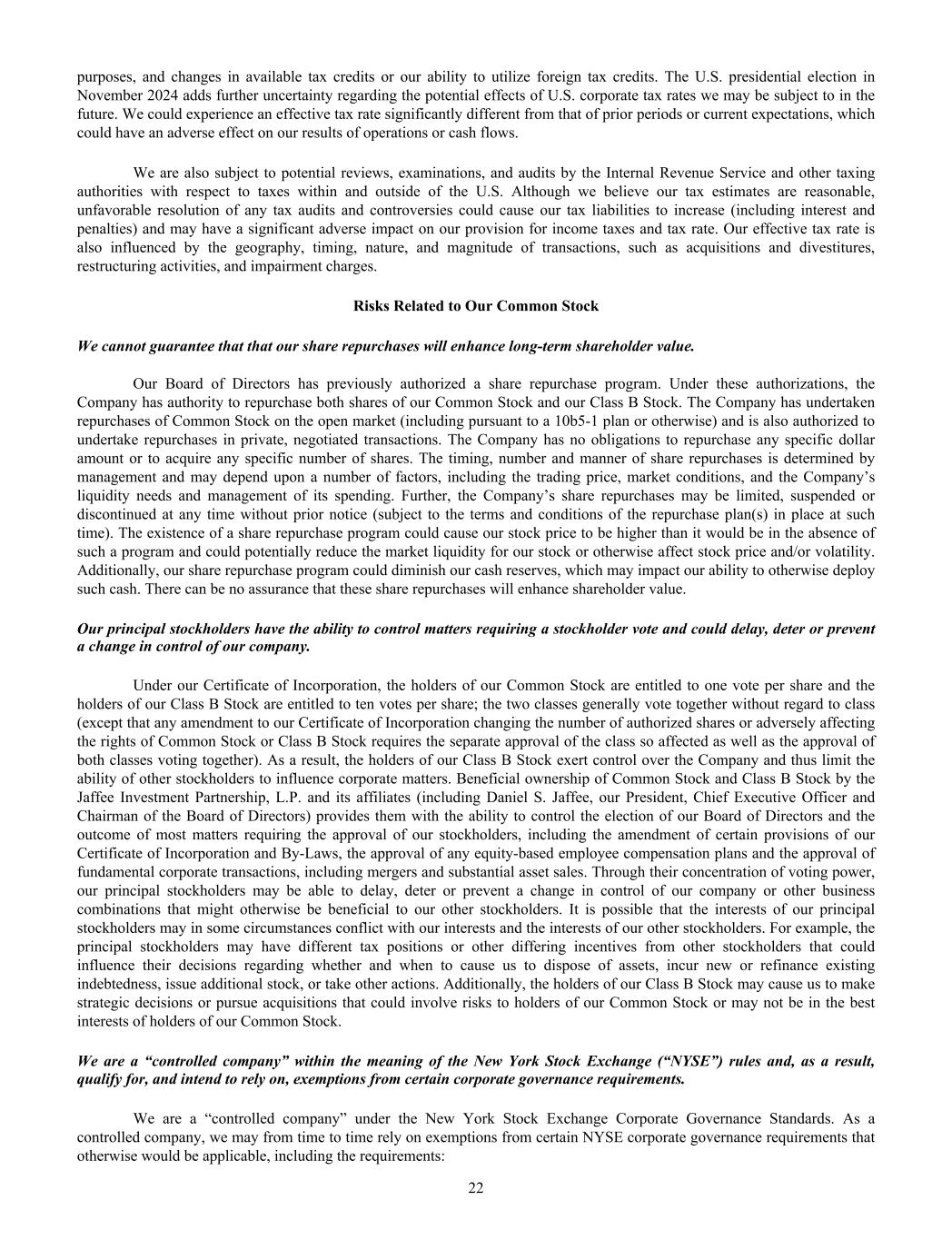 purposes, and changes in available tax credits or our ability to utilize foreign tax credits. The U.S. presidential election in November 2024 adds further uncertainty regarding the potential effects of U.S. corporate tax rates we may be subject to in the future. We could experience an effective tax rate significantly different from that of prior periods or current expectations, which could have an adverse effect on our results of operations or cash flows. We are also subject to potential reviews, examinations, and audits by the Internal Revenue Service and other taxing authorities with respect to taxes within and outside of the U.S. Although we believe our tax estimates are reasonable, unfavorable resolution of any tax audits and controversies could cause our tax liabilities to increase (including interest and penalties) and may have a significant adverse impact on our provision for income taxes and tax rate. Our effective tax rate is also influenced by the geography, timing, nature, and magnitude of transactions, such as acquisitions and divestitures, restructuring activities, and impairment charges. Risks Related to Our Common Stock We cannot guarantee that that our share repurchases will enhance long-term shareholder value. Our Board of Directors has previously authorized a share repurchase program. Under these authorizations, the Company has authority to repurchase both shares of our Common Stock and our Class B Stock. The Company has undertaken repurchases of Common Stock on the open market (including pursuant to a 10b5-1 plan or otherwise) and is also authorized to undertake repurchases in private, negotiated transactions. The Company has no obligations to repurchase any specific dollar amount or to acquire any specific number of shares. The timing, number and manner of share repurchases is determined by management and may depend upon a number of factors, including the trading price, market conditions, and the Company’s liquidity needs and management of its spending. Further, the Company’s share repurchases may be limited, suspended or discontinued at any time without prior notice (subject to the terms and conditions of the repurchase plan(s) in place at such time). The existence of a share repurchase program could cause our stock price to be higher than it would be in the absence of such a program and could potentially reduce the market liquidity for our stock or otherwise affect stock price and/or volatility. Additionally, our share repurchase program could diminish our cash reserves, which may impact our ability to otherwise deploy such cash. There can be no assurance that these share repurchases will enhance shareholder value. Our principal stockholders have the ability to control matters requiring a stockholder vote and could delay, deter or prevent a change in control of our company. Under our Certificate of Incorporation, the holders of our Common Stock are entitled to one vote per share and the holders of our Class B Stock are entitled to ten votes per share; the two classes generally vote together without regard to class (except that any amendment to our Certificate of Incorporation changing the number of authorized shares or adversely affecting the rights of Common Stock or Class B Stock requires the separate approval of the class so affected as well as the approval of both classes voting together). As a result, the holders of our Class B Stock exert control over the Company and thus limit the ability of other stockholders to influence corporate matters. Beneficial ownership of Common Stock and Class B Stock by the Jaffee Investment Partnership, L.P. and its affiliates (including Daniel S. Jaffee, our President, Chief Executive Officer and Chairman of the Board of Directors) provides them with the ability to control the election of our Board of Directors and the outcome of most matters requiring the approval of our stockholders, including the amendment of certain provisions of our Certificate of Incorporation and By-Laws, the approval of any equity-based employee compensation plans and the approval of fundamental corporate transactions, including mergers and substantial asset sales. Through their concentration of voting power, our principal stockholders may be able to delay, deter or prevent a change in control of our company or other business combinations that might otherwise be beneficial to our other stockholders. It is possible that the interests of our principal stockholders may in some circumstances conflict with our interests and the interests of our other stockholders. For example, the principal stockholders may have different tax positions or other differing incentives from other stockholders that could influence their decisions regarding whether and when to cause us to dispose of assets, incur new or refinance existing indebtedness, issue additional stock, or take other actions. Additionally, the holders of our Class B Stock may cause us to make strategic decisions or pursue acquisitions that could involve risks to holders of our Common Stock or may not be in the best interests of holders of our Common Stock. We are a “controlled company” within the meaning of the New York Stock Exchange (“NYSE”) rules and, as a result, qualify for, and intend to rely on, exemptions from certain corporate governance requirements. We are a “controlled company” under the New York Stock Exchange Corporate Governance Standards. As a controlled company, we may from time to time rely on exemptions from certain NYSE corporate governance requirements that otherwise would be applicable, including the requirements: 22