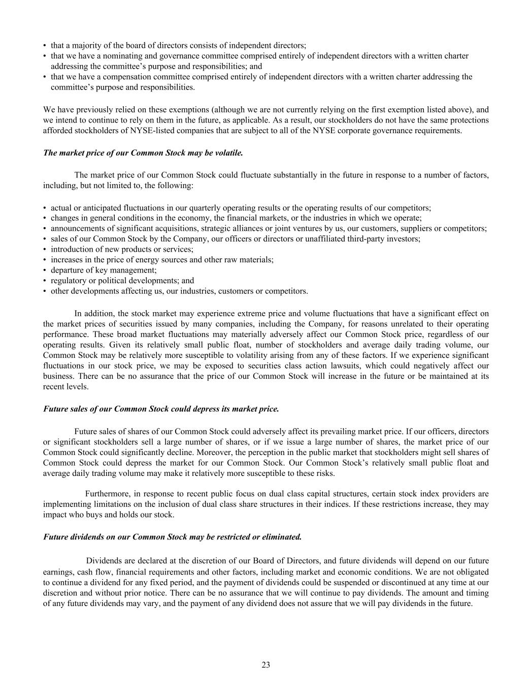 • that a majority of the board of directors consists of independent directors; • that we have a nominating and governance committee comprised entirely of independent directors with a written charter addressing the committee’s purpose and responsibilities; and • that we have a compensation committee comprised entirely of independent directors with a written charter addressing the committee’s purpose and responsibilities. We have previously relied on these exemptions (although we are not currently relying on the first exemption listed above), and we intend to continue to rely on them in the future, as applicable. As a result, our stockholders do not have the same protections afforded stockholders of NYSE-listed companies that are subject to all of the NYSE corporate governance requirements. The market price of our Common Stock may be volatile. The market price of our Common Stock could fluctuate substantially in the future in response to a number of factors, including, but not limited to, the following: • actual or anticipated fluctuations in our quarterly operating results or the operating results of our competitors; • changes in general conditions in the economy, the financial markets, or the industries in which we operate; • announcements of significant acquisitions, strategic alliances or joint ventures by us, our customers, suppliers or competitors; • sales of our Common Stock by the Company, our officers or directors or unaffiliated third-party investors; • introduction of new products or services; • increases in the price of energy sources and other raw materials; • departure of key management; • regulatory or political developments; and • other developments affecting us, our industries, customers or competitors. In addition, the stock market may experience extreme price and volume fluctuations that have a significant effect on the market prices of securities issued by many companies, including the Company, for reasons unrelated to their operating performance. These broad market fluctuations may materially adversely affect our Common Stock price, regardless of our operating results. Given its relatively small public float, number of stockholders and average daily trading volume, our Common Stock may be relatively more susceptible to volatility arising from any of these factors. If we experience significant fluctuations in our stock price, we may be exposed to securities class action lawsuits, which could negatively affect our business. There can be no assurance that the price of our Common Stock will increase in the future or be maintained at its recent levels. Future sales of our Common Stock could depress its market price. Future sales of shares of our Common Stock could adversely affect its prevailing market price. If our officers, directors or significant stockholders sell a large number of shares, or if we issue a large number of shares, the market price of our Common Stock could significantly decline. Moreover, the perception in the public market that stockholders might sell shares of Common Stock could depress the market for our Common Stock. Our Common Stock’s relatively small public float and average daily trading volume may make it relatively more susceptible to these risks. Furthermore, in response to recent public focus on dual class capital structures, certain stock index providers are implementing limitations on the inclusion of dual class share structures in their indices. If these restrictions increase, they may impact who buys and holds our stock. Future dividends on our Common Stock may be restricted or eliminated. Dividends are declared at the discretion of our Board of Directors, and future dividends will depend on our future earnings, cash flow, financial requirements and other factors, including market and economic conditions. We are not obligated to continue a dividend for any fixed period, and the payment of dividends could be suspended or discontinued at any time at our discretion and without prior notice. There can be no assurance that we will continue to pay dividends. The amount and timing of any future dividends may vary, and the payment of any dividend does not assure that we will pay dividends in the future. 23