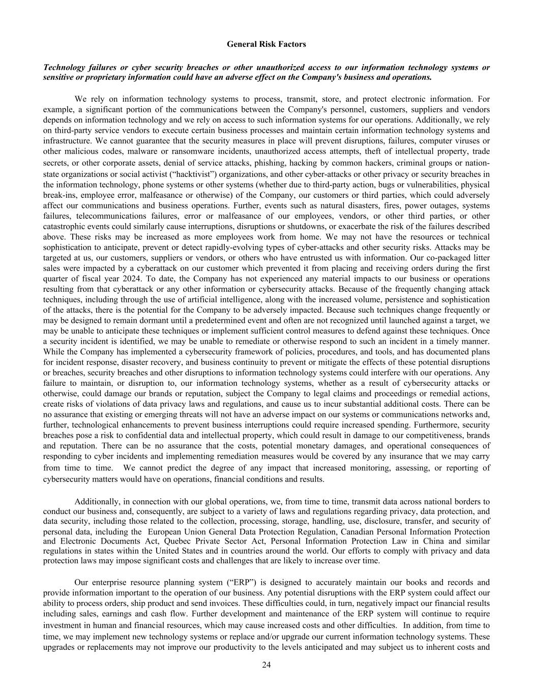 General Risk Factors Technology failures or cyber security breaches or other unauthorized access to our information technology systems or sensitive or proprietary information could have an adverse effect on the Company's business and operations. We rely on information technology systems to process, transmit, store, and protect electronic information. For example, a significant portion of the communications between the Company's personnel, customers, suppliers and vendors depends on information technology and we rely on access to such information systems for our operations. Additionally, we rely on third-party service vendors to execute certain business processes and maintain certain information technology systems and infrastructure. We cannot guarantee that the security measures in place will prevent disruptions, failures, computer viruses or other malicious codes, malware or ransomware incidents, unauthorized access attempts, theft of intellectual property, trade secrets, or other corporate assets, denial of service attacks, phishing, hacking by common hackers, criminal groups or nation- state organizations or social activist (“hacktivist”) organizations, and other cyber-attacks or other privacy or security breaches in the information technology, phone systems or other systems (whether due to third-party action, bugs or vulnerabilities, physical break-ins, employee error, malfeasance or otherwise) of the Company, our customers or third parties, which could adversely affect our communications and business operations. Further, events such as natural disasters, fires, power outages, systems failures, telecommunications failures, error or malfeasance of our employees, vendors, or other third parties, or other catastrophic events could similarly cause interruptions, disruptions or shutdowns, or exacerbate the risk of the failures described above. These risks may be increased as more employees work from home. We may not have the resources or technical sophistication to anticipate, prevent or detect rapidly-evolving types of cyber-attacks and other security risks. Attacks may be targeted at us, our customers, suppliers or vendors, or others who have entrusted us with information. Our co-packaged litter sales were impacted by a cyberattack on our customer which prevented it from placing and receiving orders during the first quarter of fiscal year 2024. To date, the Company has not experienced any material impacts to our business or operations resulting from that cyberattack or any other information or cybersecurity attacks. Because of the frequently changing attack techniques, including through the use of artificial intelligence, along with the increased volume, persistence and sophistication of the attacks, there is the potential for the Company to be adversely impacted. Because such techniques change frequently or may be designed to remain dormant until a predetermined event and often are not recognized until launched against a target, we may be unable to anticipate these techniques or implement sufficient control measures to defend against these techniques. Once a security incident is identified, we may be unable to remediate or otherwise respond to such an incident in a timely manner. While the Company has implemented a cybersecurity framework of policies, procedures, and tools, and has documented plans for incident response, disaster recovery, and business continuity to prevent or mitigate the effects of these potential disruptions or breaches, security breaches and other disruptions to information technology systems could interfere with our operations. Any failure to maintain, or disruption to, our information technology systems, whether as a result of cybersecurity attacks or otherwise, could damage our brands or reputation, subject the Company to legal claims and proceedings or remedial actions, create risks of violations of data privacy laws and regulations, and cause us to incur substantial additional costs. There can be no assurance that existing or emerging threats will not have an adverse impact on our systems or communications networks and, further, technological enhancements to prevent business interruptions could require increased spending. Furthermore, security breaches pose a risk to confidential data and intellectual property, which could result in damage to our competitiveness, brands and reputation. There can be no assurance that the costs, potential monetary damages, and operational consequences of responding to cyber incidents and implementing remediation measures would be covered by any insurance that we may carry from time to time. We cannot predict the degree of any impact that increased monitoring, assessing, or reporting of cybersecurity matters would have on operations, financial conditions and results. Additionally, in connection with our global operations, we, from time to time, transmit data across national borders to conduct our business and, consequently, are subject to a variety of laws and regulations regarding privacy, data protection, and data security, including those related to the collection, processing, storage, handling, use, disclosure, transfer, and security of personal data, including the European Union General Data Protection Regulation, Canadian Personal Information Protection and Electronic Documents Act, Quebec Private Sector Act, Personal Information Protection Law in China and similar regulations in states within the United States and in countries around the world. Our efforts to comply with privacy and data protection laws may impose significant costs and challenges that are likely to increase over time. Our enterprise resource planning system (“ERP”) is designed to accurately maintain our books and records and provide information important to the operation of our business. Any potential disruptions with the ERP system could affect our ability to process orders, ship product and send invoices. These difficulties could, in turn, negati