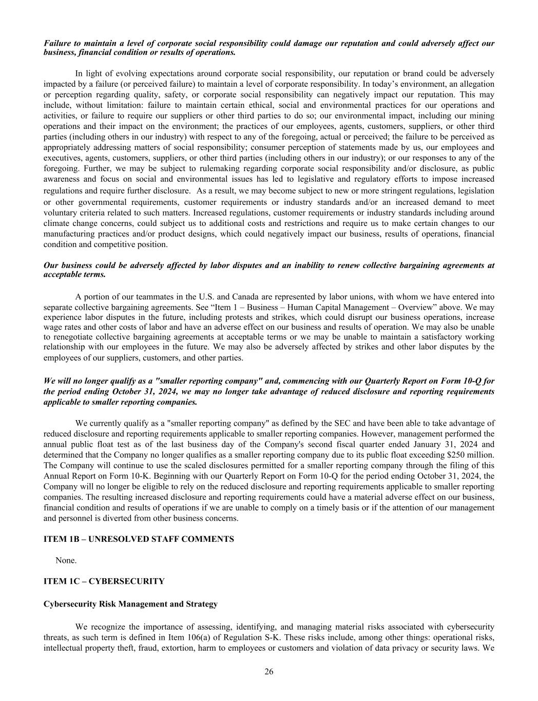 Failure to maintain a level of corporate social responsibility could damage our reputation and could adversely affect our business, financial condition or results of operations. In light of evolving expectations around corporate social responsibility, our reputation or brand could be adversely impacted by a failure (or perceived failure) to maintain a level of corporate responsibility. In today’s environment, an allegation or perception regarding quality, safety, or corporate social responsibility can negatively impact our reputation. This may include, without limitation: failure to maintain certain ethical, social and environmental practices for our operations and activities, or failure to require our suppliers or other third parties to do so; our environmental impact, including our mining operations and their impact on the environment; the practices of our employees, agents, customers, suppliers, or other third parties (including others in our industry) with respect to any of the foregoing, actual or perceived; the failure to be perceived as appropriately addressing matters of social responsibility; consumer perception of statements made by us, our employees and executives, agents, customers, suppliers, or other third parties (including others in our industry); or our responses to any of the foregoing. Further, we may be subject to rulemaking regarding corporate social responsibility and/or disclosure, as public awareness and focus on social and environmental issues has led to legislative and regulatory efforts to impose increased regulations and require further disclosure. As a result, we may become subject to new or more stringent regulations, legislation or other governmental requirements, customer requirements or industry standards and/or an increased demand to meet voluntary criteria related to such matters. Increased regulations, customer requirements or industry standards including around climate change concerns, could subject us to additional costs and restrictions and require us to make certain changes to our manufacturing practices and/or product designs, which could negatively impact our business, results of operations, financial condition and competitive position. Our business could be adversely affected by labor disputes and an inability to renew collective bargaining agreements at acceptable terms. A portion of our teammates in the U.S. and Canada are represented by labor unions, with whom we have entered into separate collective bargaining agreements. See “Item 1 – Business – Human Capital Management – Overview” above. We may experience labor disputes in the future, including protests and strikes, which could disrupt our business operations, increase wage rates and other costs of labor and have an adverse effect on our business and results of operation. We may also be unable to renegotiate collective bargaining agreements at acceptable terms or we may be unable to maintain a satisfactory working relationship with our employees in the future. We may also be adversely affected by strikes and other labor disputes by the employees of our suppliers, customers, and other parties. We will no longer qualify as a "smaller reporting company" and, commencing with our Quarterly Report on Form 10-Q for the period ending October 31, 2024, we may no longer take advantage of reduced disclosure and reporting requirements applicable to smaller reporting companies. We currently qualify as a "smaller reporting company" as defined by the SEC and have been able to take advantage of reduced disclosure and reporting requirements applicable to smaller reporting companies. However, management performed the annual public float test as of the last business day of the Company's second fiscal quarter ended January 31, 2024 and determined that the Company no longer qualifies as a smaller reporting company due to its public float exceeding $250 million. The Company will continue to use the scaled disclosures permitted for a smaller reporting company through the filing of this Annual Report on Form 10-K. Beginning with our Quarterly Report on Form 10-Q for the period ending October 31, 2024, the Company will no longer be eligible to rely on the reduced disclosure and reporting requirements applicable to smaller reporting companies. The resulting increased disclosure and reporting requirements could have a material adverse effect on our business, financial condition and results of operations if we are unable to comply on a timely basis or if the attention of our management and personnel is diverted from other business concerns. ITEM 1B – UNRESOLVED STAFF COMMENTS None. ITEM 1C – CYBERSECURITY Cybersecurity Risk Management and Strategy We recognize the importance of assessing, identifying, and managing material risks associated with cybersecurity threats, as such term is defined in Item 106(a) of Regulation S-K. These risks include, among other things: operational risks, intellectual property theft, fraud, extortion, harm to employees or customers and violation of data privacy or security laws. We 26