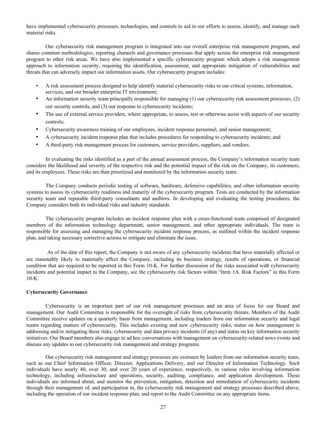 have implemented cybersecurity processes, technologies, and controls to aid in our efforts to assess, identify, and manage such material risks. Our cybersecurity risk management program is integrated into our overall enterprise risk management program, and shares common methodologies, reporting channels and governance processes that apply across the enterprise risk management program to other risk areas. We have also implemented a specific cybersecurity program which adopts a risk management approach to information security, requiring the identification, assessment, and appropriate mitigation of vulnerabilities and threats that can adversely impact our information assets. Our cybersecurity program includes: • A risk assessment process designed to help identify material cybersecurity risks to our critical systems, information, services, and our broader enterprise IT environment; • An information security team principally responsible for managing (1) our cybersecurity risk assessment processes, (2) our security controls, and (3) our response to cybersecurity incidents; • The use of external service providers, where appropriate, to assess, test or otherwise assist with aspects of our security controls; • Cybersecurity awareness training of our employees, incident response personnel, and senior management; • A cybersecurity incident response plan that includes procedures for responding to cybersecurity incidents; and • A third-party risk management process for customers, service providers, suppliers, and vendors. In evaluating the risks identified as a part of the annual assessment process, the Company’s information security team considers the likelihood and severity of the respective risk and the potential impact of the risk on the Company, its customers, and its employees. These risks are then prioritized and monitored by the information security team. The Company conducts periodic testing of software, hardware, defensive capabilities, and other information security systems to assess its cybersecurity readiness and maturity of the cybersecurity program. Tests are conducted by the information security team and reputable third-party consultants and auditors. In developing and evaluating the testing procedures, the Company considers both its individual risks and industry standards. The cybersecurity program includes an incident response plan with a cross-functional team comprised of designated members of the information technology department, senior management, and other appropriate individuals. The team is responsible for assessing and managing the cybersecurity incident response process, as outlined within the incident response plan, and taking necessary corrective actions to mitigate and eliminate the issue. As of the date of this report, the Company is not aware of any cybersecurity incidents that have materially affected or are reasonably likely to materially affect the Company, including its business strategy, results of operations, or financial condition that are required to be reported in this Form 10-K. For further discussion of the risks associated with cybersecurity incidents and potential impact to the Company, see the cybersecurity risk factors within “Item 1A. Risk Factors” in this Form 10-K. Cybersecurity Governance Cybersecurity is an important part of our risk management processes and an area of focus for our Board and management. Our Audit Committee is responsible for the oversight of risks from cybersecurity threats. Members of the Audit Committee receive updates on a quarterly basis from management, including leaders from our information security and legal teams regarding matters of cybersecurity. This includes existing and new cybersecurity risks, status on how management is addressing and/or mitigating those risks, cybersecurity and data privacy incidents (if any) and status on key information security initiatives. Our Board members also engage in ad hoc conversations with management on cybersecurity-related news events and discuss any updates to our cybersecurity risk management and strategy programs. Our cybersecurity risk management and strategy processes are overseen by leaders from our information security team, such as our Chief Information Officer, Director, Applications Delivery, and our Director of Information Technology. Such individuals have nearly 40, over 30, and over 20 years of experience, respectively, in various roles involving information technology, including infrastructure and operations, security, auditing, compliance, and application development. These individuals are informed about, and monitor the prevention, mitigation, detection and remediation of cybersecurity incidents through their management of, and participation in, the cybersecurity risk management and strategy processes described above, including the operation of our incident response plan, and report to the Audit Committee on any appropriate items. 27