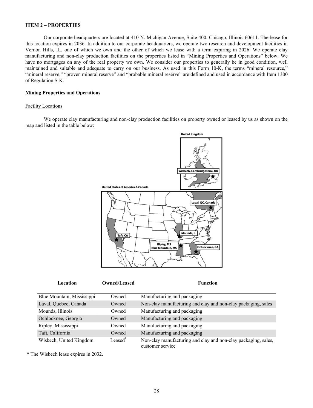 ITEM 2 – PROPERTIES Our corporate headquarters are located at 410 N. Michigan Avenue, Suite 400, Chicago, Illinois 60611. The lease for this location expires in 2036. In addition to our corporate headquarters, we operate two research and development facilities in Vernon Hills, IL, one of which we own and the other of which we lease with a term expiring in 2026. We operate clay manufacturing and non-clay production facilities on the properties listed in “Mining Properties and Operations” below. We have no mortgages on any of the real property we own. We consider our properties to generally be in good condition, well maintained and suitable and adequate to carry on our business. As used in this Form 10-K, the terms “mineral resource,” “mineral reserve,” “proven mineral reserve” and “probable mineral reserve” are defined and used in accordance with Item 1300 of Regulation S-K. Mining Properties and Operations Facility Locations We operate clay manufacturing and non-clay production facilities on property owned or leased by us as shown on the map and listed in the table below: Location Owned/Leased Function Blue Mountain, Mississippi Owned Manufacturing and packaging Laval, Quebec, Canada Owned Non-clay manufacturing and clay and non-clay packaging, sales Mounds, Illinois Owned Manufacturing and packaging Ochlocknee, Georgia Owned Manufacturing and packaging Ripley, Mississippi Owned Manufacturing and packaging Taft, California Owned Manufacturing and packaging Wisbech, United Kingdom Leased* Non-clay manufacturing and clay and non-clay packaging, sales, customer service * The Wisbech lease expires in 2032. 28