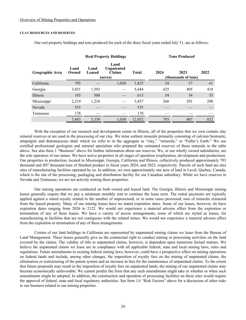 Overview of Mining Properties and Operations CLAY RESOURCES AND RESERVES Our real property holdings and tons produced for each of the three fiscal years ended July 31, are as follows: Real Property Holdings Tons Produced Geographic Area Land Owned Land Leased Land Unpatented Claims Total 2024 2023 2022 (acres) (thousands of tons) California 795 — 1,030 1,825 54 57 61 Georgia 3,851 1,593 — 5,444 425 405 418 Illinois 105 508 — 613 54 54 55 Mississippi 2,219 1,238 — 3,457 260 291 298 Nevada 535 — — 535 — — — Tennessee 178 — — 178 — — — 7,683 3,339 1,030 12,052 793 807 832 With the exception of our research and development center in Illinois, all of the properties that we own contain clay mineral reserves or are used in the processing of our clay. We mine sorbent minerals primarily consisting of calcium bentonite, attapulgite and diatomaceous shale which we refer to in the aggregate as “clay,” “minerals,” or “Fuller’s Earth.” We use certified professional geologists and mineral specialists who prepared the estimated reserves of these minerals in the table above. See also Item 1 “Business” above for further information about our reserves. We, or our wholly owned subsidiaries, are the sole operators of our mines. We have active properties in all stages of operation (exploration, development and production). Our properties in production, located in Mississippi, Georgia, California and Illinois, collectively produced approximately 793 thousand and 807 thousand tons of finished product in fiscal years 2024, and 2023, respectively. Parcels of such land are also sites of manufacturing facilities operated by us. In addition, we own approximately one acre of land in Laval, Quebec, Canada, which is the site of the processing, packaging and distribution facility for our Canadian subsidiary. While we have reserves in Nevada and Tennessee, we are not actively mining these properties. Our mining operations are conducted on both owned and leased land. The Georgia, Illinois and Mississippi mining leases generally require that we pay a minimum monthly rent to continue the lease term. The rental payments are typically applied against a stated royalty related to the number of unprocessed, or in some cases processed, tons of minerals extracted from the leased property. Many of our mining leases have no stated expiration dates. Some of our leases, however, do have expiration dates ranging from 2026 to 2122. We would not experience a material adverse effect from the expiration or termination of any of these leases. We have a variety of access arrangements, some of which are styled as leases, for manufacturing at facilities that are not contiguous with the related mines. We would not experience a material adverse effect from the expiration or termination of any of these arrangements. Certain of our land holdings in California are represented by unpatented mining claims we lease from the Bureau of Land Management. These leases generally give us the contractual right to conduct mining or processing activities on the land covered by the claims. The validity of title to unpatented claims, however, is dependent upon numerous factual matters. We believe the unpatented claims we lease are in compliance with all applicable federal, state and local mining laws, rules and regulations. Future amendments to existing federal mining laws, however, could have a prospective effect on mining operations on federal lands and include, among other changes, the imposition of royalty fees on the mining of unpatented claims, the elimination or restructuring of the patent system and an increase in fees for the maintenance of unpatented claims. To the extent that future proposals may result in the imposition of royalty fees on unpatented lands, the mining of our unpatented claims may become economically unfavorable. We cannot predict the form that any such amendments might take or whether or when such amendments might be adopted. In addition, the construction and operation of processing facilities on these sites would require the approval of federal, state and local regulatory authorities. See Item 1A “Risk Factors” above for a discussion of other risks to our business related to our mining properties. 29