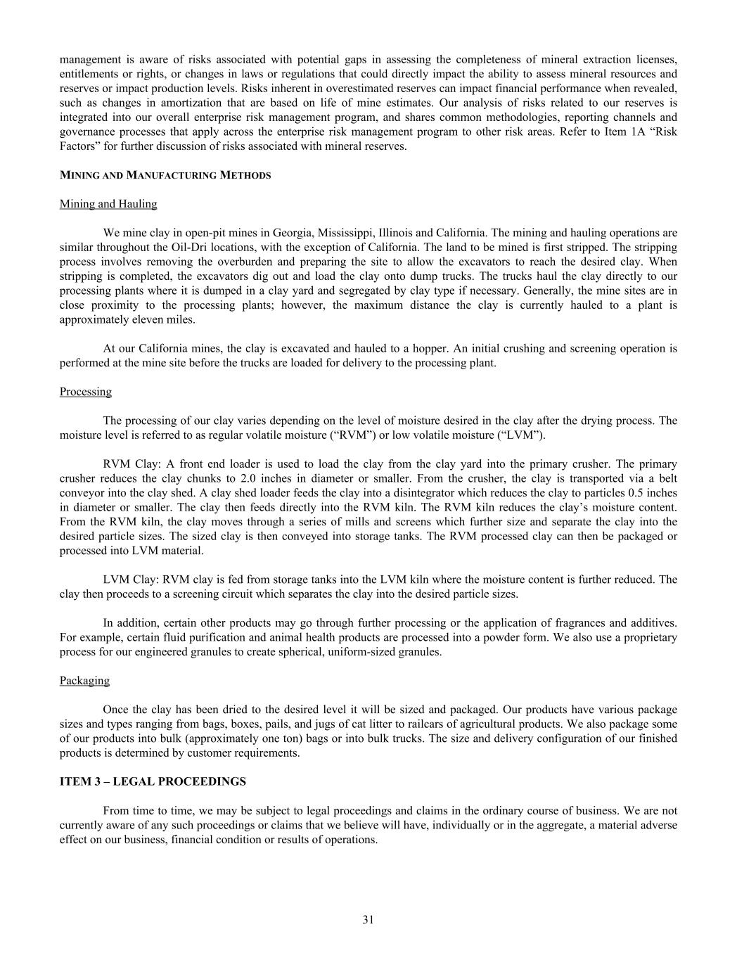management is aware of risks associated with potential gaps in assessing the completeness of mineral extraction licenses, entitlements or rights, or changes in laws or regulations that could directly impact the ability to assess mineral resources and reserves or impact production levels. Risks inherent in overestimated reserves can impact financial performance when revealed, such as changes in amortization that are based on life of mine estimates. Our analysis of risks related to our reserves is integrated into our overall enterprise risk management program, and shares common methodologies, reporting channels and governance processes that apply across the enterprise risk management program to other risk areas. Refer to Item 1A “Risk Factors” for further discussion of risks associated with mineral reserves. MINING AND MANUFACTURING METHODS Mining and Hauling We mine clay in open-pit mines in Georgia, Mississippi, Illinois and California. The mining and hauling operations are similar throughout the Oil-Dri locations, with the exception of California. The land to be mined is first stripped. The stripping process involves removing the overburden and preparing the site to allow the excavators to reach the desired clay. When stripping is completed, the excavators dig out and load the clay onto dump trucks. The trucks haul the clay directly to our processing plants where it is dumped in a clay yard and segregated by clay type if necessary. Generally, the mine sites are in close proximity to the processing plants; however, the maximum distance the clay is currently hauled to a plant is approximately eleven miles. At our California mines, the clay is excavated and hauled to a hopper. An initial crushing and screening operation is performed at the mine site before the trucks are loaded for delivery to the processing plant. Processing The processing of our clay varies depending on the level of moisture desired in the clay after the drying process. The moisture level is referred to as regular volatile moisture (“RVM”) or low volatile moisture (“LVM”). RVM Clay: A front end loader is used to load the clay from the clay yard into the primary crusher. The primary crusher reduces the clay chunks to 2.0 inches in diameter or smaller. From the crusher, the clay is transported via a belt conveyor into the clay shed. A clay shed loader feeds the clay into a disintegrator which reduces the clay to particles 0.5 inches in diameter or smaller. The clay then feeds directly into the RVM kiln. The RVM kiln reduces the clay’s moisture content. From the RVM kiln, the clay moves through a series of mills and screens which further size and separate the clay into the desired particle sizes. The sized clay is then conveyed into storage tanks. The RVM processed clay can then be packaged or processed into LVM material. LVM Clay: RVM clay is fed from storage tanks into the LVM kiln where the moisture content is further reduced. The clay then proceeds to a screening circuit which separates the clay into the desired particle sizes. In addition, certain other products may go through further processing or the application of fragrances and additives. For example, certain fluid purification and animal health products are processed into a powder form. We also use a proprietary process for our engineered granules to create spherical, uniform-sized granules. Packaging Once the clay has been dried to the desired level it will be sized and packaged. Our products have various package sizes and types ranging from bags, boxes, pails, and jugs of cat litter to railcars of agricultural products. We also package some of our products into bulk (approximately one ton) bags or into bulk trucks. The size and delivery configuration of our finished products is determined by customer requirements. ITEM 3 – LEGAL PROCEEDINGS From time to time, we may be subject to legal proceedings and claims in the ordinary course of business. We are not currently aware of any such proceedings or claims that we believe will have, individually or in the aggregate, a material adverse effect on our business, financial condition or results of operations. 31