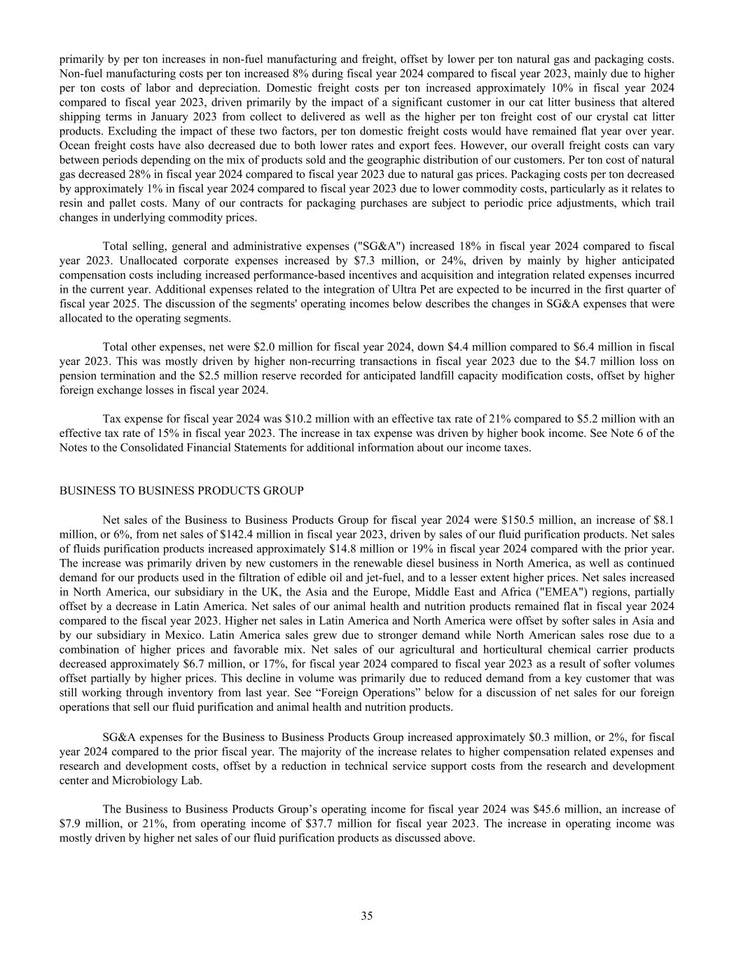 primarily by per ton increases in non-fuel manufacturing and freight, offset by lower per ton natural gas and packaging costs. Non-fuel manufacturing costs per ton increased 8% during fiscal year 2024 compared to fiscal year 2023, mainly due to higher per ton costs of labor and depreciation. Domestic freight costs per ton increased approximately 10% in fiscal year 2024 compared to fiscal year 2023, driven primarily by the impact of a significant customer in our cat litter business that altered shipping terms in January 2023 from collect to delivered as well as the higher per ton freight cost of our crystal cat litter products. Excluding the impact of these two factors, per ton domestic freight costs would have remained flat year over year. Ocean freight costs have also decreased due to both lower rates and export fees. However, our overall freight costs can vary between periods depending on the mix of products sold and the geographic distribution of our customers. Per ton cost of natural gas decreased 28% in fiscal year 2024 compared to fiscal year 2023 due to natural gas prices. Packaging costs per ton decreased by approximately 1% in fiscal year 2024 compared to fiscal year 2023 due to lower commodity costs, particularly as it relates to resin and pallet costs. Many of our contracts for packaging purchases are subject to periodic price adjustments, which trail changes in underlying commodity prices. Total selling, general and administrative expenses ("SG&A") increased 18% in fiscal year 2024 compared to fiscal year 2023. Unallocated corporate expenses increased by $7.3 million, or 24%, driven by mainly by higher anticipated compensation costs including increased performance-based incentives and acquisition and integration related expenses incurred in the current year. Additional expenses related to the integration of Ultra Pet are expected to be incurred in the first quarter of fiscal year 2025. The discussion of the segments' operating incomes below describes the changes in SG&A expenses that were allocated to the operating segments. Total other expenses, net were $2.0 million for fiscal year 2024, down $4.4 million compared to $6.4 million in fiscal year 2023. This was mostly driven by higher non-recurring transactions in fiscal year 2023 due to the $4.7 million loss on pension termination and the $2.5 million reserve recorded for anticipated landfill capacity modification costs, offset by higher foreign exchange losses in fiscal year 2024. Tax expense for fiscal year 2024 was $10.2 million with an effective tax rate of 21% compared to $5.2 million with an effective tax rate of 15% in fiscal year 2023. The increase in tax expense was driven by higher book income. See Note 6 of the Notes to the Consolidated Financial Statements for additional information about our income taxes. BUSINESS TO BUSINESS PRODUCTS GROUP Net sales of the Business to Business Products Group for fiscal year 2024 were $150.5 million, an increase of $8.1 million, or 6%, from net sales of $142.4 million in fiscal year 2023, driven by sales of our fluid purification products. Net sales of fluids purification products increased approximately $14.8 million or 19% in fiscal year 2024 compared with the prior year. The increase was primarily driven by new customers in the renewable diesel business in North America, as well as continued demand for our products used in the filtration of edible oil and jet-fuel, and to a lesser extent higher prices. Net sales increased in North America, our subsidiary in the UK, the Asia and the Europe, Middle East and Africa ("EMEA") regions, partially offset by a decrease in Latin America. Net sales of our animal health and nutrition products remained flat in fiscal year 2024 compared to the fiscal year 2023. Higher net sales in Latin America and North America were offset by softer sales in Asia and by our subsidiary in Mexico. Latin America sales grew due to stronger demand while North American sales rose due to a combination of higher prices and favorable mix. Net sales of our agricultural and horticultural chemical carrier products decreased approximately $6.7 million, or 17%, for fiscal year 2024 compared to fiscal year 2023 as a result of softer volumes offset partially by higher prices. This decline in volume was primarily due to reduced demand from a key customer that was still working through inventory from last year. See “Foreign Operations” below for a discussion of net sales for our foreign operations that sell our fluid purification and animal health and nutrition products. SG&A expenses for the Business to Business Products Group increased approximately $0.3 million, or 2%, for fiscal year 2024 compared to the prior fiscal year. The majority of the increase relates to higher compensation related expenses and research and development costs, offset by a reduction in technical service support costs from the research and development center and Microbiology Lab. The Business to Business Products Group’s operating income for fiscal year 2024 was $45.6 million, an increase of $7.9 million, or 21%, from operating income of $37.7 million for fiscal year 2023. The increase in operating income was mostly driven by higher net sales of our fluid purification products as discussed above. 35