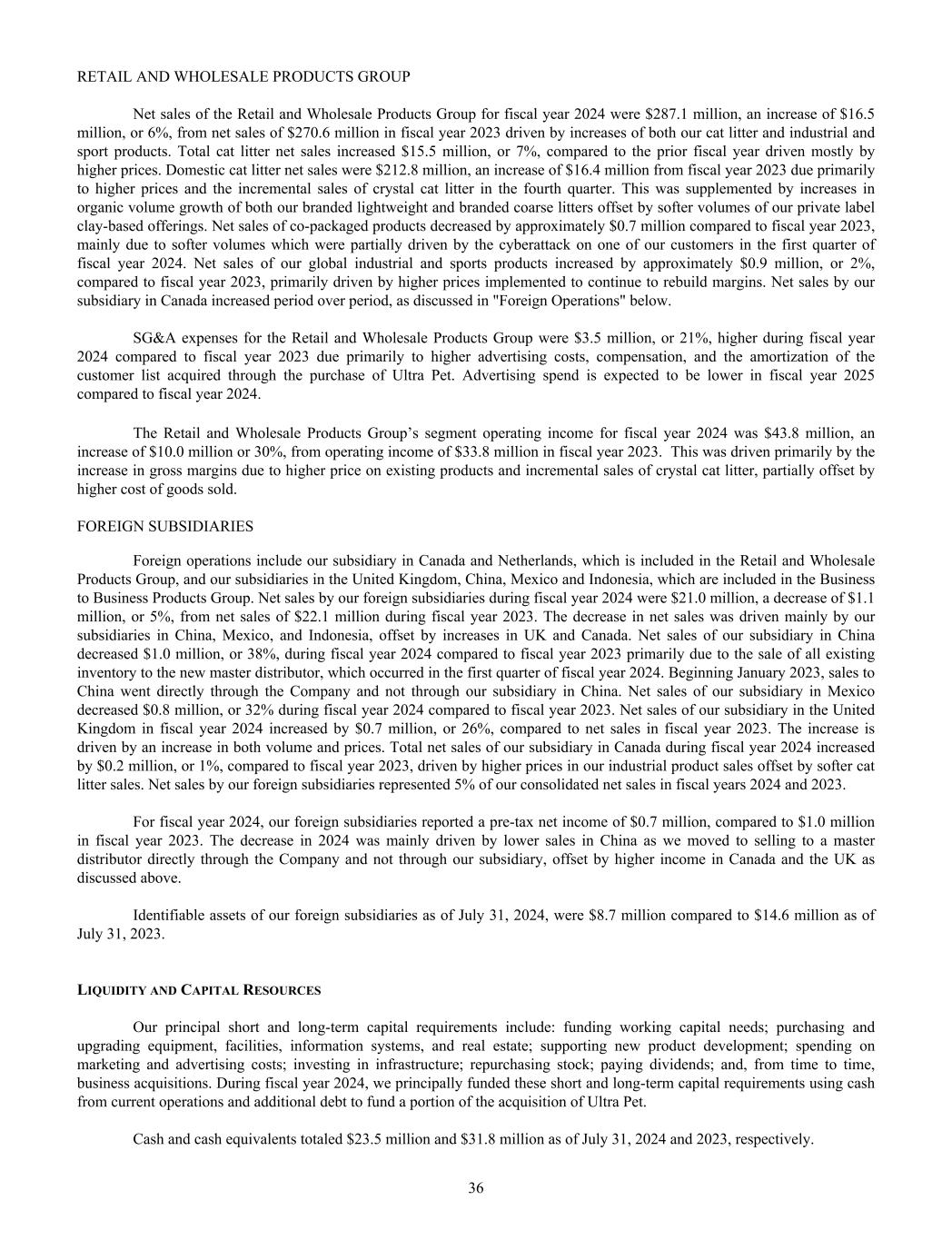 RETAIL AND WHOLESALE PRODUCTS GROUP Net sales of the Retail and Wholesale Products Group for fiscal year 2024 were $287.1 million, an increase of $16.5 million, or 6%, from net sales of $270.6 million in fiscal year 2023 driven by increases of both our cat litter and industrial and sport products. Total cat litter net sales increased $15.5 million, or 7%, compared to the prior fiscal year driven mostly by higher prices. Domestic cat litter net sales were $212.8 million, an increase of $16.4 million from fiscal year 2023 due primarily to higher prices and the incremental sales of crystal cat litter in the fourth quarter. This was supplemented by increases in organic volume growth of both our branded lightweight and branded coarse litters offset by softer volumes of our private label clay-based offerings. Net sales of co-packaged products decreased by approximately $0.7 million compared to fiscal year 2023, mainly due to softer volumes which were partially driven by the cyberattack on one of our customers in the first quarter of fiscal year 2024. Net sales of our global industrial and sports products increased by approximately $0.9 million, or 2%, compared to fiscal year 2023, primarily driven by higher prices implemented to continue to rebuild margins. Net sales by our subsidiary in Canada increased period over period, as discussed in "Foreign Operations" below. SG&A expenses for the Retail and Wholesale Products Group were $3.5 million, or 21%, higher during fiscal year 2024 compared to fiscal year 2023 due primarily to higher advertising costs, compensation, and the amortization of the customer list acquired through the purchase of Ultra Pet. Advertising spend is expected to be lower in fiscal year 2025 compared to fiscal year 2024. The Retail and Wholesale Products Group’s segment operating income for fiscal year 2024 was $43.8 million, an increase of $10.0 million or 30%, from operating income of $33.8 million in fiscal year 2023. This was driven primarily by the increase in gross margins due to higher price on existing products and incremental sales of crystal cat litter, partially offset by higher cost of goods sold. FOREIGN SUBSIDIARIES Foreign operations include our subsidiary in Canada and Netherlands, which is included in the Retail and Wholesale Products Group, and our subsidiaries in the United Kingdom, China, Mexico and Indonesia, which are included in the Business to Business Products Group. Net sales by our foreign subsidiaries during fiscal year 2024 were $21.0 million, a decrease of $1.1 million, or 5%, from net sales of $22.1 million during fiscal year 2023. The decrease in net sales was driven mainly by our subsidiaries in China, Mexico, and Indonesia, offset by increases in UK and Canada. Net sales of our subsidiary in China decreased $1.0 million, or 38%, during fiscal year 2024 compared to fiscal year 2023 primarily due to the sale of all existing inventory to the new master distributor, which occurred in the first quarter of fiscal year 2024. Beginning January 2023, sales to China went directly through the Company and not through our subsidiary in China. Net sales of our subsidiary in Mexico decreased $0.8 million, or 32% during fiscal year 2024 compared to fiscal year 2023. Net sales of our subsidiary in the United Kingdom in fiscal year 2024 increased by $0.7 million, or 26%, compared to net sales in fiscal year 2023. The increase is driven by an increase in both volume and prices. Total net sales of our subsidiary in Canada during fiscal year 2024 increased by $0.2 million, or 1%, compared to fiscal year 2023, driven by higher prices in our industrial product sales offset by softer cat litter sales. Net sales by our foreign subsidiaries represented 5% of our consolidated net sales in fiscal years 2024 and 2023. For fiscal year 2024, our foreign subsidiaries reported a pre-tax net income of $0.7 million, compared to $1.0 million in fiscal year 2023. The decrease in 2024 was mainly driven by lower sales in China as we moved to selling to a master distributor directly through the Company and not through our subsidiary, offset by higher income in Canada and the UK as discussed above. Identifiable assets of our foreign subsidiaries as of July 31, 2024, were $8.7 million compared to $14.6 million as of July 31, 2023. LIQUIDITY AND CAPITAL RESOURCES Our principal short and long-term capital requirements include: funding working capital needs; purchasing and upgrading equipment, facilities, information systems, and real estate; supporting new product development; spending on marketing and advertising costs; investing in infrastructure; repurchasing stock; paying dividends; and, from time to time, business acquisitions. During fiscal year 2024, we principally funded these short and long-term capital requirements using cash from current operations and additional debt to fund a portion of the acquisition of Ultra Pet. Cash and cash equivalents totaled $23.5 million and $31.8 million as of July 31, 2024 and 2023, respectively. 36
