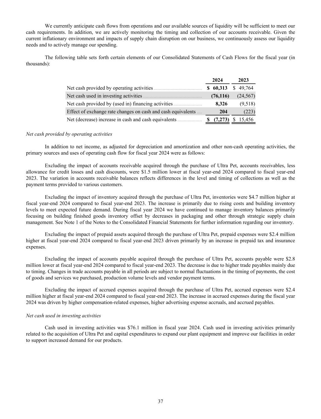We currently anticipate cash flows from operations and our available sources of liquidity will be sufficient to meet our cash requirements. In addition, we are actively monitoring the timing and collection of our accounts receivable. Given the current inflationary environment and impacts of supply chain disruption on our business, we continuously assess our liquidity needs and to actively manage our spending. The following table sets forth certain elements of our Consolidated Statements of Cash Flows for the fiscal year (in thousands): 2024 2023 Net cash provided by operating activities ..................................... $ 60,313 $ 49,764 Net cash used in investing activities ............................................. (76,116) (24,567) Net cash provided by (used in) financing activities ...................... 8,326 (9,518) Effect of exchange rate changes on cash and cash equivalents .... 204 (223) Net (decrease) increase in cash and cash equivalents ................... $ (7,273) $ 15,456 Net cash provided by operating activities In addition to net income, as adjusted for depreciation and amortization and other non-cash operating activities, the primary sources and uses of operating cash flow for fiscal year 2024 were as follows: Excluding the impact of accounts receivable acquired through the purchase of Ultra Pet, accounts receivables, less allowance for credit losses and cash discounts, were $1.5 million lower at fiscal year-end 2024 compared to fiscal year-end 2023. The variation in accounts receivable balances reflects differences in the level and timing of collections as well as the payment terms provided to various customers. Excluding the impact of inventory acquired through the purchase of Ultra Pet, inventories were $4.7 million higher at fiscal year-end 2024 compared to fiscal year-end 2023. The increase is primarily due to rising costs and building inventory levels to meet expected future demand. During fiscal year 2024 we have continued to manage inventory balances primarily focusing on building finished goods inventory offset by decreases in packaging and other through strategic supply chain management. See Note 1 of the Notes to the Consolidated Financial Statements for further information regarding our inventory. Excluding the impact of prepaid assets acquired through the purchase of Ultra Pet, prepaid expenses were $2.4 million higher at fiscal year-end 2024 compared to fiscal year-end 2023 driven primarily by an increase in prepaid tax and insurance expenses. Excluding the impact of accounts payable acquired through the purchase of Ultra Pet, accounts payable were $2.8 million lower at fiscal year-end 2024 compared to fiscal year-end 2023. The decrease is due to higher trade payables mainly due to timing. Changes in trade accounts payable in all periods are subject to normal fluctuations in the timing of payments, the cost of goods and services we purchased, production volume levels and vendor payment terms. Excluding the impact of accrued expenses acquired through the purchase of Ultra Pet, accrued expenses were $2.4 million higher at fiscal year-end 2024 compared to fiscal year-end 2023. The increase in accrued expenses during the fiscal year 2024 was driven by higher compensation-related expenses, higher advertising expense accruals, and accrued payables. Net cash used in investing activities Cash used in investing activities was $76.1 million in fiscal year 2024. Cash used in investing activities primarily related to the acquisition of Ultra Pet and capital expenditures to expand our plant equipment and improve our facilities in order to support increased demand for our products. 37
