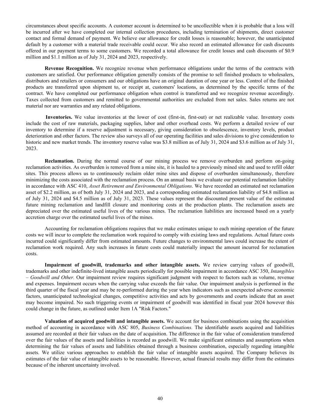 circumstances about specific accounts. A customer account is determined to be uncollectible when it is probable that a loss will be incurred after we have completed our internal collection procedures, including termination of shipments, direct customer contact and formal demand of payment. We believe our allowance for credit losses is reasonable; however, the unanticipated default by a customer with a material trade receivable could occur. We also record an estimated allowance for cash discounts offered in our payment terms to some customers. We recorded a total allowance for credit losses and cash discounts of $0.9 million and $1.1 million as of July 31, 2024 and 2023, respectively. Revenue Recognition. We recognize revenue when performance obligations under the terms of the contracts with customers are satisfied. Our performance obligation generally consists of the promise to sell finished products to wholesalers, distributors and retailers or consumers and our obligations have an original duration of one year or less. Control of the finished products are transferred upon shipment to, or receipt at, customers' locations, as determined by the specific terms of the contract. We have completed our performance obligation when control is transferred and we recognize revenue accordingly. Taxes collected from customers and remitted to governmental authorities are excluded from net sales. Sales returns are not material nor are warranties and any related obligations. Inventories. We value inventories at the lower of cost (first-in, first-out) or net realizable value. Inventory costs include the cost of raw materials, packaging supplies, labor and other overhead costs. We perform a detailed review of our inventory to determine if a reserve adjustment is necessary, giving consideration to obsolescence, inventory levels, product deterioration and other factors. The review also surveys all of our operating facilities and sales divisions to give consideration to historic and new market trends. The inventory reserve value was $3.8 million as of July 31, 2024 and $3.6 million as of July 31, 2023. Reclamation. During the normal course of our mining process we remove overburden and perform on-going reclamation activities. As overburden is removed from a mine site, it is hauled to a previously mined site and used to refill older sites. This process allows us to continuously reclaim older mine sites and dispose of overburden simultaneously, therefore minimizing the costs associated with the reclamation process. On an annual basis we evaluate our potential reclamation liability in accordance with ASC 410, Asset Retirement and Environmental Obligations. We have recorded an estimated net reclamation asset of $2.2 million, as of both July 31, 2024 and 2023, and a corresponding estimated reclamation liability of $4.8 million as of July 31, 2024 and $4.5 million as of July 31, 2023. These values represent the discounted present value of the estimated future mining reclamation and landfill closure and monitoring costs at the production plants. The reclamation assets are depreciated over the estimated useful lives of the various mines. The reclamation liabilities are increased based on a yearly accretion charge over the estimated useful lives of the mines. Accounting for reclamation obligations requires that we make estimates unique to each mining operation of the future costs we will incur to complete the reclamation work required to comply with existing laws and regulations. Actual future costs incurred could significantly differ from estimated amounts. Future changes to environmental laws could increase the extent of reclamation work required. Any such increases in future costs could materially impact the amount incurred for reclamation costs. Impairment of goodwill, trademarks and other intangible assets. We review carrying values of goodwill, trademarks and other indefinite-lived intangible assets periodically for possible impairment in accordance ASC 350, Intangibles – Goodwill and Other. Our impairment review requires significant judgment with respect to factors such as volume, revenue and expenses. Impairment occurs when the carrying value exceeds the fair value. Our impairment analysis is performed in the third quarter of the fiscal year and may be re-performed during the year when indicators such as unexpected adverse economic factors, unanticipated technological changes, competitive activities and acts by governments and courts indicate that an asset may become impaired. No such triggering events or impairment of goodwill was identified in fiscal year 2024 however this could change in the future, as outlined under Item 1A "Risk Factors." Valuation of acquired goodwill and intangible assets. We account for business combinations using the acquisition method of accounting in accordance with ASC 805, Business Combinations. The identifiable assets acquired and liabilities assumed are recorded at their fair values on the date of acquisition. The difference in the fair value of consideration transferred over the fair values of the assets and liabilities is recorded as goodwill. We make significant estimates and assumptions when determining the fair values of assets and liabilities obtained through a business combination, especially regarding intangible assets. We utilize various approaches to establish the fair value of intangible assets acquired. The Company believes its estimates of the fair value of intangible assets to be reasonable. However, actual financial results may differ from the estimates because of the inherent uncertainty involved. 40