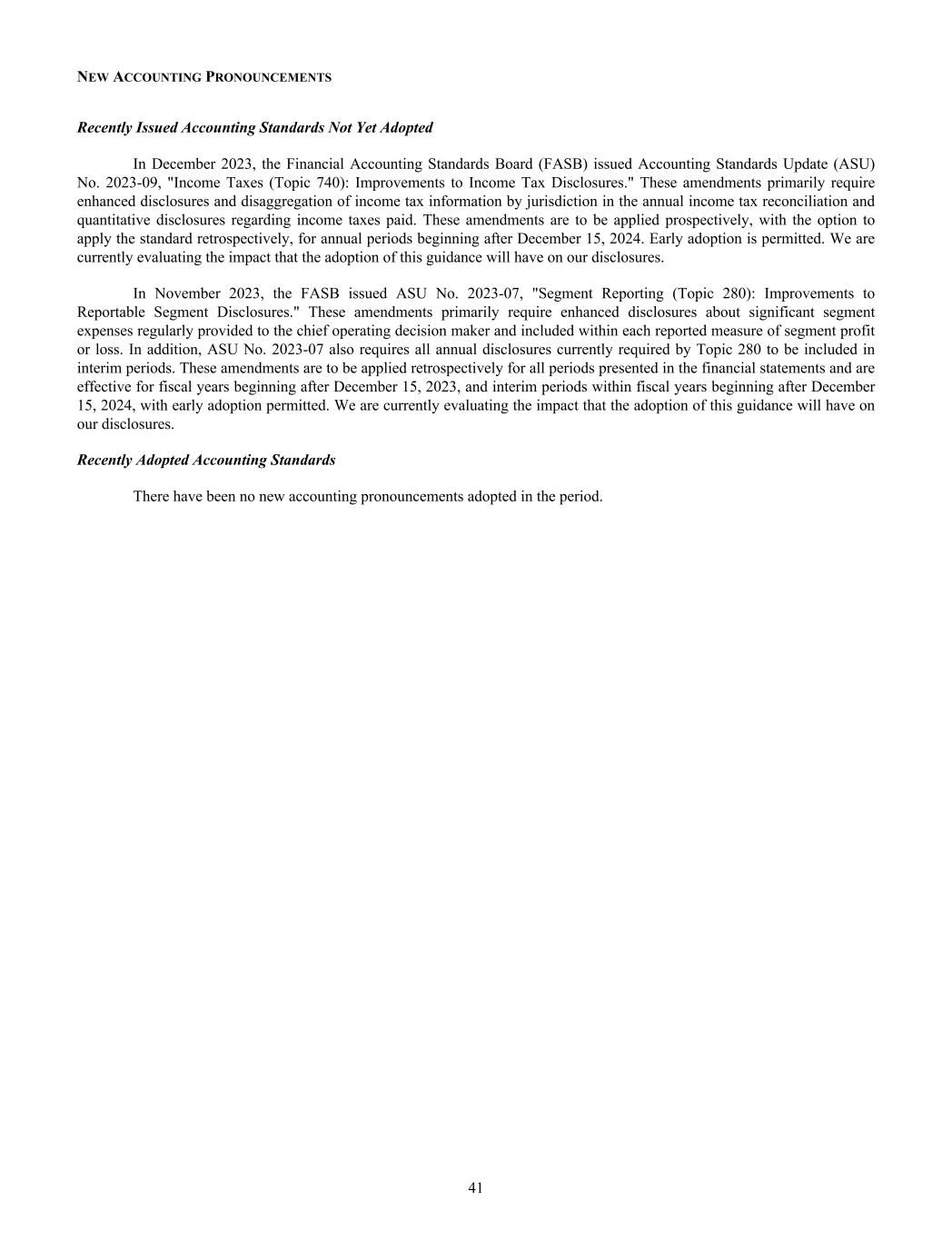 NEW ACCOUNTING PRONOUNCEMENTS Recently Issued Accounting Standards Not Yet Adopted In December 2023, the Financial Accounting Standards Board (FASB) issued Accounting Standards Update (ASU) No. 2023-09, "Income Taxes (Topic 740): Improvements to Income Tax Disclosures." These amendments primarily require enhanced disclosures and disaggregation of income tax information by jurisdiction in the annual income tax reconciliation and quantitative disclosures regarding income taxes paid. These amendments are to be applied prospectively, with the option to apply the standard retrospectively, for annual periods beginning after December 15, 2024. Early adoption is permitted. We are currently evaluating the impact that the adoption of this guidance will have on our disclosures. In November 2023, the FASB issued ASU No. 2023-07, "Segment Reporting (Topic 280): Improvements to Reportable Segment Disclosures." These amendments primarily require enhanced disclosures about significant segment expenses regularly provided to the chief operating decision maker and included within each reported measure of segment profit or loss. In addition, ASU No. 2023-07 also requires all annual disclosures currently required by Topic 280 to be included in interim periods. These amendments are to be applied retrospectively for all periods presented in the financial statements and are effective for fiscal years beginning after December 15, 2023, and interim periods within fiscal years beginning after December 15, 2024, with early adoption permitted. We are currently evaluating the impact that the adoption of this guidance will have on our disclosures. Recently Adopted Accounting Standards There have been no new accounting pronouncements adopted in the period. 41
