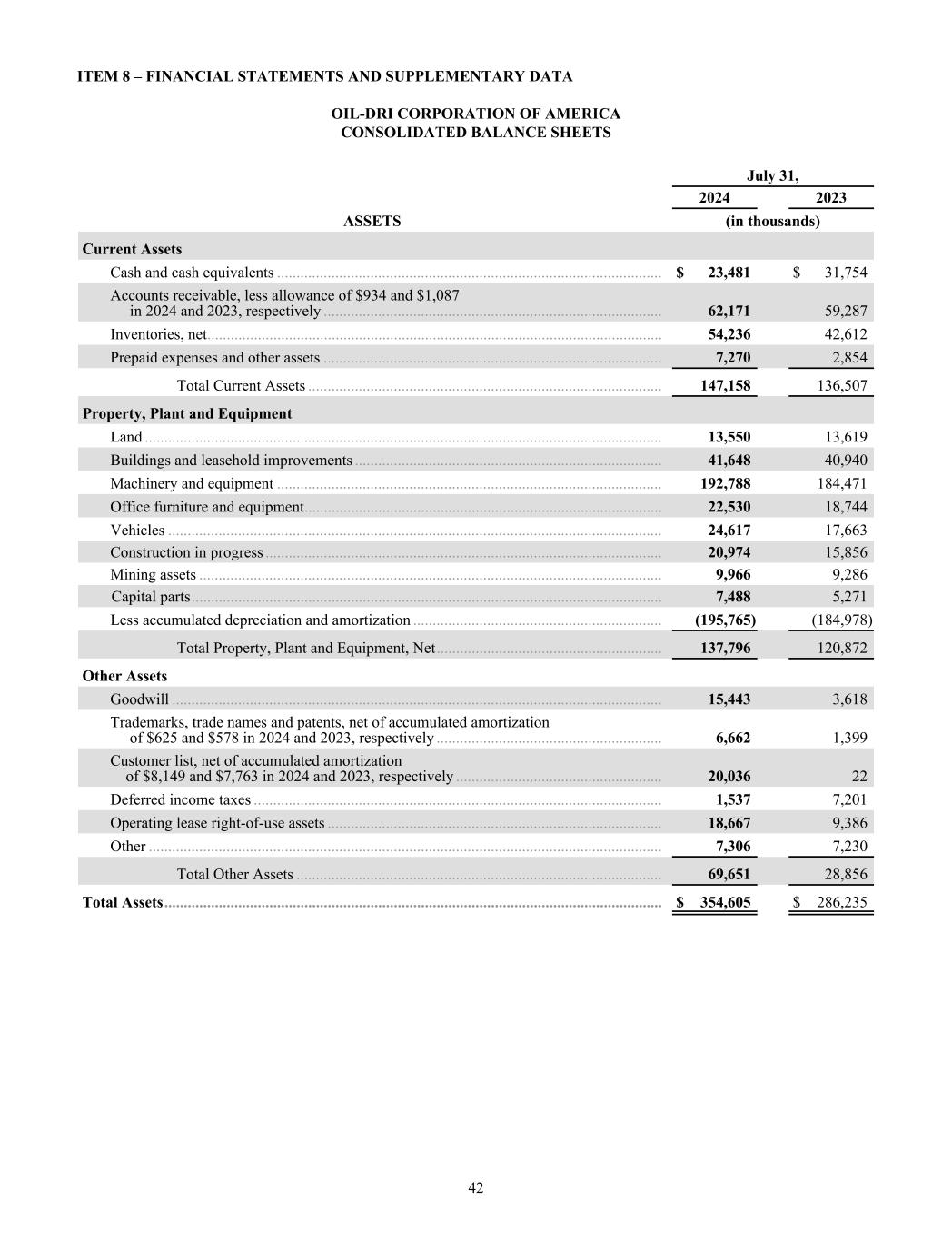ITEM 8 – FINANCIAL STATEMENTS AND SUPPLEMENTARY DATA OIL-DRI CORPORATION OF AMERICA CONSOLIDATED BALANCE SHEETS July 31, 2024 2023 ASSETS (in thousands) Current Assets Cash and cash equivalents ................................................................................................... $ 23,481 $ 31,754 Accounts receivable, less allowance of $934 and $1,087 in 2024 and 2023, respectively ....................................................................................... 62,171 59,287 Inventories, net ..................................................................................................................... 54,236 42,612 Prepaid expenses and other assets ....................................................................................... 7,270 2,854 Total Current Assets ........................................................................................... 147,158 136,507 Property, Plant and Equipment Land ..................................................................................................................................... 13,550 13,619 Buildings and leasehold improvements ............................................................................... 41,648 40,940 Machinery and equipment ................................................................................................... 192,788 184,471 Office furniture and equipment ............................................................................................ 22,530 18,744 Vehicles ............................................................................................................................... 24,617 17,663 Construction in progress ...................................................................................................... 20,974 15,856 Mining assets ....................................................................................................................... 9,966 9,286 Capital parts ......................................................................................................................... 7,488 5,271 Less accumulated depreciation and amortization ................................................................ (195,765) (184,978) Total Property, Plant and Equipment, Net .......................................................... 137,796 120,872 Other Assets Goodwill .............................................................................................................................. 15,443 3,618 Trademarks, trade names and patents, net of accumulated amortization of $625 and $578 in 2024 and 2023, respectively .......................................................... 6,662 1,399 Customer list, net of accumulated amortization of $8,149 and $7,763 in 2024 and 2023, respectively ..................................................... 20,036 22 Deferred income taxes ......................................................................................................... 1,537 7,201 Operating lease right-of-use assets ...................................................................................... 18,667 9,386 Other .................................................................................................................................... 7,306 7,230 Total Other Assets .............................................................................................. 69,651 28,856 Total Assets ................................................................................................................................ $ 354,605 $ 286,235 42