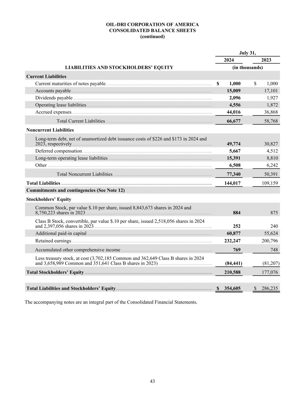 OIL-DRI CORPORATION OF AMERICA CONSOLIDATED BALANCE SHEETS (continued) July 31, 2024 2023 LIABILITIES AND STOCKHOLDERS’ EQUITY (in thousands) Current Liabilities Current maturities of notes payable ..................................................................................... $ 1,000 $ 1,000 Accounts payable ................................................................................................................. 15,009 17,101 Dividends payable ................................................................................................................ 2,096 1,927 Operating lease liabilities ..................................................................................................... 4,556 1,872 Accrued expenses ................................................................................................................ 44,016 36,868 Total Current Liabilities ..................................................................................... 66,677 58,768 Noncurrent Liabilities Long-term debt, net of unamortized debt issuance costs of $226 and $173 in 2024 and 2023, respectively ................................................................................................................ 49,774 30,827 Deferred compensation ........................................................................................................ 5,667 4,512 Long-term operating lease liabilities ................................................................................... 15,391 8,810 Other .................................................................................................................................... 6,508 6,242 Total Noncurrent Liabilities ............................................................................... 77,340 50,391 Total Liabilities ......................................................................................................................... 144,017 109,159 Commitments and contingencies (See Note 12) Stockholders’ Equity Common Stock, par value $.10 per share, issued 8,843,673 shares in 2024 and 8,750,223 shares in 2023 ..................................................................................................... 884 875 Class B Stock, convertible, par value $.10 per share, issued 2,518,056 shares in 2024 and 2,397,056 shares in 2023 ............................................................................................... 252 240 Additional paid-in capital .................................................................................................... 60,877 55,624 Retained earnings ................................................................................................................. 232,247 200,796 Accumulated other comprehensive income ......................................................................... 769 748 Less treasury stock, at cost (3,702,185 Common and 362,649 Class B shares in 2024 and 3,658,989 Common and 351,641 Class B shares in 2023) ........................................... (84,441) (81,207) Total Stockholders’ Equity ...................................................................................................... 210,588 177,076 Total Liabilities and Stockholders’ Equity ............................................................................. $ 354,605 $ 286,235 The accompanying notes are an integral part of the Consolidated Financial Statements. 43