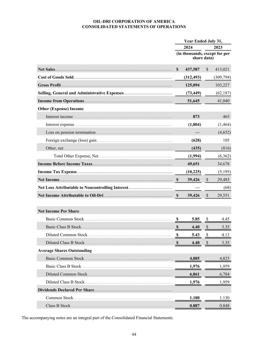 OIL-DRI CORPORATION OF AMERICA CONSOLIDATED STATEMENTS OF OPERATIONS Year Ended July 31, 2024 2023 (in thousands, except for per share data) Net Sales ........................................................................................................... $ 437,587 $ 413,021 Cost of Goods Sold .......................................................................................... (312,493) (309,794) Gross Profit ..................................................................................................... 125,094 103,227 Selling, General and Administrative Expenses ............................................ (73,449) (62,187) Income from Operations ................................................................................ 51,645 41,040 Other (Expense) Income Interest income .......................................................................................... 873 465 Interest expense ......................................................................................... (1,804) (1,464) Loss on pension termination ...................................................................... — (4,652) Foreign exchange (loss) gain ..................................................................... (628) 105 Other, net ................................................................................................... (435) (816) Total Other Expense, Net ................................................................... (1,994) (6,362) Income Before Income Taxes ......................................................................... 49,651 34,678 Income Tax Expense ....................................................................................... (10,225) (5,195) Net Income ....................................................................................................... $ 39,426 $ 29,483 Net Loss Attributable to Noncontrolling Interest ........................................ — (68) Net Income Attributable to Oil-Dri .............................................................. $ 39,426 $ 29,551 Net Income Per Share Basic Common Stock ................................................................................ $ 5.85 $ 4.45 Basic Class B Stock ................................................................................... $ 4.40 $ 3.35 Diluted Common Stock ............................................................................. $ 5.43 $ 4.13 Diluted Class B Stock ................................................................................ $ 4.40 $ 3.35 Average Shares Outstanding Basic Common Stock ................................................................................ 4,885 4,825 Basic Class B Stock .................................................................................. 1,976 1,959 Diluted Common Stock ............................................................................. 6,861 6,784 Diluted Class B Stock ................................................................................ 1,976 1,959 Dividends Declared Per Share ....................................................................... Common Stock .......................................................................................... 1.180 1.130 Class B Stock ............................................................................................. 0.887 0.848 The accompanying notes are an integral part of the Consolidated Financial Statements. 44