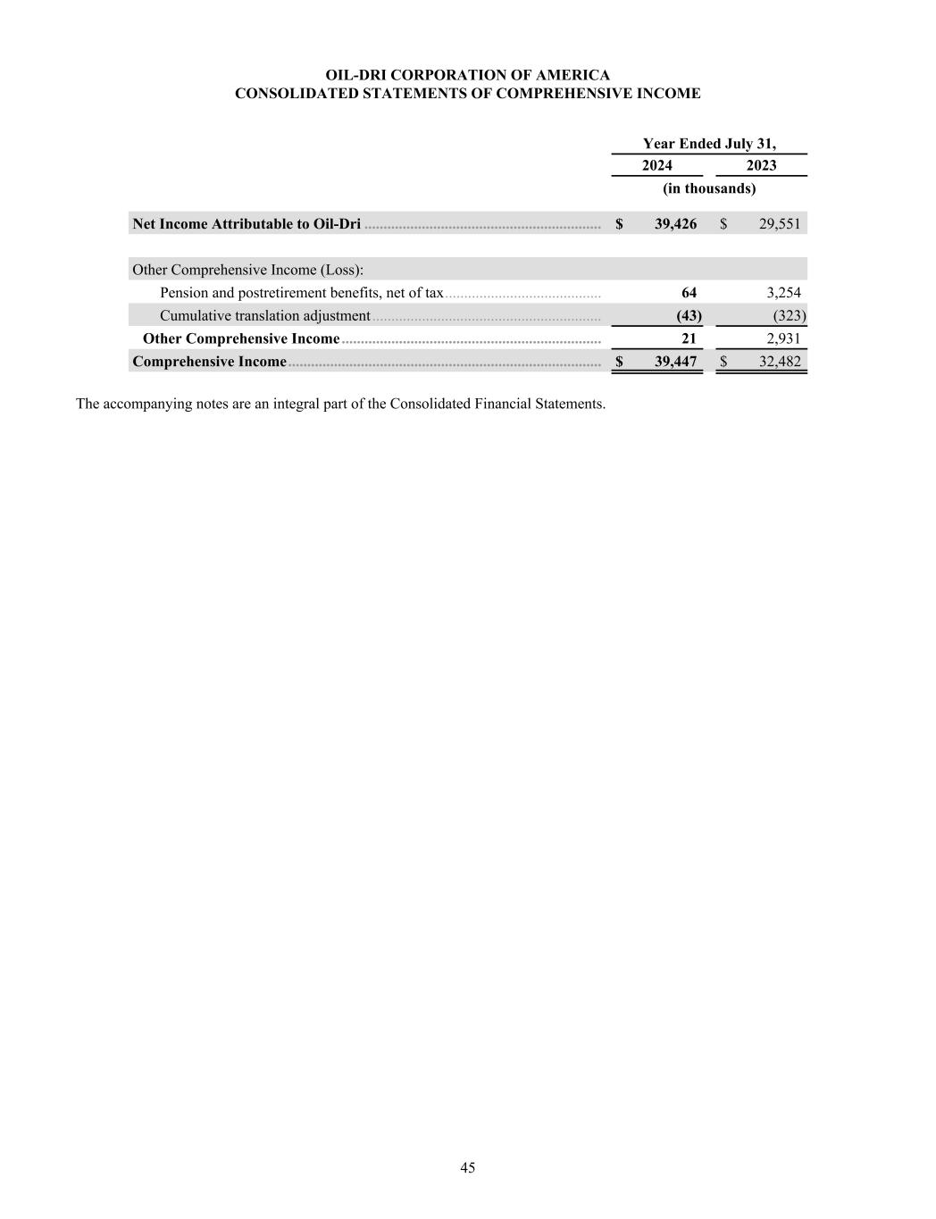 OIL-DRI CORPORATION OF AMERICA CONSOLIDATED STATEMENTS OF COMPREHENSIVE INCOME Year Ended July 31, 2024 2023 (in thousands) Net Income Attributable to Oil-Dri .............................................................. $ 39,426 $ 29,551 Other Comprehensive Income (Loss): Pension and postretirement benefits, net of tax ......................................... 64 3,254 Cumulative translation adjustment ............................................................ (43) (323) Other Comprehensive Income .................................................................... 21 2,931 Comprehensive Income .................................................................................. $ 39,447 $ 32,482 The accompanying notes are an integral part of the Consolidated Financial Statements. 45