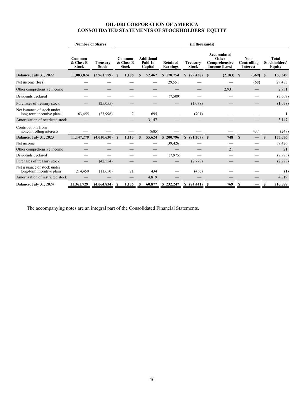 OIL-DRI CORPORATION OF AMERICA CONSOLIDATED STATEMENTS OF STOCKHOLDERS’ EQUITY Number of Shares (in thousands) Common & Class B Stock Treasury Stock Common & Class B Stock Additional Paid-In Capital Retained Earnings Treasury Stock Accumulated Other Comprehensive Income (Loss) Non- Controlling Interest Total Stockholders’ Equity Balance, July 31, 2022 11,083,824 (3,961,579) $ 1,108 $ 52,467 $ 178,754 $ (79,428) $ (2,183) $ (369) $ 150,349 Net income (loss) — — — — 29,551 — — (68) 29,483 Other comprehensive income — — — — — — 2,931 — 2,931 Dividends declared — — — — (7,509) — — — (7,509) Purchases of treasury stock — (25,055) — — — (1,078) — — (1,078) Net issuance of stock under long-term incentive plans 63,455 (23,996) 7 695 — (701) — — 1 Amortization of restricted stock — — — 3,147 — — — — 3,147 Contributions from noncontrolling interests — — — (685) — — — 437 (248) Balance, July 31, 2023 11,147,279 (4,010,630) $ 1,115 $ 55,624 $ 200,796 $ (81,207) $ 748 $ — $ 177,076 Net income — — — — 39,426 — — — 39,426 Other comprehensive income — — — — — — 21 — 21 Dividends declared — — — — (7,975) — — — (7,975) Purchases of treasury stock — (42,554) — — — (2,778) — — (2,778) Net issuance of stock under long-term incentive plans 214,450 (11,650) 21 434 — (456) — — (1) Amortization of restricted stock — — — 4,819 — — — — 4,819 Balance, July 31, 2024 11,361,729 (4,064,834) $ 1,136 $ 60,877 $ 232,247 $ (84,441) $ 769 $ — $ 210,588 The accompanying notes are an integral part of the Consolidated Financial Statements. 46