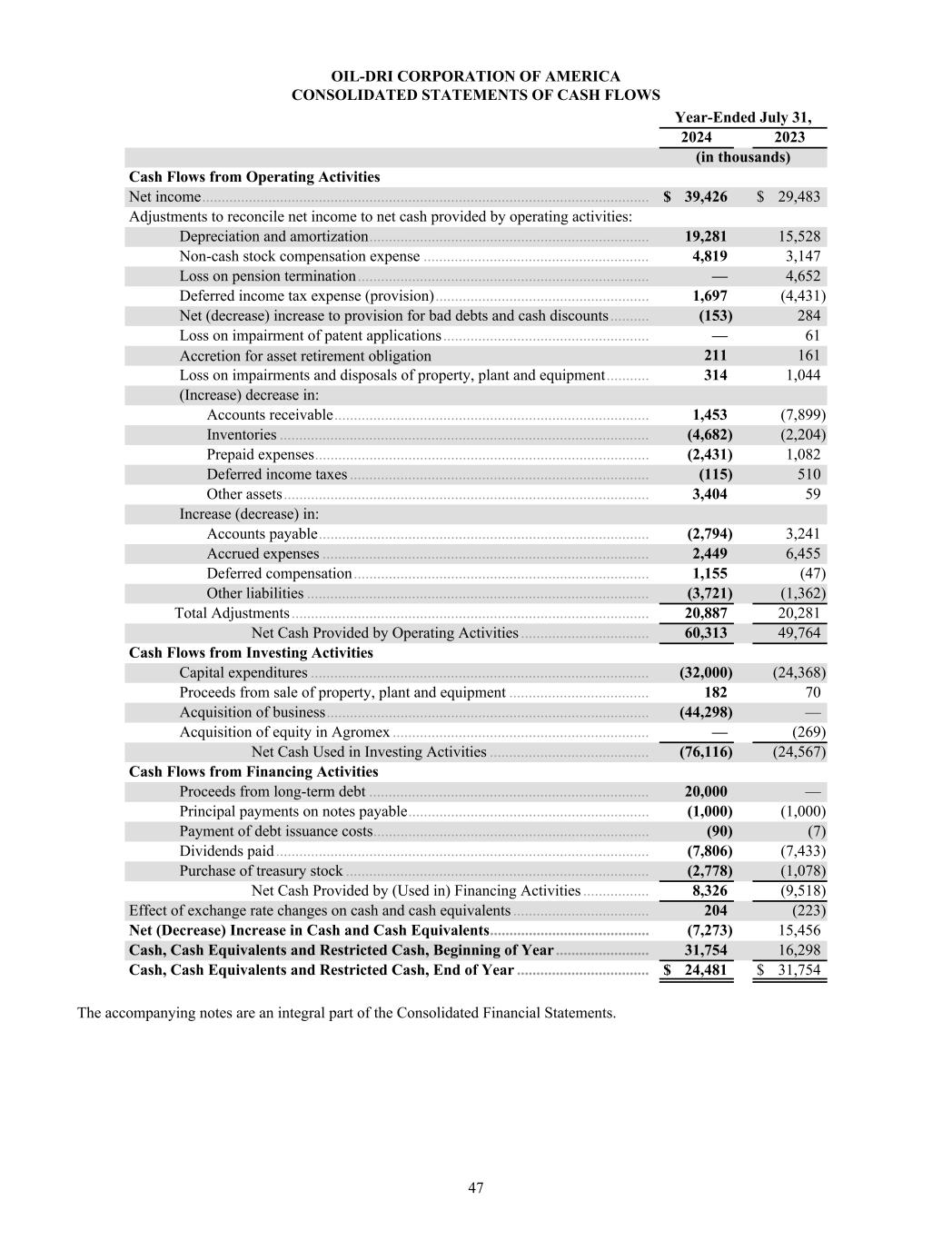 OIL-DRI CORPORATION OF AMERICA CONSOLIDATED STATEMENTS OF CASH FLOWS Year-Ended July 31, 2024 2023 (in thousands) Cash Flows from Operating Activities Net income ................................................................................................................... $ 39,426 $ 29,483 Adjustments to reconcile net income to net cash provided by operating activities: Depreciation and amortization ........................................................................ 19,281 15,528 Non-cash stock compensation expense .......................................................... 4,819 3,147 Loss on pension termination ........................................................................... — 4,652 Deferred income tax expense (provision) ....................................................... 1,697 (4,431) Net (decrease) increase to provision for bad debts and cash discounts .......... (153) 284 Loss on impairment of patent applications ..................................................... — 61 Accretion for asset retirement obligation 211 161 Loss on impairments and disposals of property, plant and equipment ........... 314 1,044 (Increase) decrease in: Accounts receivable ................................................................................. 1,453 (7,899) Inventories ............................................................................................... (4,682) (2,204) Prepaid expenses ...................................................................................... (2,431) 1,082 Deferred income taxes ............................................................................. (115) 510 Other assets .............................................................................................. 3,404 59 Increase (decrease) in: Accounts payable ..................................................................................... (2,794) 3,241 Accrued expenses .................................................................................... 2,449 6,455 Deferred compensation ............................................................................ 1,155 (47) Other liabilities ........................................................................................ (3,721) (1,362) Total Adjustments ............................................................................................ 20,887 20,281 Net Cash Provided by Operating Activities ................................. 60,313 49,764 Cash Flows from Investing Activities Capital expenditures ....................................................................................... (32,000) (24,368) Proceeds from sale of property, plant and equipment .................................... 182 70 Acquisition of business ................................................................................... (44,298) — Acquisition of equity in Agromex .................................................................. — (269) Net Cash Used in Investing Activities ......................................... (76,116) (24,567) Cash Flows from Financing Activities Proceeds from long-term debt ........................................................................ 20,000 — Principal payments on notes payable .............................................................. (1,000) (1,000) Payment of debt issuance costs ....................................................................... (90) (7) Dividends paid ................................................................................................ (7,806) (7,433) Purchase of treasury stock .............................................................................. (2,778) (1,078) Net Cash Provided by (Used in) Financing Activities ................. 8,326 (9,518) Effect of exchange rate changes on cash and cash equivalents ................................... 204 (223) Net (Decrease) Increase in Cash and Cash Equivalents ......................................... (7,273) 15,456 Cash, Cash Equivalents and Restricted Cash, Beginning of Year ........................ 31,754 16,298 Cash, Cash Equivalents and Restricted Cash, End of Year .................................. $ 24,481 $ 31,754 The accompanying notes are an integral part of the Consolidated Financial Statements. 47