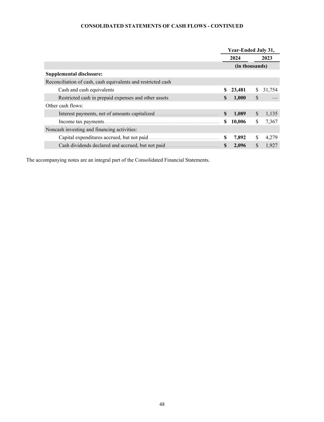 CONSOLIDATED STATEMENTS OF CASH FLOWS - CONTINUED Year-Ended July 31, 2024 2023 (in thousands) Supplemental disclosure: Reconciliation of cash, cash equivalents and restricted cash Cash and cash equivalents $ 23,481 $ 31,754 Restricted cash in prepaid expenses and other assets $ 1,000 $ — Other cash flows: Interest payments, net of amounts capitalized ................................................ $ 1,089 $ 1,135 Income tax payments ....................................................................................... $ 10,006 $ 7,367 Noncash investing and financing activities: Capital expenditures accrued, but not paid ..................................................... $ 7,892 $ 4,279 Cash dividends declared and accrued, but not paid ........................................ $ 2,096 $ 1,927 The accompanying notes are an integral part of the Consolidated Financial Statements. 48
