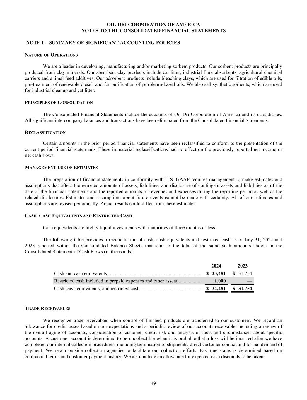 OIL-DRI CORPORATION OF AMERICA NOTES TO THE CONSOLIDATED FINANCIAL STATEMENTS NOTE 1 – SUMMARY OF SIGNIFICANT ACCOUNTING POLICIES NATURE OF OPERATIONS We are a leader in developing, manufacturing and/or marketing sorbent products. Our sorbent products are principally produced from clay minerals. Our absorbent clay products include cat litter, industrial floor absorbents, agricultural chemical carriers and animal feed additives. Our adsorbent products include bleaching clays, which are used for filtration of edible oils, pre-treatment of renewable diesel, and for purification of petroleum-based oils. We also sell synthetic sorbents, which are used for industrial cleanup and cat litter. PRINCIPLES OF CONSOLIDATION The Consolidated Financial Statements include the accounts of Oil-Dri Corporation of America and its subsidiaries. All significant intercompany balances and transactions have been eliminated from the Consolidated Financial Statements. RECLASSIFICATION Certain amounts in the prior period financial statements have been reclassified to conform to the presentation of the current period financial statements. These immaterial reclassifications had no effect on the previously reported net income or net cash flows. MANAGEMENT USE OF ESTIMATES The preparation of financial statements in conformity with U.S. GAAP requires management to make estimates and assumptions that affect the reported amounts of assets, liabilities, and disclosure of contingent assets and liabilities as of the date of the financial statements and the reported amounts of revenues and expenses during the reporting period as well as the related disclosures. Estimates and assumptions about future events cannot be made with certainty. All of our estimates and assumptions are revised periodically. Actual results could differ from these estimates. CASH, CASH EQUIVALENTS AND RESTRICTED CASH Cash equivalents are highly liquid investments with maturities of three months or less. The following table provides a reconciliation of cash, cash equivalents and restricted cash as of July 31, 2024 and 2023 reported within the Consolidated Balance Sheets that sum to the total of the same such amounts shown in the Consolidated Statement of Cash Flows (in thousands): 2024 2023 Cash and cash equivalents .......................................................................... $ 23,481 $ 31,754 Restricted cash included in prepaid expenses and other assets .................. 1,000 — Cash, cash equivalents, and restricted cash ............................................... $ 24,481 $ 31,754 TRADE RECEIVABLES We recognize trade receivables when control of finished products are transferred to our customers. We record an allowance for credit losses based on our expectations and a periodic review of our accounts receivable, including a review of the overall aging of accounts, consideration of customer credit risk and analysis of facts and circumstances about specific accounts. A customer account is determined to be uncollectible when it is probable that a loss will be incurred after we have completed our internal collection procedures, including termination of shipments, direct customer contact and formal demand of payment. We retain outside collection agencies to facilitate our collection efforts. Past due status is determined based on contractual terms and customer payment history. We also include an allowance for expected cash discounts to be taken. 49