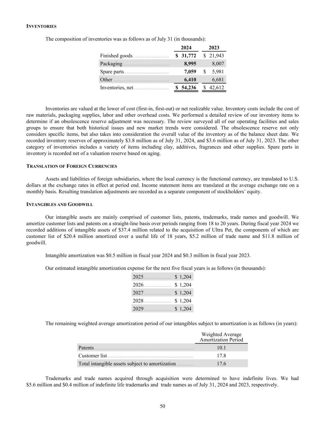 INVENTORIES The composition of inventories was as follows as of July 31 (in thousands): 2024 2023 Finished goods ........................... $ 31,772 $ 21,943 Packaging ................................... 8,995 8,007 Spare parts .................................. 7,059 $ 5,981 Other .......................................... 6,410 6,681 Inventories, net ........................... $ 54,236 $ 42,612 Inventories are valued at the lower of cost (first-in, first-out) or net realizable value. Inventory costs include the cost of raw materials, packaging supplies, labor and other overhead costs. We performed a detailed review of our inventory items to determine if an obsolescence reserve adjustment was necessary. The review surveyed all of our operating facilities and sales groups to ensure that both historical issues and new market trends were considered. The obsolescence reserve not only considers specific items, but also takes into consideration the overall value of the inventory as of the balance sheet date. We recorded inventory reserves of approximately $3.8 million as of July 31, 2024, and $3.6 million as of July 31, 2023. The other category of inventories includes a variety of items including clay, additives, fragrances and other supplies. Spare parts in inventory is recorded net of a valuation reserve based on aging. TRANSLATION OF FOREIGN CURRENCIES Assets and liabilities of foreign subsidiaries, where the local currency is the functional currency, are translated to U.S. dollars at the exchange rates in effect at period end. Income statement items are translated at the average exchange rate on a monthly basis. Resulting translation adjustments are recorded as a separate component of stockholders’ equity. INTANGIBLES AND GOODWILL Our intangible assets are mainly comprised of customer lists, patents, trademarks, trade names and goodwill. We amortize customer lists and patents on a straight-line basis over periods ranging from 18 to 20 years. During fiscal year 2024 we recorded additions of intangible assets of $37.4 million related to the acquisition of Ultra Pet, the components of which are customer list of $20.4 million amortized over a useful life of 18 years, $5.2 million of trade name and $11.8 million of goodwill. Intangible amortization was $0.5 million in fiscal year 2024 and $0.3 million in fiscal year 2023. Our estimated intangible amortization expense for the next five fiscal years is as follows (in thousands): 2025 ..................... $ 1,204 2026 ..................... $ 1,204 2027 ..................... $ 1,204 2028 ..................... $ 1,204 2029 ..................... $ 1,204 The remaining weighted average amortization period of our intangibles subject to amortization is as follows (in years): Weighted Average Amortization Period Patents ........................................................................... 10.1 Customer list ................................................................. 17.8 Total intangible assets subject to amortization ............. 17.6 Trademarks and trade names acquired through acquisition were determined to have indefinite lives. We had $5.6 million and $0.4 million of indefinite life trademarks and trade names as of July 31, 2024 and 2023, respectively. 50
