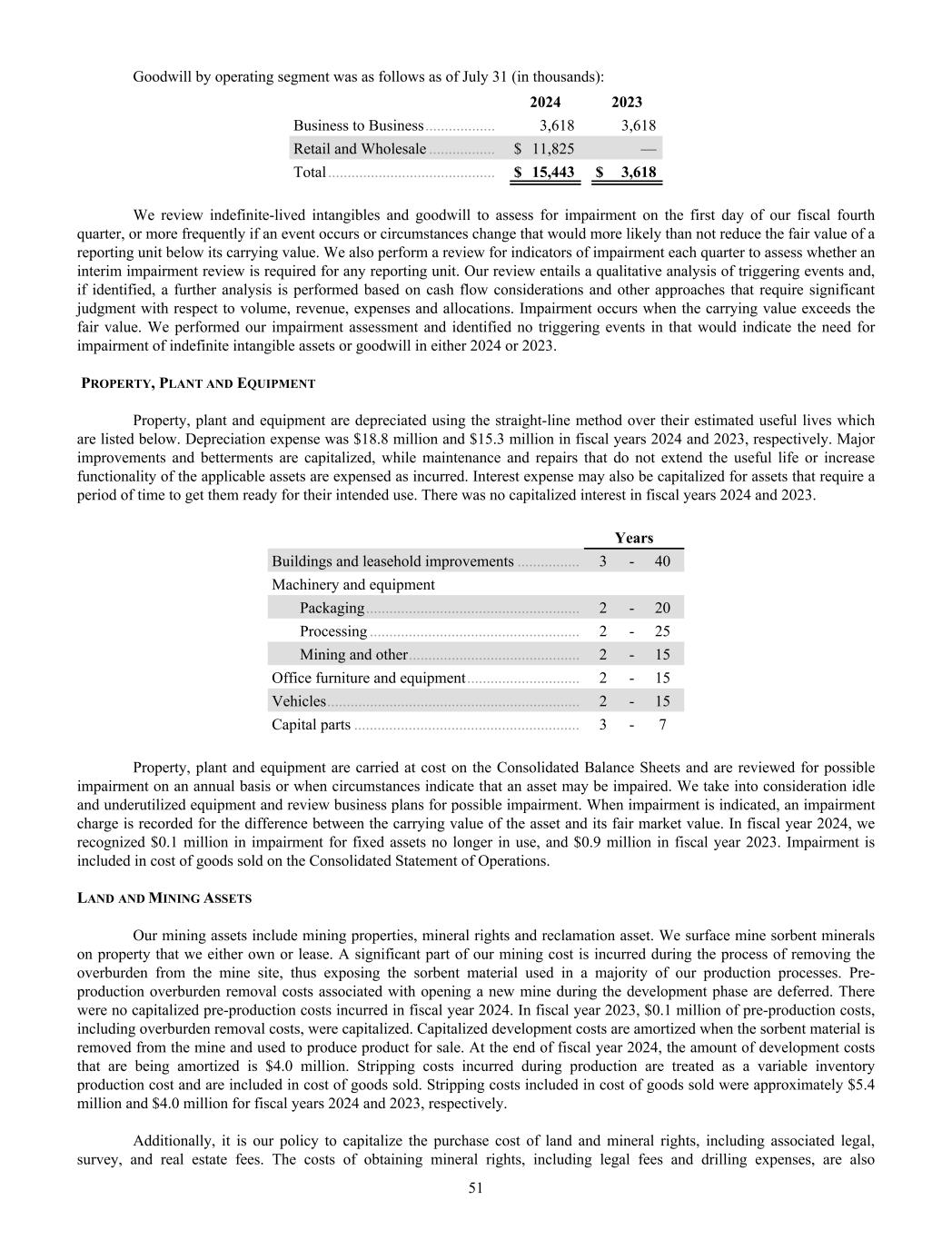 Goodwill by operating segment was as follows as of July 31 (in thousands): 2024 2023 Business to Business .................. 3,618 3,618 Retail and Wholesale ................. $ 11,825 — Total ........................................... $ 15,443 $ 3,618 We review indefinite-lived intangibles and goodwill to assess for impairment on the first day of our fiscal fourth quarter, or more frequently if an event occurs or circumstances change that would more likely than not reduce the fair value of a reporting unit below its carrying value. We also perform a review for indicators of impairment each quarter to assess whether an interim impairment review is required for any reporting unit. Our review entails a qualitative analysis of triggering events and, if identified, a further analysis is performed based on cash flow considerations and other approaches that require significant judgment with respect to volume, revenue, expenses and allocations. Impairment occurs when the carrying value exceeds the fair value. We performed our impairment assessment and identified no triggering events in that would indicate the need for impairment of indefinite intangible assets or goodwill in either 2024 or 2023. PROPERTY, PLANT AND EQUIPMENT Property, plant and equipment are depreciated using the straight-line method over their estimated useful lives which are listed below. Depreciation expense was $18.8 million and $15.3 million in fiscal years 2024 and 2023, respectively. Major improvements and betterments are capitalized, while maintenance and repairs that do not extend the useful life or increase functionality of the applicable assets are expensed as incurred. Interest expense may also be capitalized for assets that require a period of time to get them ready for their intended use. There was no capitalized interest in fiscal years 2024 and 2023. Years Buildings and leasehold improvements ................ 3 - 40 Machinery and equipment Packaging ....................................................... 2 - 20 Processing ...................................................... 2 - 25 Mining and other ............................................ 2 - 15 Office furniture and equipment ............................. 2 - 15 Vehicles ................................................................. 2 - 15 Capital parts .......................................................... 3 - 7 Property, plant and equipment are carried at cost on the Consolidated Balance Sheets and are reviewed for possible impairment on an annual basis or when circumstances indicate that an asset may be impaired. We take into consideration idle and underutilized equipment and review business plans for possible impairment. When impairment is indicated, an impairment charge is recorded for the difference between the carrying value of the asset and its fair market value. In fiscal year 2024, we recognized $0.1 million in impairment for fixed assets no longer in use, and $0.9 million in fiscal year 2023. Impairment is included in cost of goods sold on the Consolidated Statement of Operations. LAND AND MINING ASSETS Our mining assets include mining properties, mineral rights and reclamation asset. We surface mine sorbent minerals on property that we either own or lease. A significant part of our mining cost is incurred during the process of removing the overburden from the mine site, thus exposing the sorbent material used in a majority of our production processes. Pre- production overburden removal costs associated with opening a new mine during the development phase are deferred. There were no capitalized pre-production costs incurred in fiscal year 2024. In fiscal year 2023, $0.1 million of pre-production costs, including overburden removal costs, were capitalized. Capitalized development costs are amortized when the sorbent material is removed from the mine and used to produce product for sale. At the end of fiscal year 2024, the amount of development costs that are being amortized is $4.0 million. Stripping costs incurred during production are treated as a variable inventory production cost and are included in cost of goods sold. Stripping costs included in cost of goods sold were approximately $5.4 million and $4.0 million for fiscal years 2024 and 2023, respectively. Additionally, it is our policy to capitalize the purchase cost of land and mineral rights, including associated legal, survey, and real estate fees. The costs of obtaining mineral rights, including legal fees and drilling expenses, are also 51