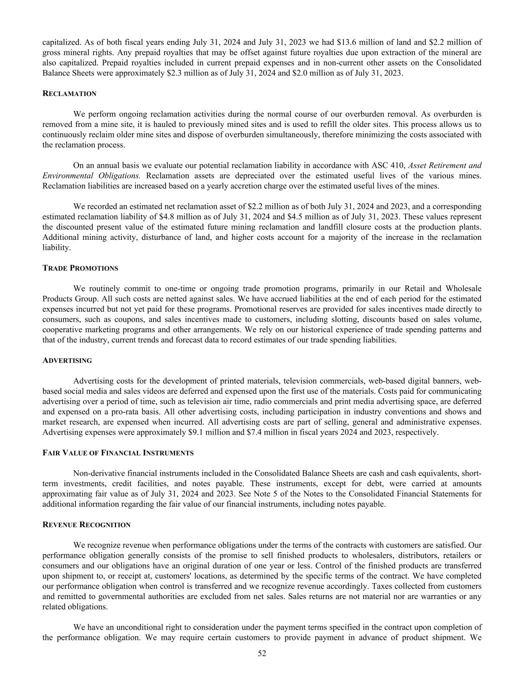 capitalized. As of both fiscal years ending July 31, 2024 and July 31, 2023 we had $13.6 million of land and $2.2 million of gross mineral rights. Any prepaid royalties that may be offset against future royalties due upon extraction of the mineral are also capitalized. Prepaid royalties included in current prepaid expenses and in non-current other assets on the Consolidated Balance Sheets were approximately $2.3 million as of July 31, 2024 and $2.0 million as of July 31, 2023. RECLAMATION We perform ongoing reclamation activities during the normal course of our overburden removal. As overburden is removed from a mine site, it is hauled to previously mined sites and is used to refill the older sites. This process allows us to continuously reclaim older mine sites and dispose of overburden simultaneously, therefore minimizing the costs associated with the reclamation process. On an annual basis we evaluate our potential reclamation liability in accordance with ASC 410, Asset Retirement and Environmental Obligations. Reclamation assets are depreciated over the estimated useful lives of the various mines. Reclamation liabilities are increased based on a yearly accretion charge over the estimated useful lives of the mines. We recorded an estimated net reclamation asset of $2.2 million as of both July 31, 2024 and 2023, and a corresponding estimated reclamation liability of $4.8 million as of July 31, 2024 and $4.5 million as of July 31, 2023. These values represent the discounted present value of the estimated future mining reclamation and landfill closure costs at the production plants. Additional mining activity, disturbance of land, and higher costs account for a majority of the increase in the reclamation liability. TRADE PROMOTIONS We routinely commit to one-time or ongoing trade promotion programs, primarily in our Retail and Wholesale Products Group. All such costs are netted against sales. We have accrued liabilities at the end of each period for the estimated expenses incurred but not yet paid for these programs. Promotional reserves are provided for sales incentives made directly to consumers, such as coupons, and sales incentives made to customers, including slotting, discounts based on sales volume, cooperative marketing programs and other arrangements. We rely on our historical experience of trade spending patterns and that of the industry, current trends and forecast data to record estimates of our trade spending liabilities. ADVERTISING Advertising costs for the development of printed materials, television commercials, web-based digital banners, web- based social media and sales videos are deferred and expensed upon the first use of the materials. Costs paid for communicating advertising over a period of time, such as television air time, radio commercials and print media advertising space, are deferred and expensed on a pro-rata basis. All other advertising costs, including participation in industry conventions and shows and market research, are expensed when incurred. All advertising costs are part of selling, general and administrative expenses. Advertising expenses were approximately $9.1 million and $7.4 million in fiscal years 2024 and 2023, respectively. FAIR VALUE OF FINANCIAL INSTRUMENTS Non-derivative financial instruments included in the Consolidated Balance Sheets are cash and cash equivalents, short- term investments, credit facilities, and notes payable. These instruments, except for debt, were carried at amounts approximating fair value as of July 31, 2024 and 2023. See Note 5 of the Notes to the Consolidated Financial Statements for additional information regarding the fair value of our financial instruments, including notes payable. REVENUE RECOGNITION We recognize revenue when performance obligations under the terms of the contracts with customers are satisfied. Our performance obligation generally consists of the promise to sell finished products to wholesalers, distributors, retailers or consumers and our obligations have an original duration of one year or less. Control of the finished products are transferred upon shipment to, or receipt at, customers' locations, as determined by the specific terms of the contract. We have completed our performance obligation when control is transferred and we recognize revenue accordingly. Taxes collected from customers and remitted to governmental authorities are excluded from net sales. Sales returns are not material nor are warranties or any related obligations. We have an unconditional right to consideration under the payment terms specified in the contract upon completion of the performance obligation. We may require certain customers to provide payment in advance of product shipment. We 52