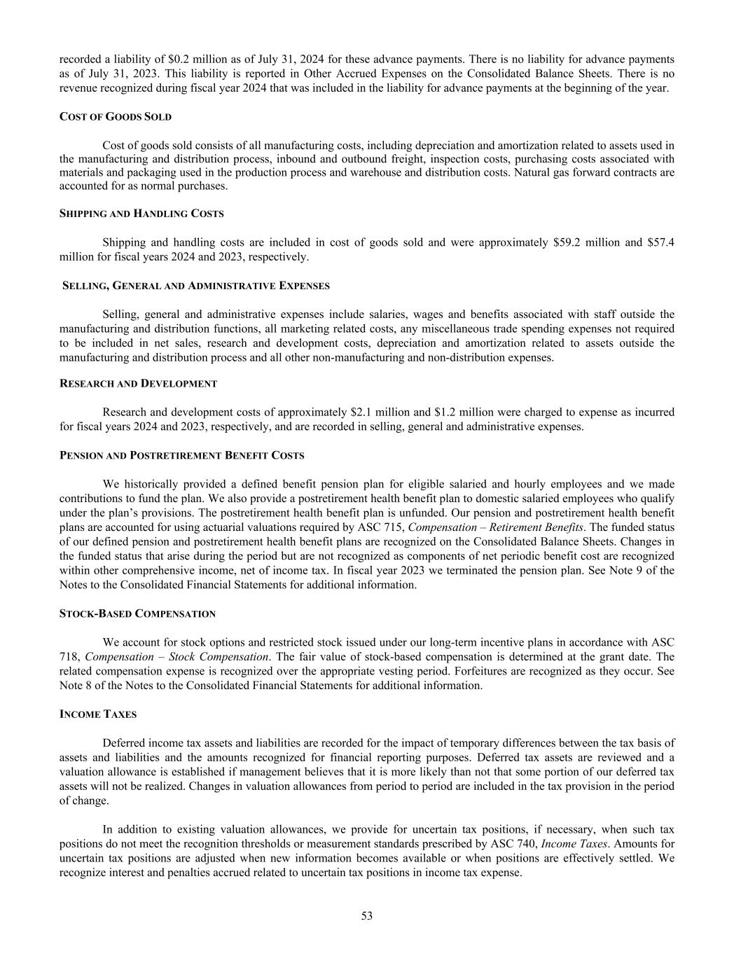 recorded a liability of $0.2 million as of July 31, 2024 for these advance payments. There is no liability for advance payments as of July 31, 2023. This liability is reported in Other Accrued Expenses on the Consolidated Balance Sheets. There is no revenue recognized during fiscal year 2024 that was included in the liability for advance payments at the beginning of the year. COST OF GOODS SOLD Cost of goods sold consists of all manufacturing costs, including depreciation and amortization related to assets used in the manufacturing and distribution process, inbound and outbound freight, inspection costs, purchasing costs associated with materials and packaging used in the production process and warehouse and distribution costs. Natural gas forward contracts are accounted for as normal purchases. SHIPPING AND HANDLING COSTS Shipping and handling costs are included in cost of goods sold and were approximately $59.2 million and $57.4 million for fiscal years 2024 and 2023, respectively. SELLING, GENERAL AND ADMINISTRATIVE EXPENSES Selling, general and administrative expenses include salaries, wages and benefits associated with staff outside the manufacturing and distribution functions, all marketing related costs, any miscellaneous trade spending expenses not required to be included in net sales, research and development costs, depreciation and amortization related to assets outside the manufacturing and distribution process and all other non-manufacturing and non-distribution expenses. RESEARCH AND DEVELOPMENT Research and development costs of approximately $2.1 million and $1.2 million were charged to expense as incurred for fiscal years 2024 and 2023, respectively, and are recorded in selling, general and administrative expenses. PENSION AND POSTRETIREMENT BENEFIT COSTS We historically provided a defined benefit pension plan for eligible salaried and hourly employees and we made contributions to fund the plan. We also provide a postretirement health benefit plan to domestic salaried employees who qualify under the plan’s provisions. The postretirement health benefit plan is unfunded. Our pension and postretirement health benefit plans are accounted for using actuarial valuations required by ASC 715, Compensation – Retirement Benefits. The funded status of our defined pension and postretirement health benefit plans are recognized on the Consolidated Balance Sheets. Changes in the funded status that arise during the period but are not recognized as components of net periodic benefit cost are recognized within other comprehensive income, net of income tax. In fiscal year 2023 we terminated the pension plan. See Note 9 of the Notes to the Consolidated Financial Statements for additional information. STOCK-BASED COMPENSATION We account for stock options and restricted stock issued under our long-term incentive plans in accordance with ASC 718, Compensation – Stock Compensation. The fair value of stock-based compensation is determined at the grant date. The related compensation expense is recognized over the appropriate vesting period. Forfeitures are recognized as they occur. See Note 8 of the Notes to the Consolidated Financial Statements for additional information. INCOME TAXES Deferred income tax assets and liabilities are recorded for the impact of temporary differences between the tax basis of assets and liabilities and the amounts recognized for financial reporting purposes. Deferred tax assets are reviewed and a valuation allowance is established if management believes that it is more likely than not that some portion of our deferred tax assets will not be realized. Changes in valuation allowances from period to period are included in the tax provision in the period of change. In addition to existing valuation allowances, we provide for uncertain tax positions, if necessary, when such tax positions do not meet the recognition thresholds or measurement standards prescribed by ASC 740, Income Taxes. Amounts for uncertain tax positions are adjusted when new information becomes available or when positions are effectively settled. We recognize interest and penalties accrued related to uncertain tax positions in income tax expense. 53