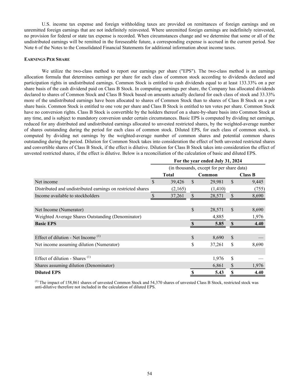 U.S. income tax expense and foreign withholding taxes are provided on remittances of foreign earnings and on unremitted foreign earnings that are not indefinitely reinvested. Where unremitted foreign earnings are indefinitely reinvested, no provision for federal or state tax expense is recorded. When circumstances change and we determine that some or all of the undistributed earnings will be remitted in the foreseeable future, a corresponding expense is accrued in the current period. See Note 6 of the Notes to the Consolidated Financial Statements for additional information about income taxes. EARNINGS PER SHARE We utilize the two-class method to report our earnings per share ("EPS"). The two-class method is an earnings allocation formula that determines earnings per share for each class of common stock according to dividends declared and participation rights in undistributed earnings. Common Stock is entitled to cash dividends equal to at least 133.33% on a per share basis of the cash dividend paid on Class B Stock. In computing earnings per share, the Company has allocated dividends declared to shares of Common Stock and Class B Stock based on amounts actually declared for each class of stock and 33.33% more of the undistributed earnings have been allocated to shares of Common Stock than to shares of Class B Stock on a per share basis. Common Stock is entitled to one vote per share and Class B Stock is entitled to ten votes per share. Common Stock have no conversion rights. Class B Stock is convertible by the holders thereof on a share-by-share basis into Common Stock at any time, and is subject to mandatory conversion under certain circumstances. Basic EPS is computed by dividing net earnings, reduced for any distributed and undistributed earnings allocated to unvested restricted shares, by the weighted-average number of shares outstanding during the period for each class of common stock. Diluted EPS, for each class of common stock, is computed by dividing net earnings by the weighted-average number of common shares and potential common shares outstanding during the period. Dilution for Common Stock takes into consideration the effect of both unvested restricted shares and convertible shares of Class B Stock, if the effect is dilutive. Dilution for Class B Stock takes into consideration the effect of unvested restricted shares, if the effect is dilutive. Below is a reconciliation of the calculation of basic and diluted EPS. For the year ended July 31, 2024 (in thousands, except for per share data) Total Common Class B Net income $ 39,426 $ 29,981 $ 9,445 Distributed and undistributed earnings on restricted shares (2,165) (1,410) (755) Income available to stockholders $ 37,261 $ 28,571 $ 8,690 Net Income (Numerator) $ 28,571 $ 8,690 Weighted Average Shares Outstanding (Denominator) 4,885 1,976 Basic EPS $ 5.85 $ 4.40 Effect of dilution - Net Income (1) $ 8,690 $ — Net income assuming dilution (Numerator) $ 37,261 $ 8,690 Effect of dilution - Shares (1) 1,976 $ — Shares assuming dilution (Denominator) 6,861 $ 1,976 Diluted EPS $ 5.43 $ 4.40 (1) The impact of 158,861 shares of unvested Common Stock and 54,370 shares of unvested Class B Stock, restricted stock was anti-dilutive therefore not included in the calculation of diluted EPS. 54
