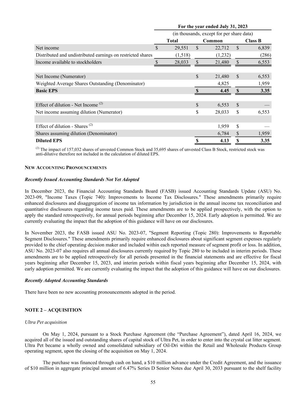 For the year ended July 31, 2023 (in thousands, except for per share data) Total Common Class B Net income $ 29,551 $ 22,712 $ 6,839 Distributed and undistributed earnings on restricted shares (1,518) (1,232) (286) Income available to stockholders $ 28,033 $ 21,480 $ 6,553 Net Income (Numerator) $ 21,480 $ 6,553 Weighted Average Shares Outstanding (Denominator) 4,825 1,959 Basic EPS $ 4.45 $ 3.35 Effect of dilution - Net Income (2) $ 6,553 $ — Net income assuming dilution (Numerator) $ 28,033 $ 6,553 Effect of dilution - Shares (2) 1,959 $ — Shares assuming dilution (Denominator) 6,784 $ 1,959 Diluted EPS $ 4.13 $ 3.35 (2) The impact of 157,032 shares of unvested Common Stock and 35,695 shares of unvested Class B Stock, restricted stock was anti-dilutive therefore not included in the calculation of diluted EPS. NEW ACCOUNTING PRONOUNCEMENTS Recently Issued Accounting Standards Not Yet Adopted In December 2023, the Financial Accounting Standards Board (FASB) issued Accounting Standards Update (ASU) No. 2023-09, "Income Taxes (Topic 740): Improvements to Income Tax Disclosures." These amendments primarily require enhanced disclosures and disaggregation of income tax information by jurisdiction in the annual income tax reconciliation and quantitative disclosures regarding income taxes paid. These amendments are to be applied prospectively, with the option to apply the standard retrospectively, for annual periods beginning after December 15, 2024. Early adoption is permitted. We are currently evaluating the impact that the adoption of this guidance will have on our disclosures. In November 2023, the FASB issued ASU No. 2023-07, "Segment Reporting (Topic 280): Improvements to Reportable Segment Disclosures." These amendments primarily require enhanced disclosures about significant segment expenses regularly provided to the chief operating decision maker and included within each reported measure of segment profit or loss. In addition, ASU No. 2023-07 also requires all annual disclosures currently required by Topic 280 to be included in interim periods. These amendments are to be applied retrospectively for all periods presented in the financial statements and are effective for fiscal years beginning after December 15, 2023, and interim periods within fiscal years beginning after December 15, 2024, with early adoption permitted. We are currently evaluating the impact that the adoption of this guidance will have on our disclosures. Recently Adopted Accounting Standards There have been no new accounting pronouncements adopted in the period. NOTE 2 – ACQUISITION Ultra Pet acquisition On May 1, 2024, pursuant to a Stock Purchase Agreement (the “Purchase Agreement”), dated April 16, 2024, we acquired all of the issued and outstanding shares of capital stock of Ultra Pet, in order to enter into the crystal cat litter segment. Ultra Pet became a wholly owned and consolidated subsidiary of Oil-Dri within the Retail and Wholesale Products Group operating segment, upon the closing of the acquisition on May 1, 2024. The purchase was financed through cash on hand, a $10 million advance under the Credit Agreement, and the issuance of $10 million in aggregate principal amount of 6.47% Series D Senior Notes due April 30, 2033 pursuant to the shelf facility 55