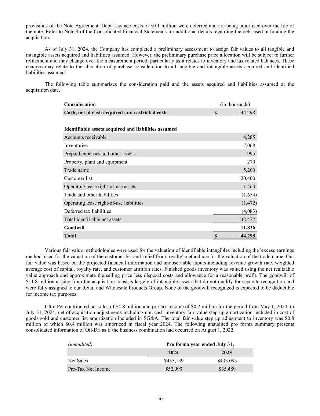 provisions of the Note Agreement. Debt issuance costs of $0.1 million were deferred and are being amortized over the life of the note. Refer to Note 4 of the Consolidated Financial Statements for additional details regarding the debt used in funding the acquisition. As of July 31, 2024, the Company has completed a preliminary assessment to assign fair values to all tangible and intangible assets acquired and liabilities assumed. However, the preliminary purchase price allocation will be subject to further refinement and may change over the measurement period, particularly as it relates to inventory and tax related balances. These changes may relate to the allocation of purchase consideration to all tangible and intangible assets acquired and identified liabilities assumed. The following table summarizes the consideration paid and the assets acquired and liabilities assumed at the acquisition date. Consideration (in thousands) Cash, net of cash acquired and restricted cash $ 44,298 Identifiable assets acquired and liabilities assumed Accounts receivable 4,285 Inventories 7,068 Prepaid expenses and other assets 995 Property, plant and equipment 270 Trade name 5,200 Customer list 20,400 Operating lease right-of-use assets 1,463 Trade and other liabilities (1,654) Operating lease right-of-use liabilities (1,472) Deferred tax liabilities (4,083) Total identifiable net assets 32,472 Goodwill 11,826 Total $ 44,298 Various fair value methodologies were used for the valuation of identifiable intangibles including the 'excess earnings method' used for the valuation of the customer list and 'relief from royalty' method use for the valuation of the trade name. Our fair value was based on the projected financial information and unobservable inputs including revenue growth rate, weighted average cost of capital, royalty rate, and customer attrition rates. Finished goods inventory was valued using the net realizable value approach and approximate the selling price less disposal costs and allowance for a reasonable profit. The goodwill of $11.8 million arising from the acquisition consists largely of intangible assets that do not qualify for separate recognition and were fully assigned to our Retail and Wholesale Products Group. None of the goodwill recognized is expected to be deductible for income tax purposes. Ultra Pet contributed net sales of $4.8 million and pre-tax income of $0.2 million for the period from May 1, 2024, to July 31, 2024, net of acquisition adjustments including non-cash inventory fair value step up amortization included in cost of goods sold and customer list amortization included in SG&A. The total fair value step up adjustment to inventory was $0.8 million of which $0.4 million was amortized in fiscal year 2024. The following unaudited pro forma summary presents consolidated information of Oil-Dri as if the business combination had occurred on August 1, 2022. (unaudited) Pro forma year ended July 31, 2024 2023 Net Sales $455,139 $435,093 Pre-Tax Net Income $52,999 $35,489 56