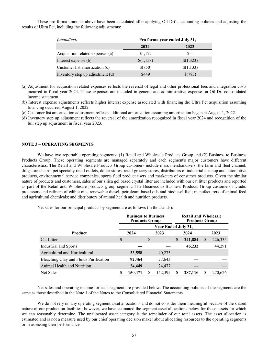 These pro forma amounts above have been calculated after applying Oil-Dri’s accounting policies and adjusting the results of Ultra Pet, including the following adjustments: (unaudited) Pro forma year ended July 31, 2024 2023 Acquisition related expenses (a) $1,172 $— Interest expense (b) $(1,158) $(1,323) Customer list amortization (c) $(850) $(1,133) Inventory step up adjustment (d) $449 $(783) (a) Adjustment for acquisition related expenses reflects the reversal of legal and other professional fees and integration costs incurred in fiscal year 2024. These expenses are included in general and administrative expense on Oil-Dri consolidated income statement. (b) Interest expense adjustments reflects higher interest expense associated with financing the Ultra Pet acquisition assuming financing occurred August 1, 2022. (c) Customer list amortization adjustment reflects additional amortization assuming amortization began at August 1, 2022. (d) Inventory step up adjustment reflects the reversal of the amortization recognized in fiscal year 2024 and recognition of the full step up adjustment in fiscal year 2023. NOTE 3 – OPERATING SEGMENTS We have two reportable operating segments: (1) Retail and Wholesale Products Group and (2) Business to Business Products Group. These operating segments are managed separately and each segment's major customers have different characteristics. The Retail and Wholesale Products Group customers include mass merchandisers, the farm and fleet channel, drugstore chains, pet specialty retail outlets, dollar stores, retail grocery stores, distributors of industrial cleanup and automotive products, environmental service companies, sports field product users and marketers of consumer products. Given the similar nature of products and customers, sales of our silica gel based crystal litter are included with our cat litter products and reported as part of the Retail and Wholesale products group segment. The Business to Business Products Group customers include: processors and refiners of edible oils, renewable diesel, petroleum-based oils and biodiesel fuel; manufacturers of animal feed and agricultural chemicals; and distributors of animal health and nutrition products. Net sales for our principal products by segment are as follows (in thousands): Business to Business Products Group Retail and Wholesale Products Group Year Ended July 31, Product 2024 2023 2024 2023 Cat Litter $ — $ — $ 241,884 $ 226,335 Industrial and Sports — — 45,232 44,291 Agricultural and Horticultural 33,558 40,275 — — Bleaching Clay and Fluids Purification 92,464 77,643 — — Animal Health and Nutrition 24,449 24,477 — — Net Sales $ 150,471 $ 142,395 $ 287,116 $ 270,626 Net sales and operating income for each segment are provided below. The accounting policies of the segments are the same as those described in the Note 1 of the Notes to the Consolidated Financial Statements. We do not rely on any operating segment asset allocations and do not consider them meaningful because of the shared nature of our production facilities; however, we have estimated the segment asset allocations below for those assets for which we can reasonably determine. The unallocated asset category is the remainder of our total assets. The asset allocation is estimated and is not a measure used by our chief operating decision maker about allocating resources to the operating segments or in assessing their performance. 57