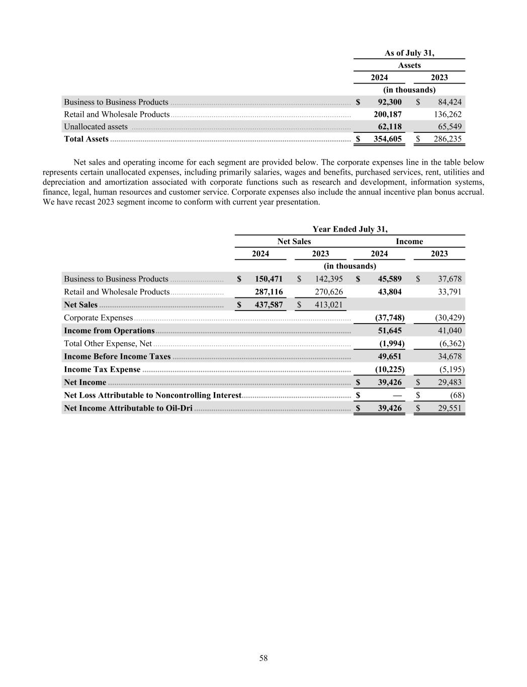 As of July 31, Assets 2024 2023 (in thousands) Business to Business Products .................................................................................... $ 92,300 $ 84,424 Retail and Wholesale Products .................................................................................... 200,187 136,262 Unallocated assets ...................................................................................................... 62,118 65,549 Total Assets ................................................................................................................ $ 354,605 $ 286,235 Net sales and operating income for each segment are provided below. The corporate expenses line in the table below represents certain unallocated expenses, including primarily salaries, wages and benefits, purchased services, rent, utilities and depreciation and amortization associated with corporate functions such as research and development, information systems, finance, legal, human resources and customer service. Corporate expenses also include the annual incentive plan bonus accrual. We have recast 2023 segment income to conform with current year presentation. Year Ended July 31, Net Sales Income 2024 2023 2024 2023 (in thousands) Business to Business Products ......................... $ 150,471 $ 142,395 $ 45,589 $ 37,678 Retail and Wholesale Products ......................... 287,116 270,626 43,804 33,791 Net Sales .......................................................... $ 437,587 $ 413,021 Corporate Expenses ..................................................................................................... (37,748) (30,429) Income from Operations ........................................................................................... 51,645 41,040 Total Other Expense, Net ............................................................................................ (1,994) (6,362) Income Before Income Taxes ................................................................................... 49,651 34,678 Income Tax Expense ................................................................................................. (10,225) (5,195) Net Income ................................................................................................................. $ 39,426 $ 29,483 Net Loss Attributable to Noncontrolling Interest ................................................... $ — $ (68) Net Income Attributable to Oil-Dri ......................................................................... $ 39,426 $ 29,551 58
