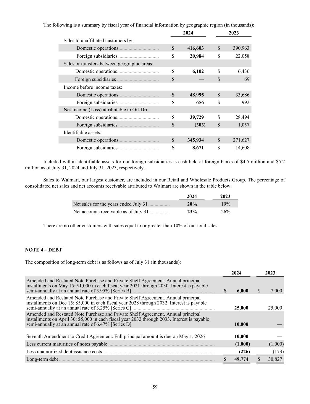 The following is a summary by fiscal year of financial information by geographic region (in thousands): 2024 2023 Sales to unaffiliated customers by: Domestic operations ................................ $ 416,603 $ 390,963 Foreign subsidiaries ................................ $ 20,984 $ 22,058 Sales or transfers between geographic areas: Domestic operations ................................. $ 6,102 $ 6,436 Foreign subsidiaries ................................. $ — $ 69 Income before income taxes: Domestic operations ................................ $ 48,995 $ 33,686 Foreign subsidiaries ................................ $ 656 $ 992 Net Income (Loss) attributable to Oil-Dri: Domestic operations ................................. $ 39,729 $ 28,494 Foreign subsidiaries ................................ $ (303) $ 1,057 Identifiable assets: Domestic operations ................................ $ 345,934 $ 271,627 Foreign subsidiaries ................................ $ 8,671 $ 14,608 Included within identifiable assets for our foreign subsidiaries is cash held at foreign banks of $4.5 million and $5.2 million as of July 31, 2024 and July 31, 2023, respectively. Sales to Walmart, our largest customer, are included in our Retail and Wholesale Products Group. The percentage of consolidated net sales and net accounts receivable attributed to Walmart are shown in the table below: 2024 2023 Net sales for the years ended July 31 ................. 20% 19% Net accounts receivable as of July 31 ................ 23% 26% There are no other customers with sales equal to or greater than 10% of our total sales. NOTE 4 – DEBT The composition of long-term debt is as follows as of July 31 (in thousands): 2024 2023 Amended and Restated Note Purchase and Private Shelf Agreement. Annual principal installments on May 15: $1,000 in each fiscal year 2021 through 2030. Interest is payable semi-annually at an annual rate of 3.95% [Series B] ................................................................. $ 6,000 $ 7,000 Amended and Restated Note Purchase and Private Shelf Agreement. Annual principal installments on Dec 15: $5,000 in each fiscal year 2028 through 2032. Interest is payable semi-annually at an annual rate of 3.25% [Series C] .................................................................. 25,000 25,000 Amended and Restated Note Purchase and Private Shelf Agreement. Annual principal installments on April 30: $5,000 in each fiscal year 2032 through 2033. Interest is payable semi-annually at an annual rate of 6.47% [Series D] 10,000 — Seventh Amendment to Credit Agreement. Full principal amount is due on May 1, 2026 10,000 — Less current maturities of notes payable .................................................................................... (1,000) (1,000) Less unamortized debt issuance costs ......................................................................................... (226) (173) Long-term debt ........................................................................................................................... $ 49,774 $ 30,827 59