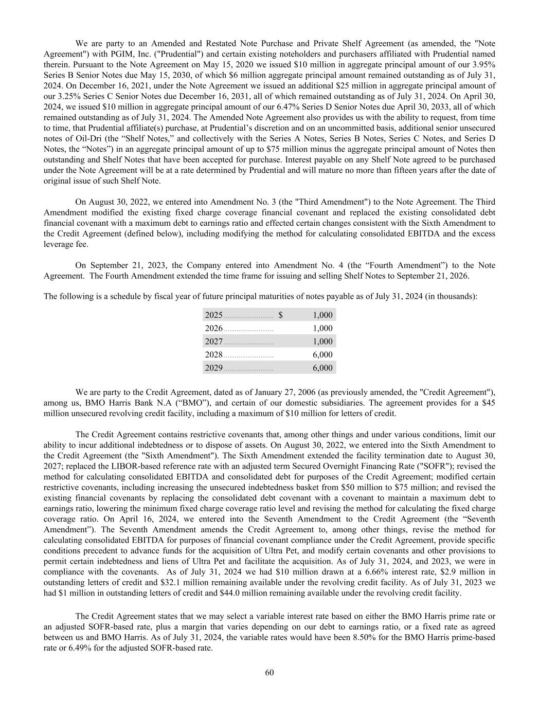 We are party to an Amended and Restated Note Purchase and Private Shelf Agreement (as amended, the "Note Agreement") with PGIM, Inc. ("Prudential") and certain existing noteholders and purchasers affiliated with Prudential named therein. Pursuant to the Note Agreement on May 15, 2020 we issued $10 million in aggregate principal amount of our 3.95% Series B Senior Notes due May 15, 2030, of which $6 million aggregate principal amount remained outstanding as of July 31, 2024. On December 16, 2021, under the Note Agreement we issued an additional $25 million in aggregate principal amount of our 3.25% Series C Senior Notes due December 16, 2031, all of which remained outstanding as of July 31, 2024. On April 30, 2024, we issued $10 million in aggregate principal amount of our 6.47% Series D Senior Notes due April 30, 2033, all of which remained outstanding as of July 31, 2024. The Amended Note Agreement also provides us with the ability to request, from time to time, that Prudential affiliate(s) purchase, at Prudential’s discretion and on an uncommitted basis, additional senior unsecured notes of Oil-Dri (the “Shelf Notes,” and collectively with the Series A Notes, Series B Notes, Series C Notes, and Series D Notes, the “Notes”) in an aggregate principal amount of up to $75 million minus the aggregate principal amount of Notes then outstanding and Shelf Notes that have been accepted for purchase. Interest payable on any Shelf Note agreed to be purchased under the Note Agreement will be at a rate determined by Prudential and will mature no more than fifteen years after the date of original issue of such Shelf Note. On August 30, 2022, we entered into Amendment No. 3 (the "Third Amendment") to the Note Agreement. The Third Amendment modified the existing fixed charge coverage financial covenant and replaced the existing consolidated debt financial covenant with a maximum debt to earnings ratio and effected certain changes consistent with the Sixth Amendment to the Credit Agreement (defined below), including modifying the method for calculating consolidated EBITDA and the excess leverage fee. On September 21, 2023, the Company entered into Amendment No. 4 (the “Fourth Amendment”) to the Note Agreement. The Fourth Amendment extended the time frame for issuing and selling Shelf Notes to September 21, 2026. The following is a schedule by fiscal year of future principal maturities of notes payable as of July 31, 2024 (in thousands): 2025 ....................... $ 1,000 2026 ....................... 1,000 2027 ....................... 1,000 2028 ....................... 6,000 2029 ....................... 6,000 We are party to the Credit Agreement, dated as of January 27, 2006 (as previously amended, the "Credit Agreement"), among us, BMO Harris Bank N.A (“BMO”), and certain of our domestic subsidiaries. The agreement provides for a $45 million unsecured revolving credit facility, including a maximum of $10 million for letters of credit. The Credit Agreement contains restrictive covenants that, among other things and under various conditions, limit our ability to incur additional indebtedness or to dispose of assets. On August 30, 2022, we entered into the Sixth Amendment to the Credit Agreement (the "Sixth Amendment"). The Sixth Amendment extended the facility termination date to August 30, 2027; replaced the LIBOR-based reference rate with an adjusted term Secured Overnight Financing Rate ("SOFR"); revised the method for calculating consolidated EBITDA and consolidated debt for purposes of the Credit Agreement; modified certain restrictive covenants, including increasing the unsecured indebtedness basket from $50 million to $75 million; and revised the existing financial covenants by replacing the consolidated debt covenant with a covenant to maintain a maximum debt to earnings ratio, lowering the minimum fixed charge coverage ratio level and revising the method for calculating the fixed charge coverage ratio. On April 16, 2024, we entered into the Seventh Amendment to the Credit Agreement (the “Seventh Amendment”). The Seventh Amendment amends the Credit Agreement to, among other things, revise the method for calculating consolidated EBITDA for purposes of financial covenant compliance under the Credit Agreement, provide specific conditions precedent to advance funds for the acquisition of Ultra Pet, and modify certain covenants and other provisions to permit certain indebtedness and liens of Ultra Pet and facilitate the acquisition. As of July 31, 2024, and 2023, we were in compliance with the covenants. As of July 31, 2024 we had $10 million drawn at a 6.66% interest rate, $2.9 million in outstanding letters of credit and $32.1 million remaining available under the revolving credit facility. As of July 31, 2023 we had $1 million in outstanding letters of credit and $44.0 million remaining available under the revolving credit facility. The Credit Agreement states that we may select a variable interest rate based on either the BMO Harris prime rate or an adjusted SOFR-based rate, plus a margin that varies depending on our debt to earnings ratio, or a fixed rate as agreed between us and BMO Harris. As of July 31, 2024, the variable rates would have been 8.50% for the BMO Harris prime-based rate or 6.49% for the adjusted SOFR-based rate. 60