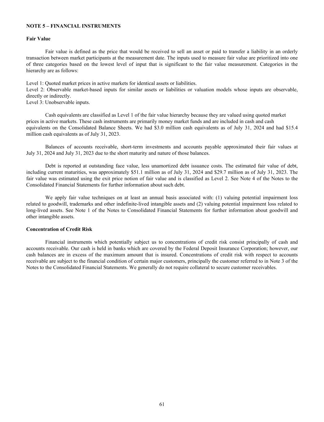 NOTE 5 – FINANCIAL INSTRUMENTS Fair Value Fair value is defined as the price that would be received to sell an asset or paid to transfer a liability in an orderly transaction between market participants at the measurement date. The inputs used to measure fair value are prioritized into one of three categories based on the lowest level of input that is significant to the fair value measurement. Categories in the hierarchy are as follows: Level 1: Quoted market prices in active markets for identical assets or liabilities. Level 2: Observable market-based inputs for similar assets or liabilities or valuation models whose inputs are observable, directly or indirectly. Level 3: Unobservable inputs. Cash equivalents are classified as Level 1 of the fair value hierarchy because they are valued using quoted market prices in active markets. These cash instruments are primarily money market funds and are included in cash and cash equivalents on the Consolidated Balance Sheets. We had $3.0 million cash equivalents as of July 31, 2024 and had $15.4 million cash equivalents as of July 31, 2023. Balances of accounts receivable, short-term investments and accounts payable approximated their fair values at July 31, 2024 and July 31, 2023 due to the short maturity and nature of those balances. Debt is reported at outstanding face value, less unamortized debt issuance costs. The estimated fair value of debt, including current maturities, was approximately $51.1 million as of July 31, 2024 and $29.7 million as of July 31, 2023. The fair value was estimated using the exit price notion of fair value and is classified as Level 2. See Note 4 of the Notes to the Consolidated Financial Statements for further information about such debt. We apply fair value techniques on at least an annual basis associated with: (1) valuing potential impairment loss related to goodwill, trademarks and other indefinite-lived intangible assets and (2) valuing potential impairment loss related to long-lived assets. See Note 1 of the Notes to Consolidated Financial Statements for further information about goodwill and other intangible assets. Concentration of Credit Risk Financial instruments which potentially subject us to concentrations of credit risk consist principally of cash and accounts receivable. Our cash is held in banks which are covered by the Federal Deposit Insurance Corporation; however, our cash balances are in excess of the maximum amount that is insured. Concentrations of credit risk with respect to accounts receivable are subject to the financial condition of certain major customers, principally the customer referred to in Note 3 of the Notes to the Consolidated Financial Statements. We generally do not require collateral to secure customer receivables. 61